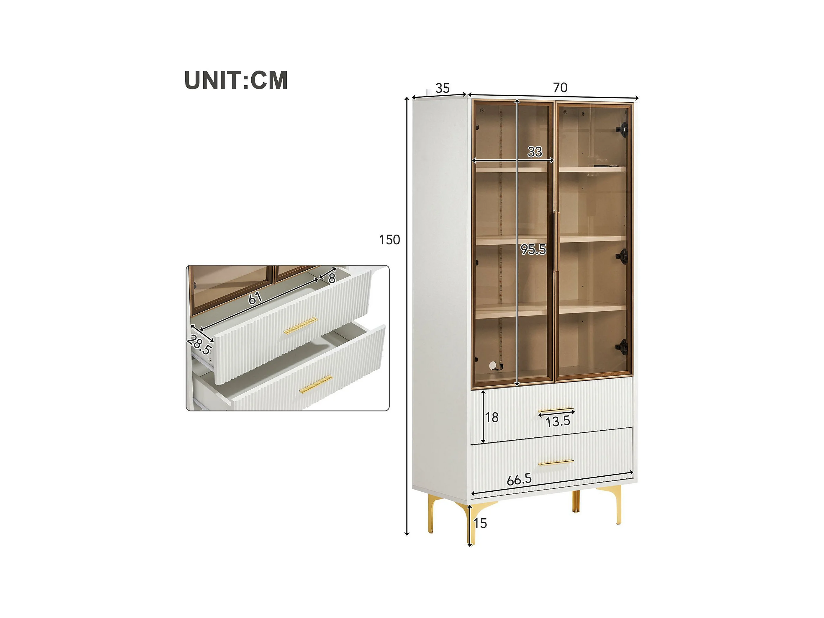 Moderne vitrinekast met LED-verlichting en verwijderbare planken - H 150 cm - 2 glazen deuren en 2 laden - Wit
