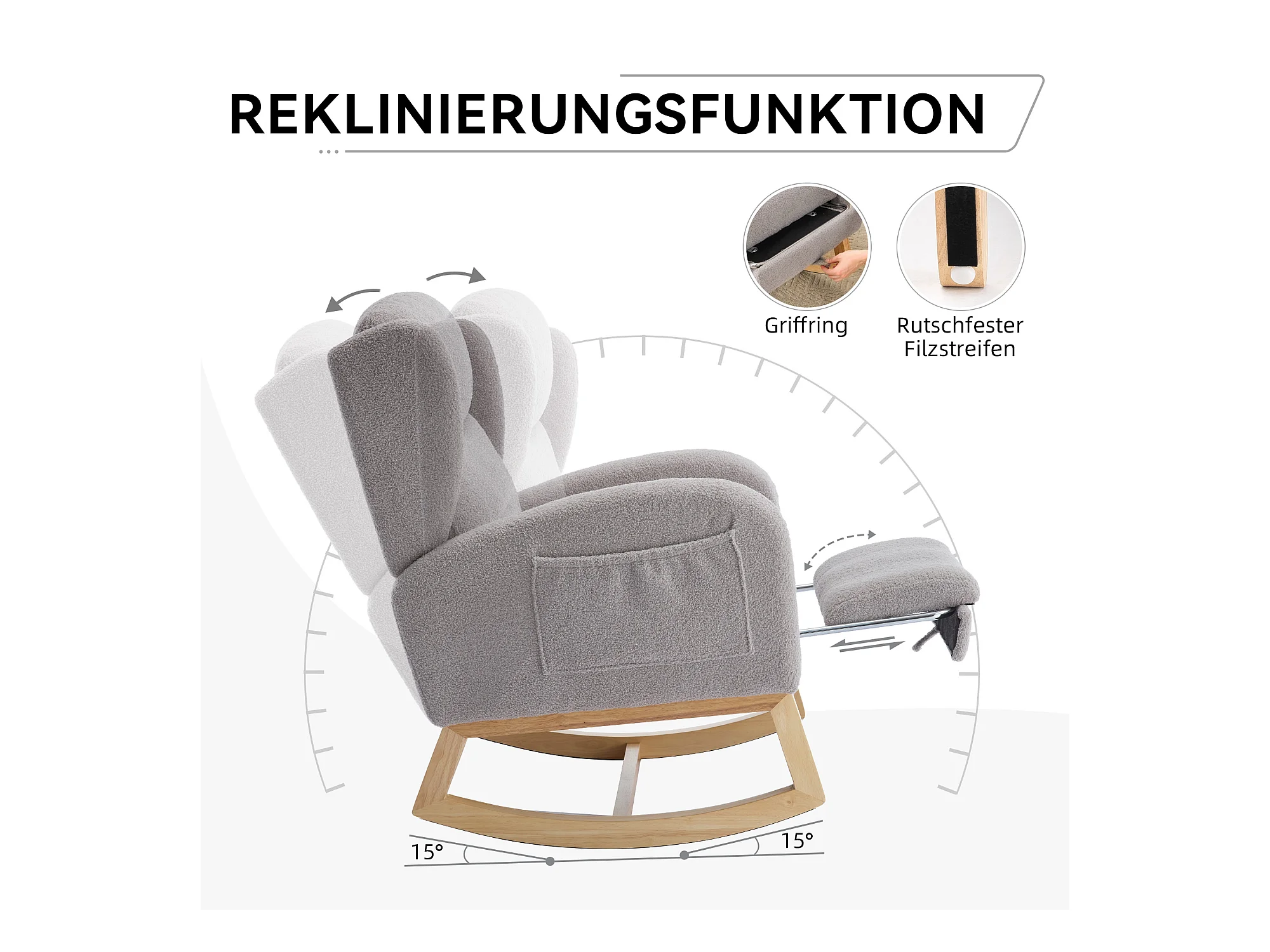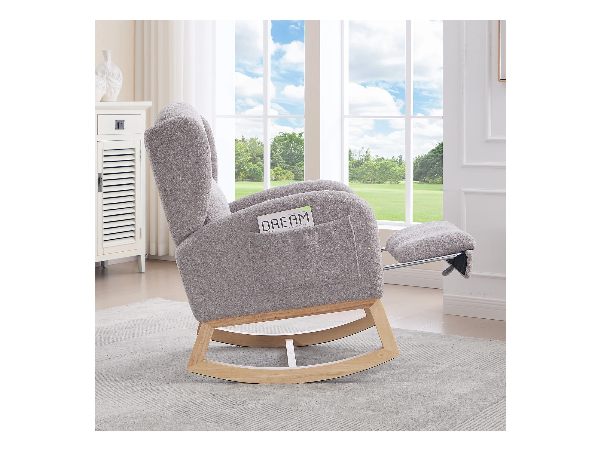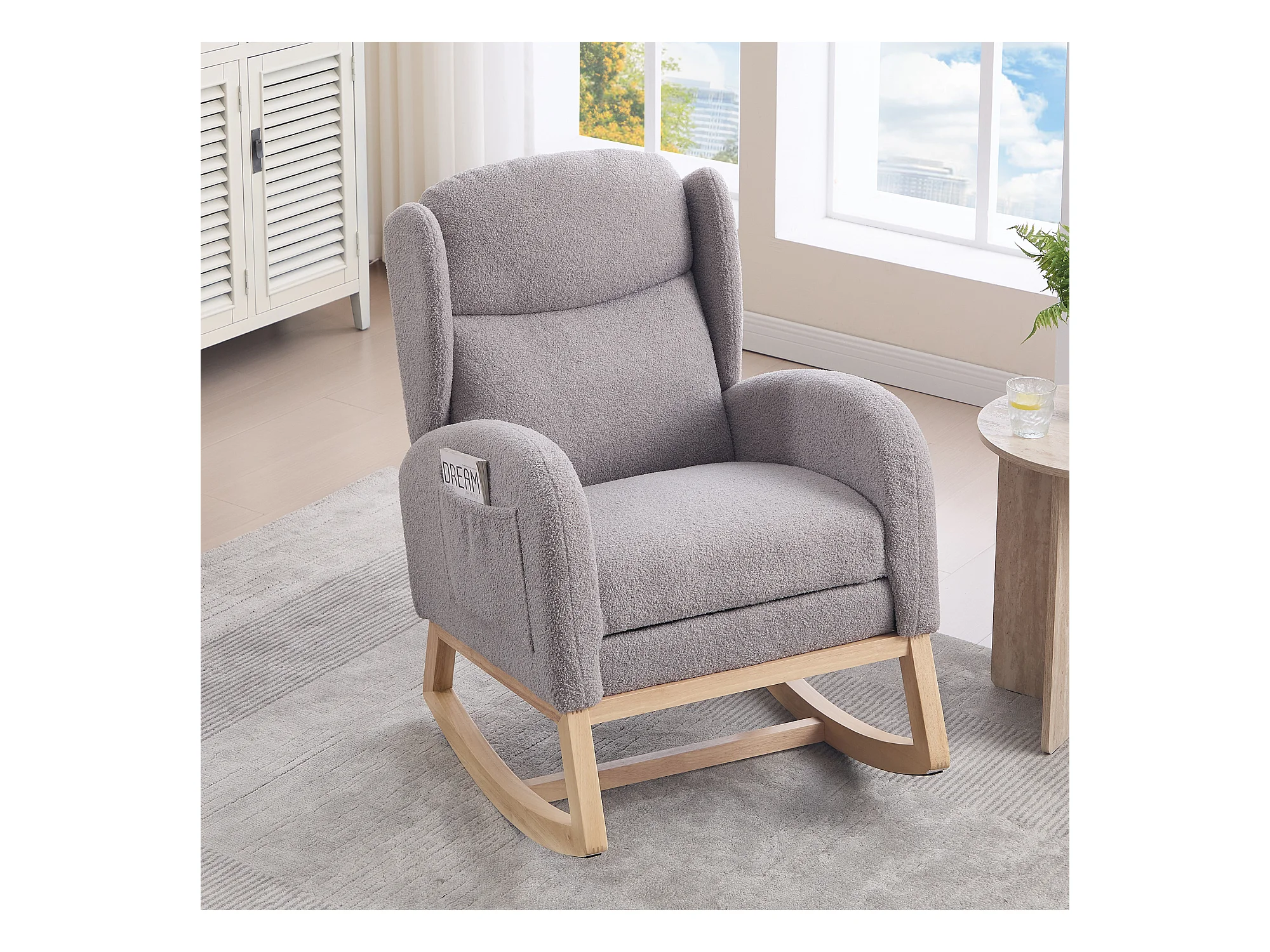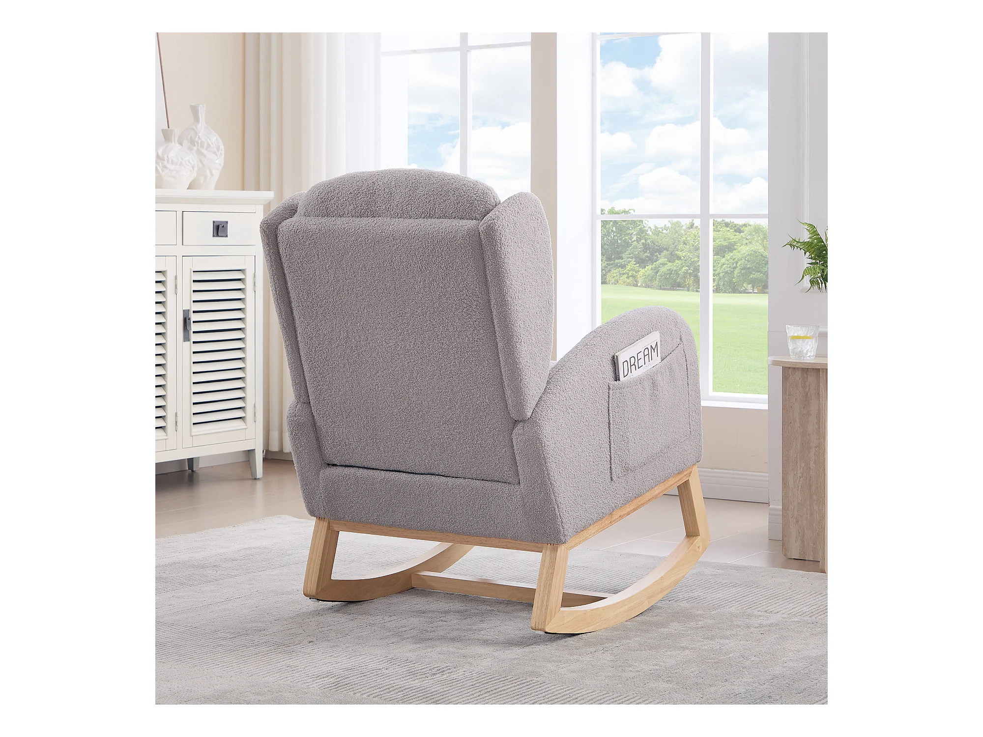 Lichtgrijze schommelstoel met zijvakken, houten frame, teddy fluwelen stof 88x71x104,5cm