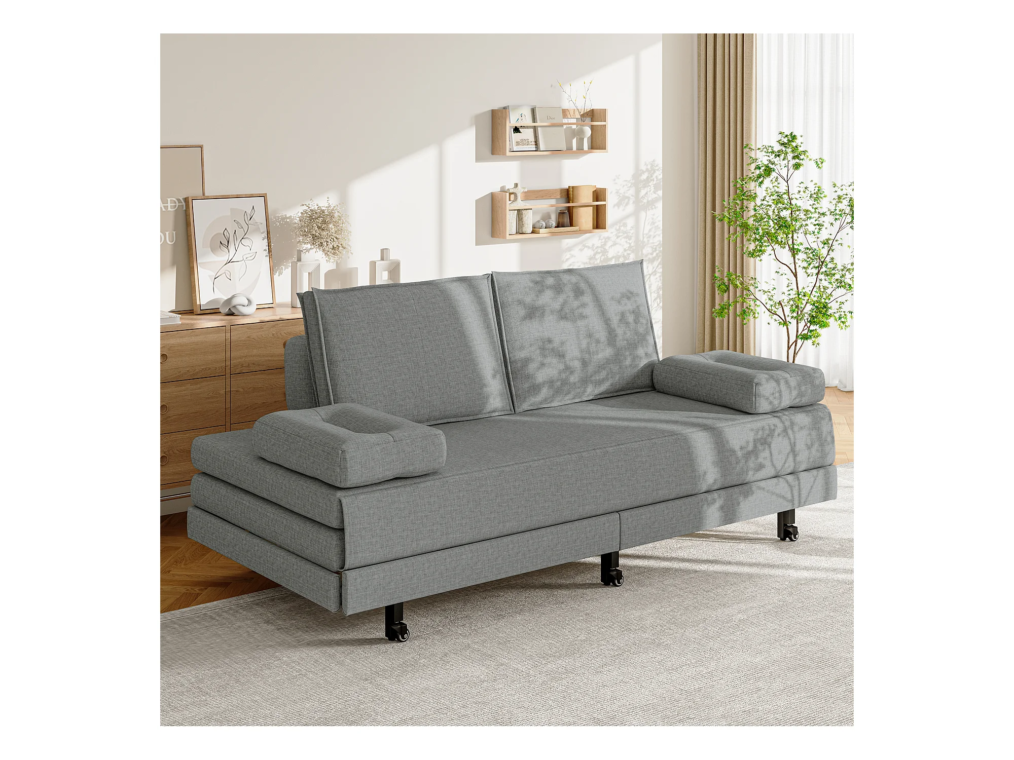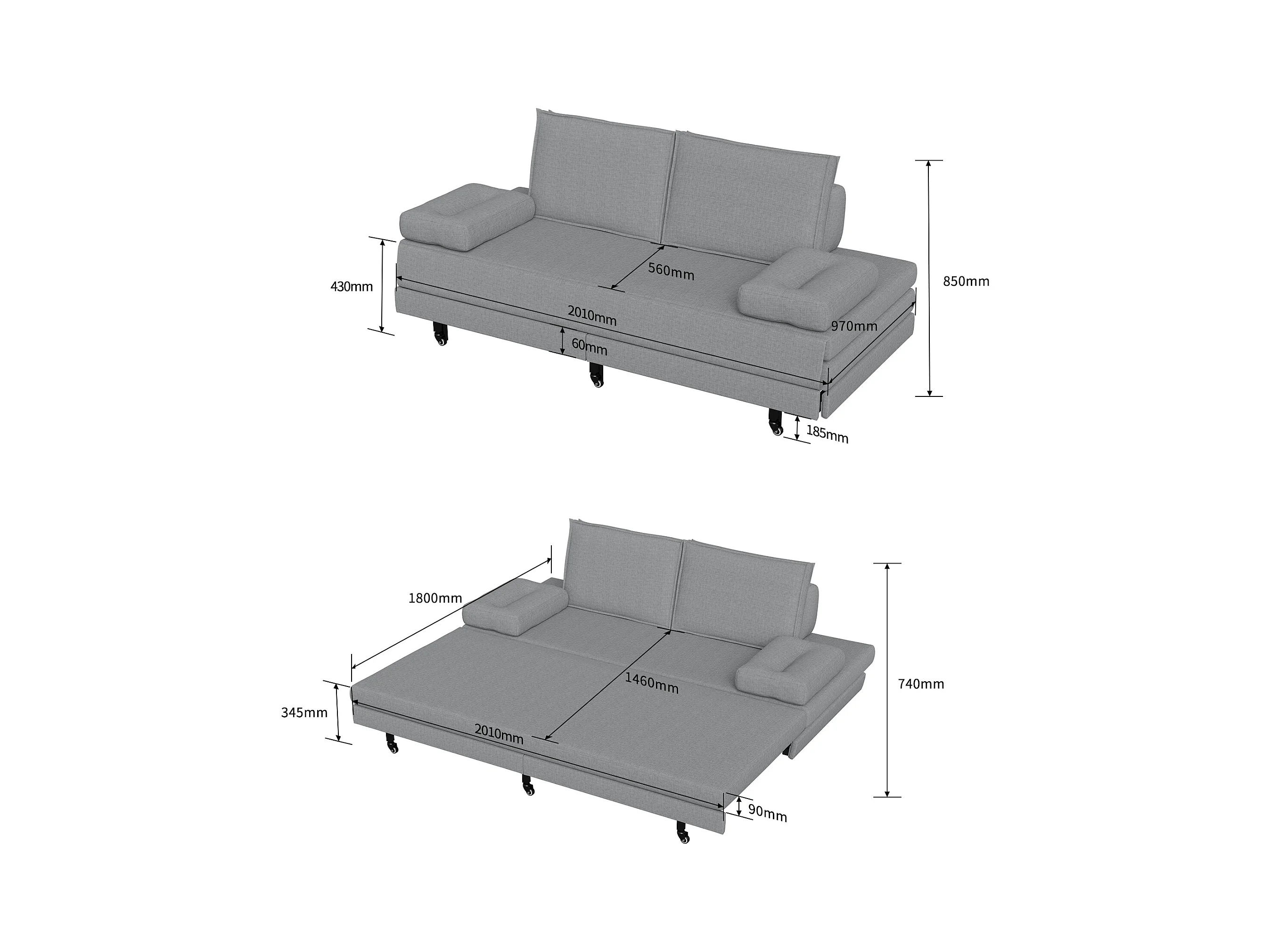 Slaapbank 90x200 cm, opklapbed, USB-aansluiting, whiteboard, diverse opbergvakken, grijs (208,5x116,5x112 cm)