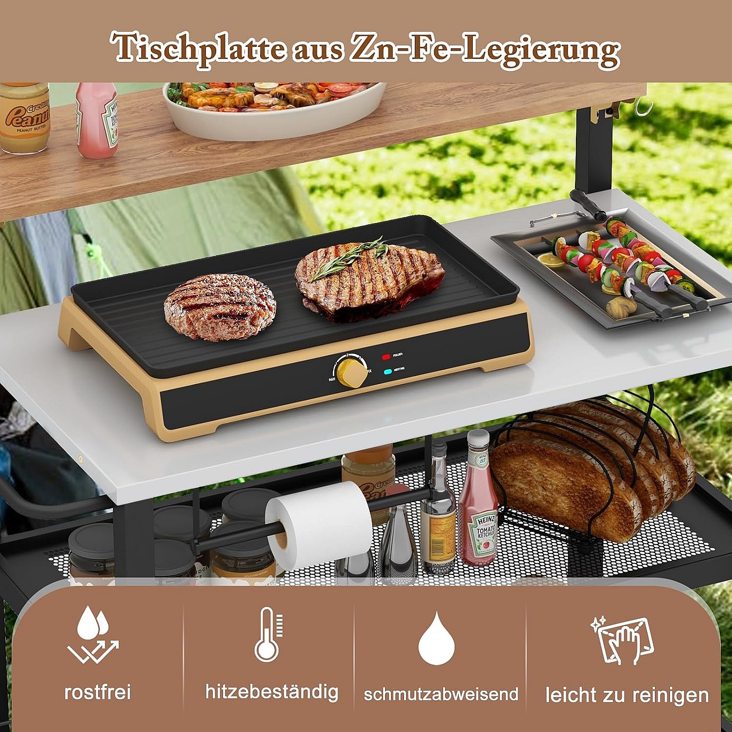 Grilltafel met 3 planken, grillwagen, telefoonstandaard, kruidenrek, handdoekhouder, zakdoekhouder en haken, outdoor serveerwagen bijzettafel ZB32034
