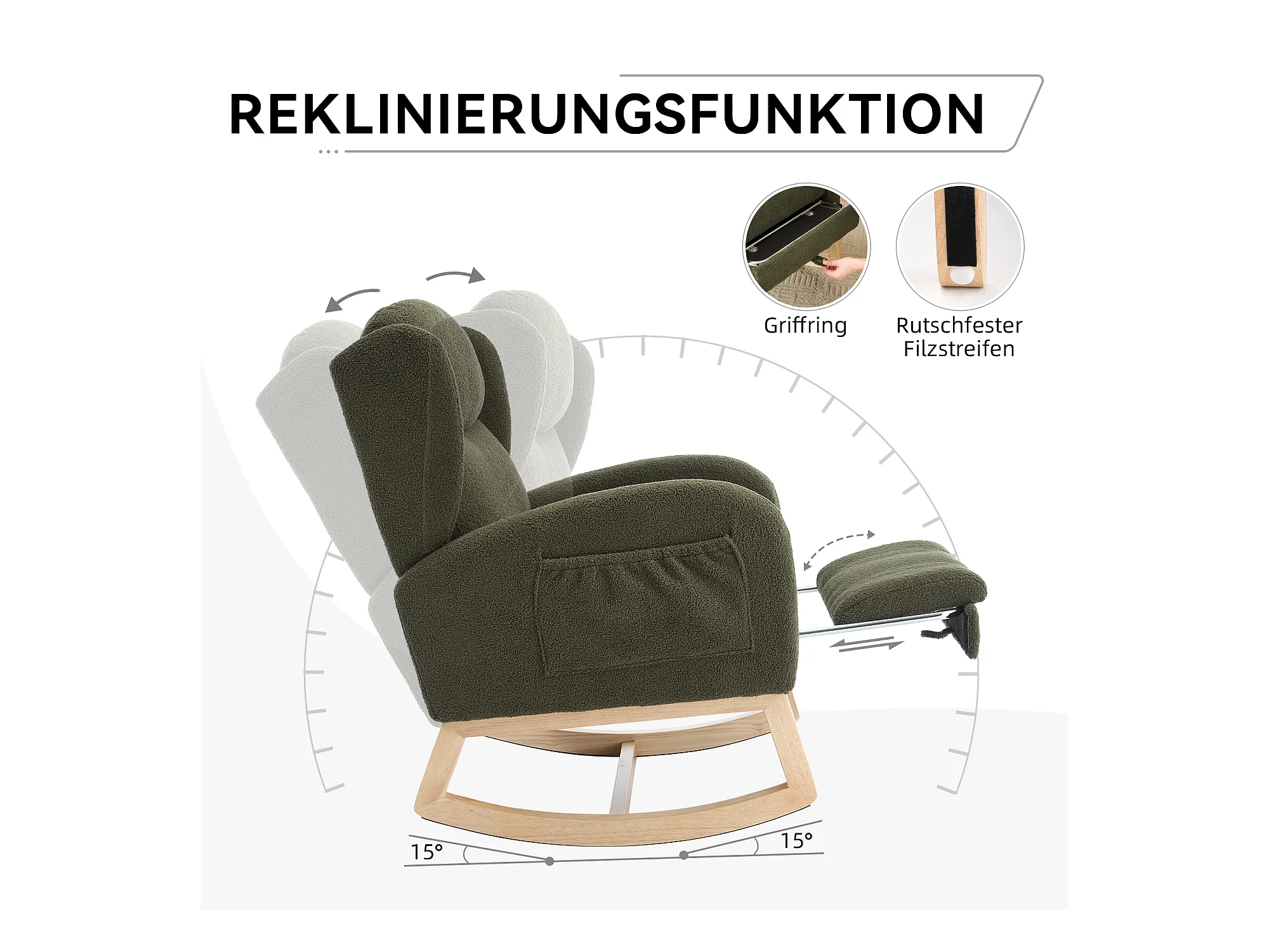 Schommelstoel met verstelbare voetensteun en zakken - groene pluche stof