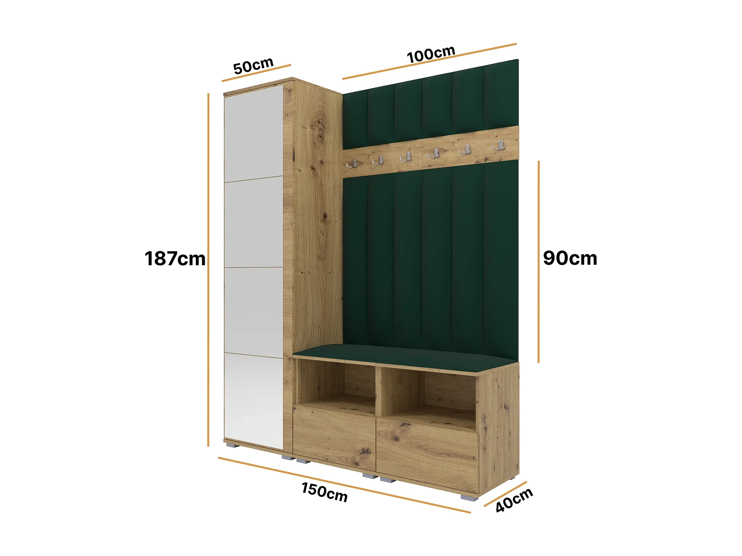 Halcombinatie Nela II LUX met spiegel - 150 cm - Artisan Eiken - Trinity 28 - Flessengroen