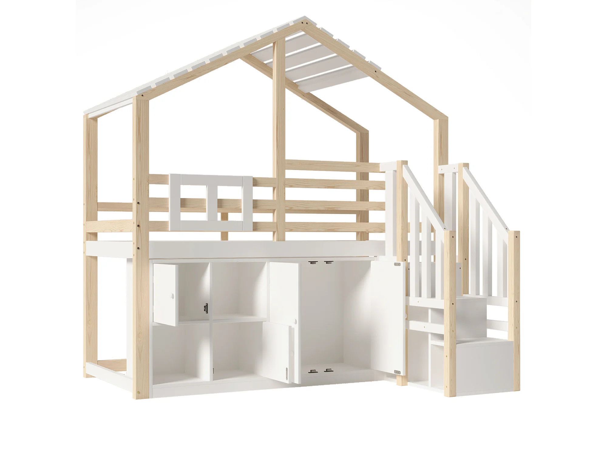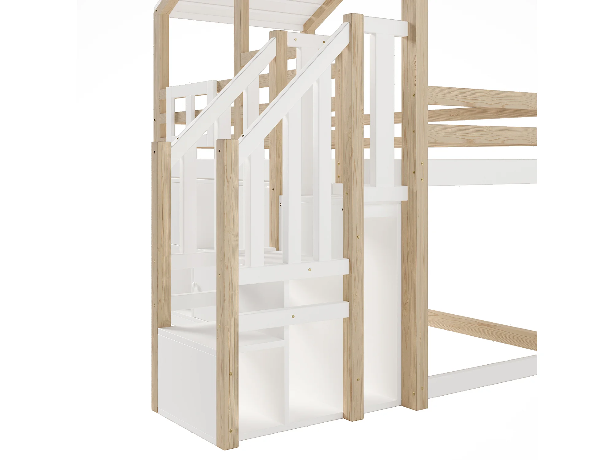 Halfhoog hoog bed 90x200cm met kasten en opbergladder - Dennen + MDF - wit + hout