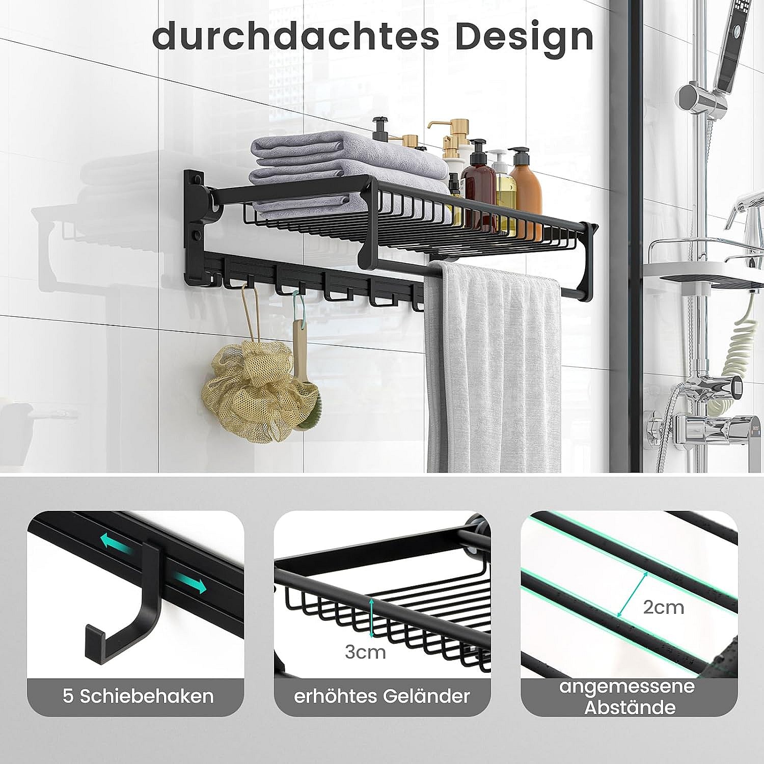 Handdoekhouder inklapbaar, handdoekrek zonder boren, handdoekstang, wandgemonteerd met 9 beweegbare haken en plank,voor badkamer, keuken, 59,5 x 26 x 14 cm
