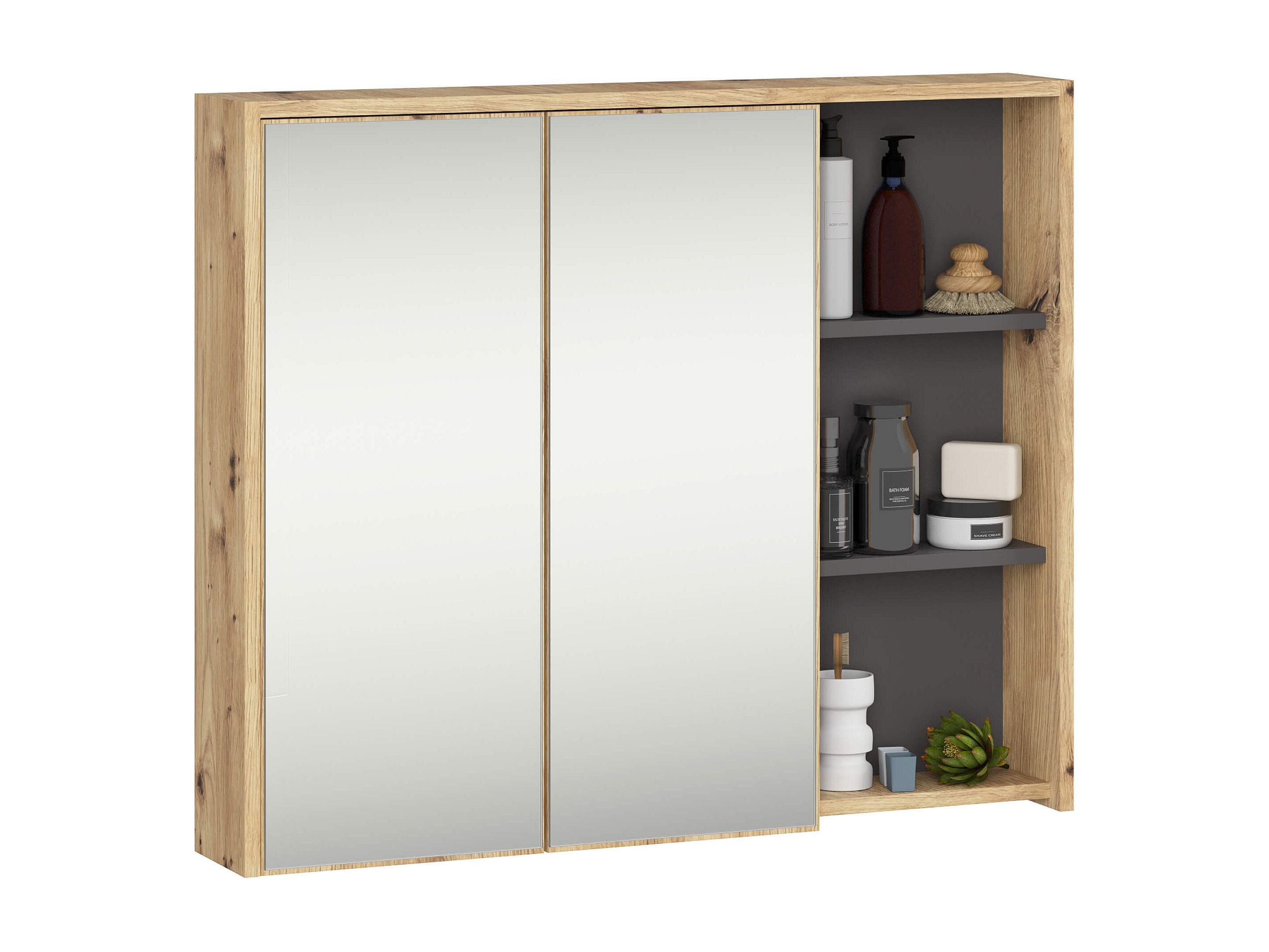 Hangende Badkamerkast Spiegelkast VAMI W90 met 2 Deuren en 6 Planken en Spiegel / Artisan Eik - Grafietgrijs / AKORD Furniture Factory / 90x15x75 cm