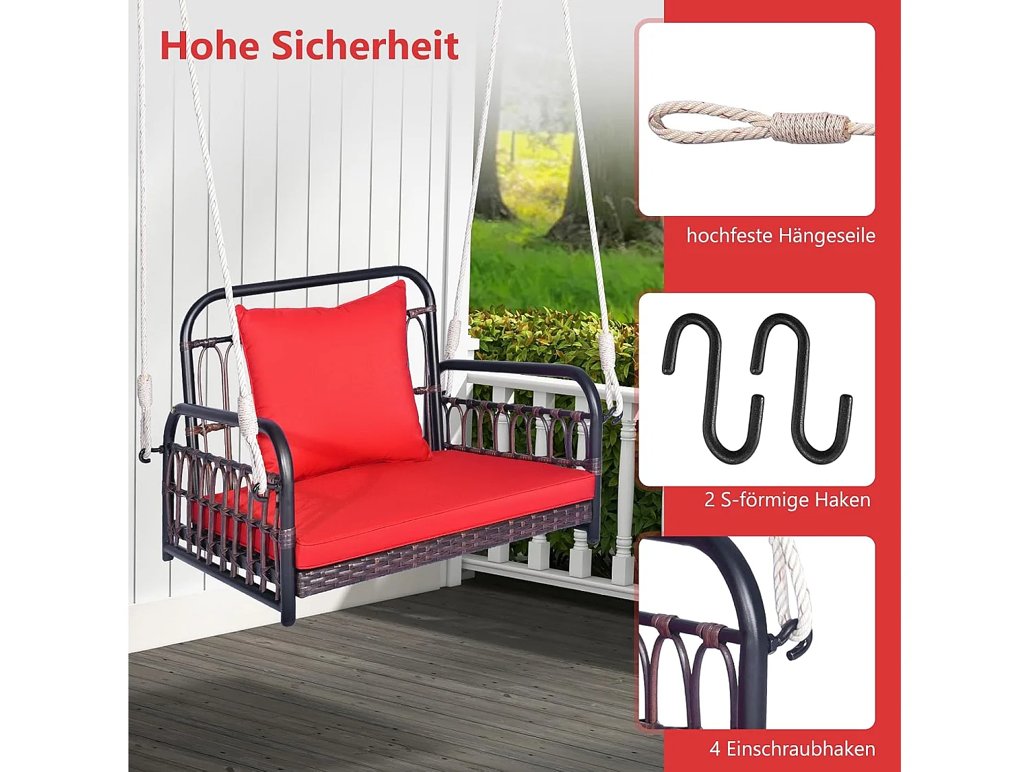 Hangstoel, terrasschommel, belastbaar tot 180 kg, hangstoel met zit- en rugkussens, metalen frame en hangtouwen, hangstoel voor veranda en achtertuinTI93553