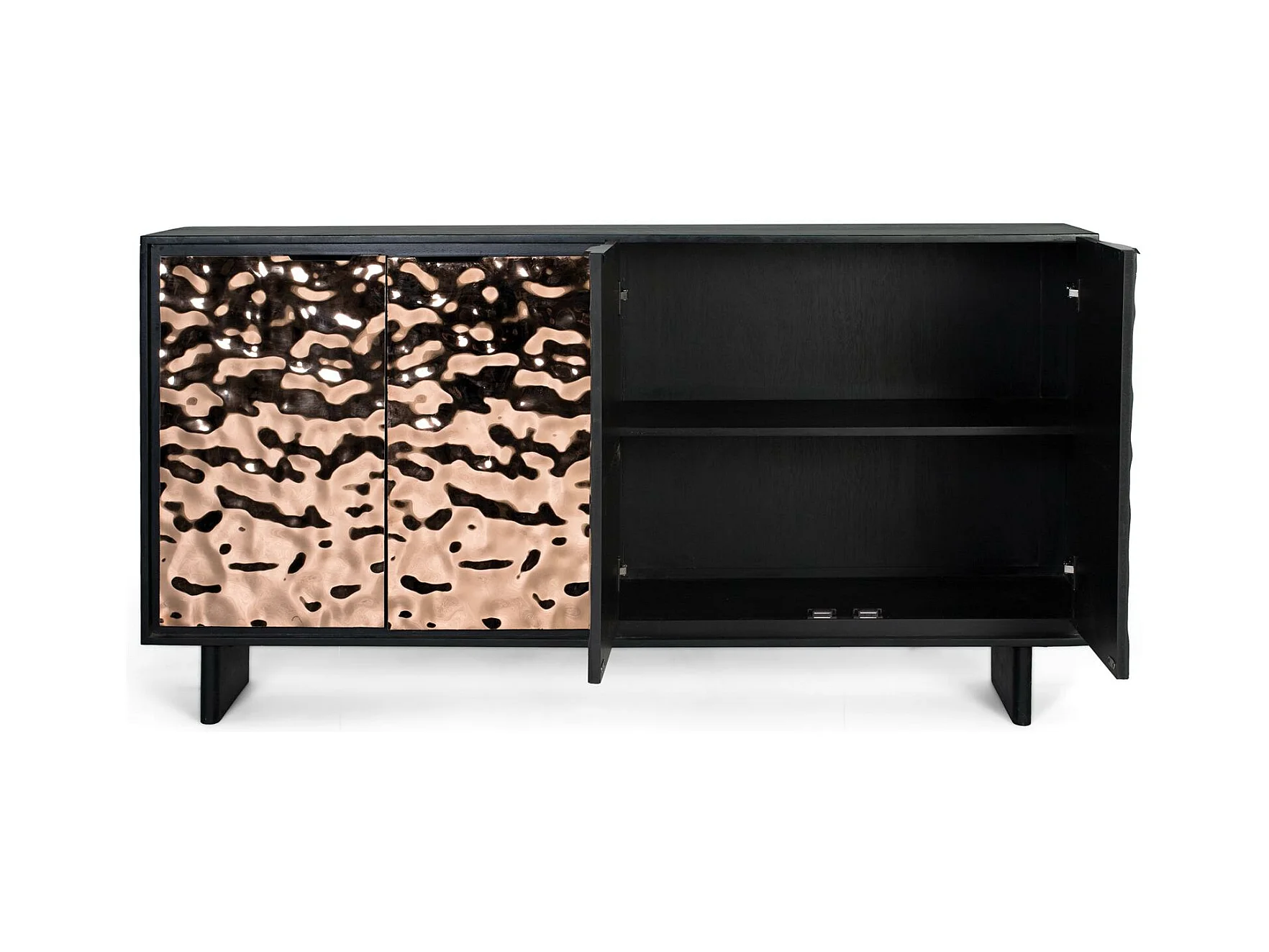 Vierdeurs dressoir, verstelbare binnenplanken, metalen handgrepen en bolvormige poten, zwart