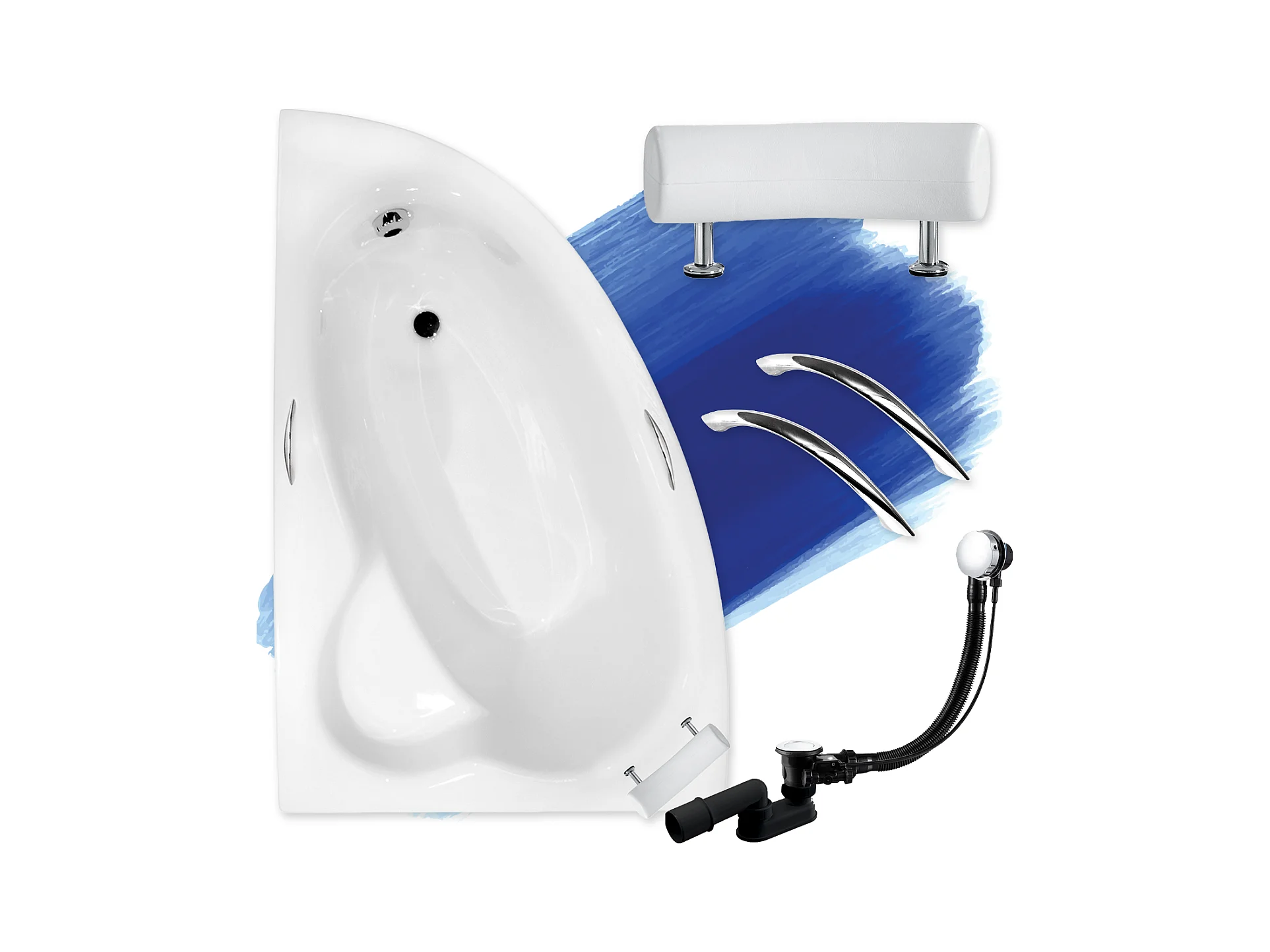 Hoekbadkuip RIMA 150x95 rechts met acrylschort en witte hoofdsteunen | Afvoer & voeten GRATIS!