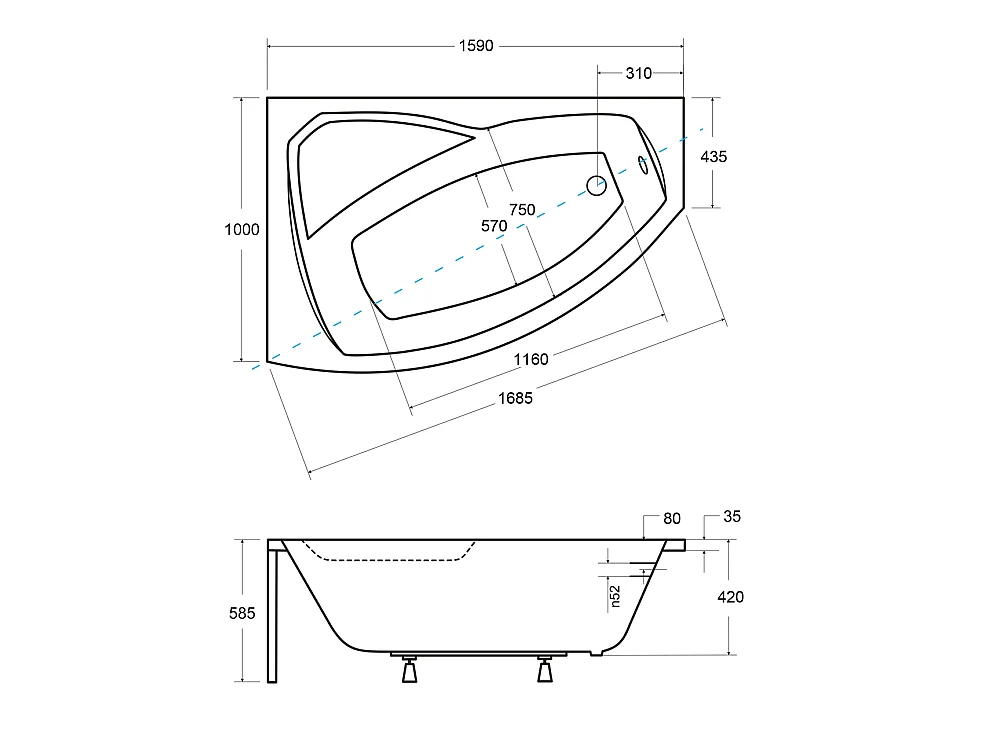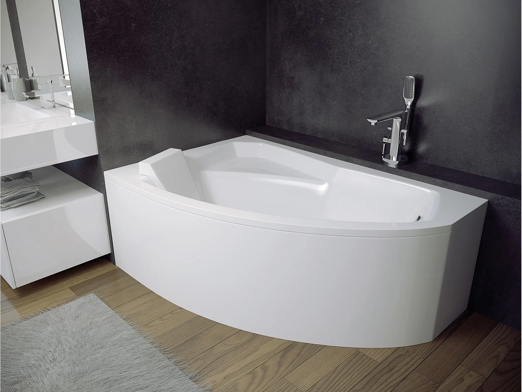 Hoekbadkuip RIMA 160x100 links met acrylschort en witte hoofdsteunen | Afvoer & voeten GRATIS!