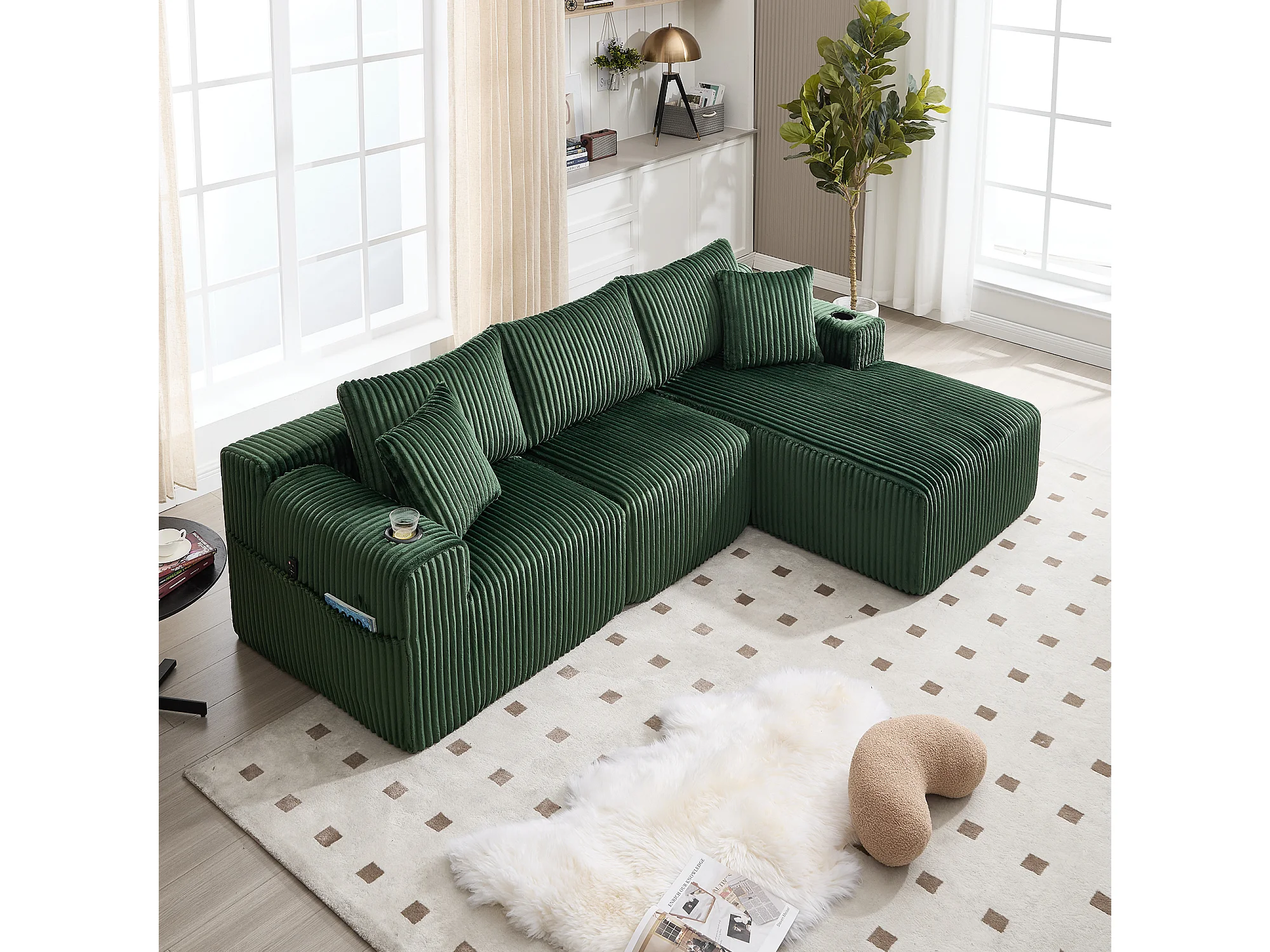 Hoekbank – 2-Zits Met Chaiselongue – Modulaire Met Zijvakken & Bekerhouder – Ribfluweel – Smaragdgroen – Met 5 Kussens Voor Woonkamer & Studio