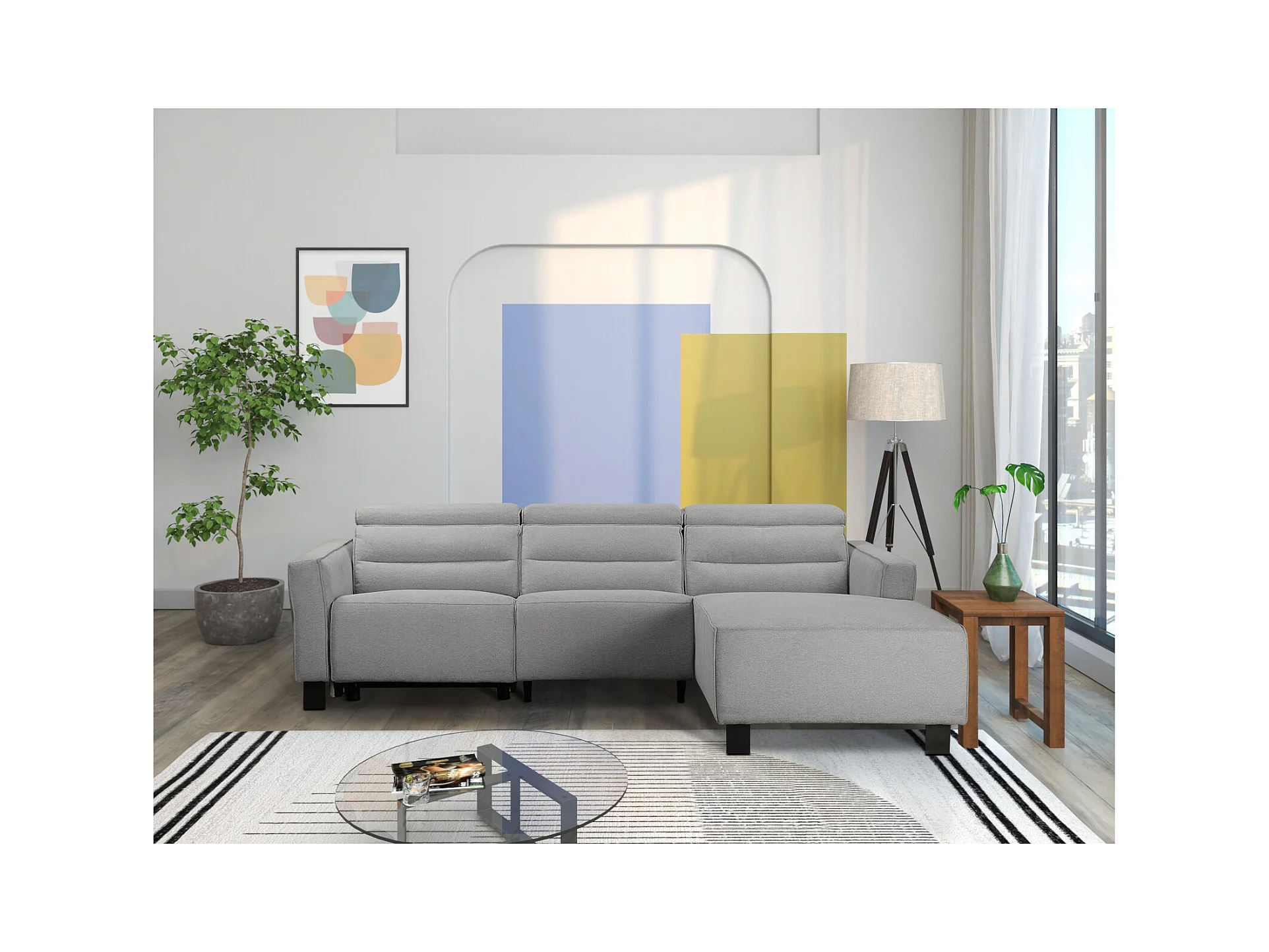 Hoekbank 3-zits met handmatige functie in lichtgrijze stof
