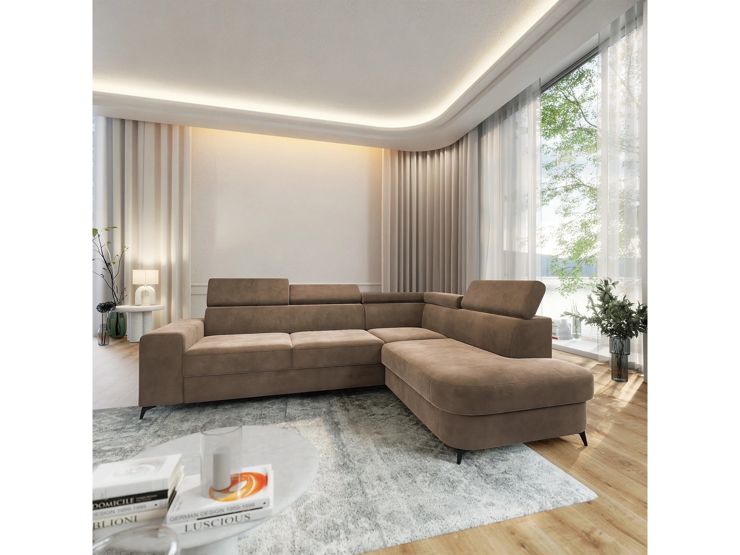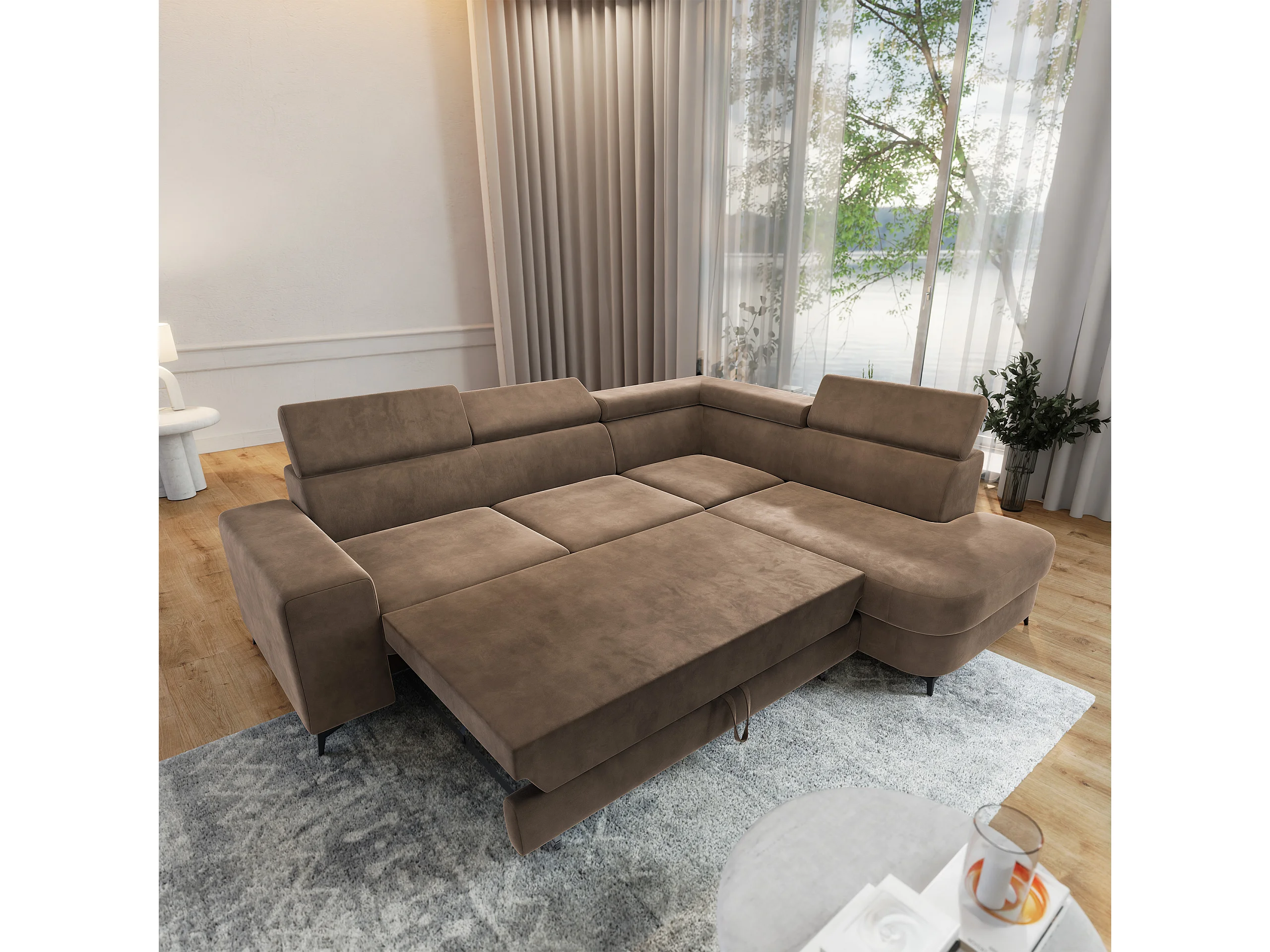 Hoekbank ALVORO van fluweel met slaapfunctie Beige