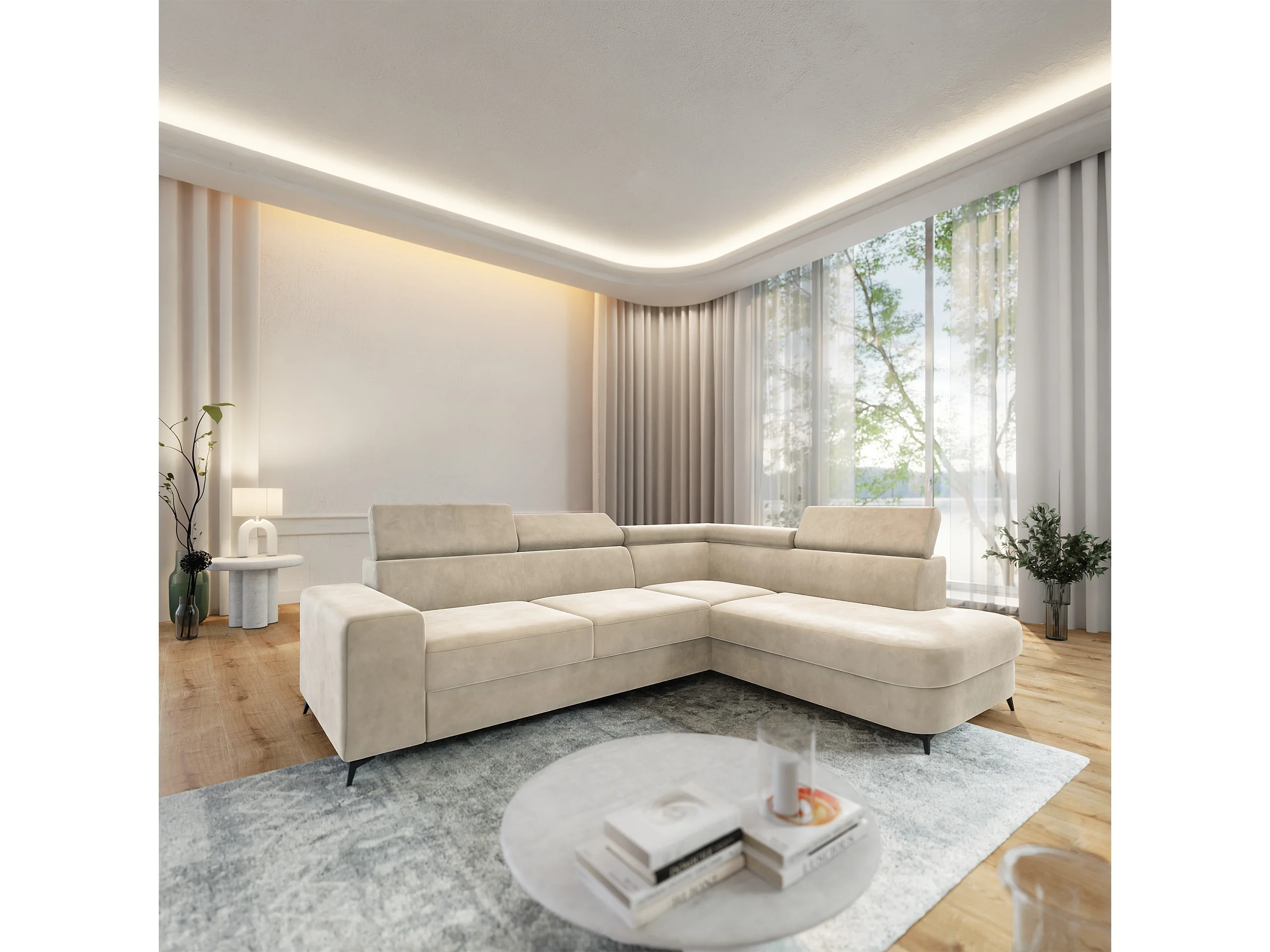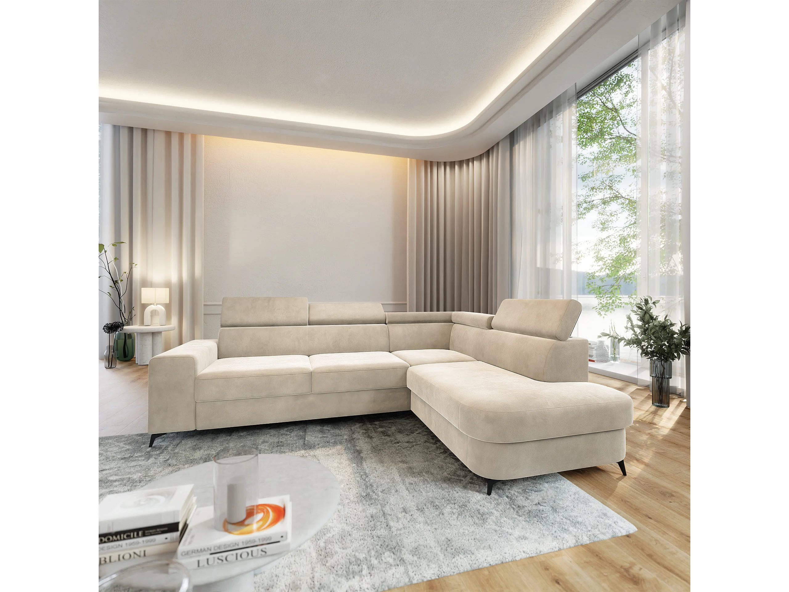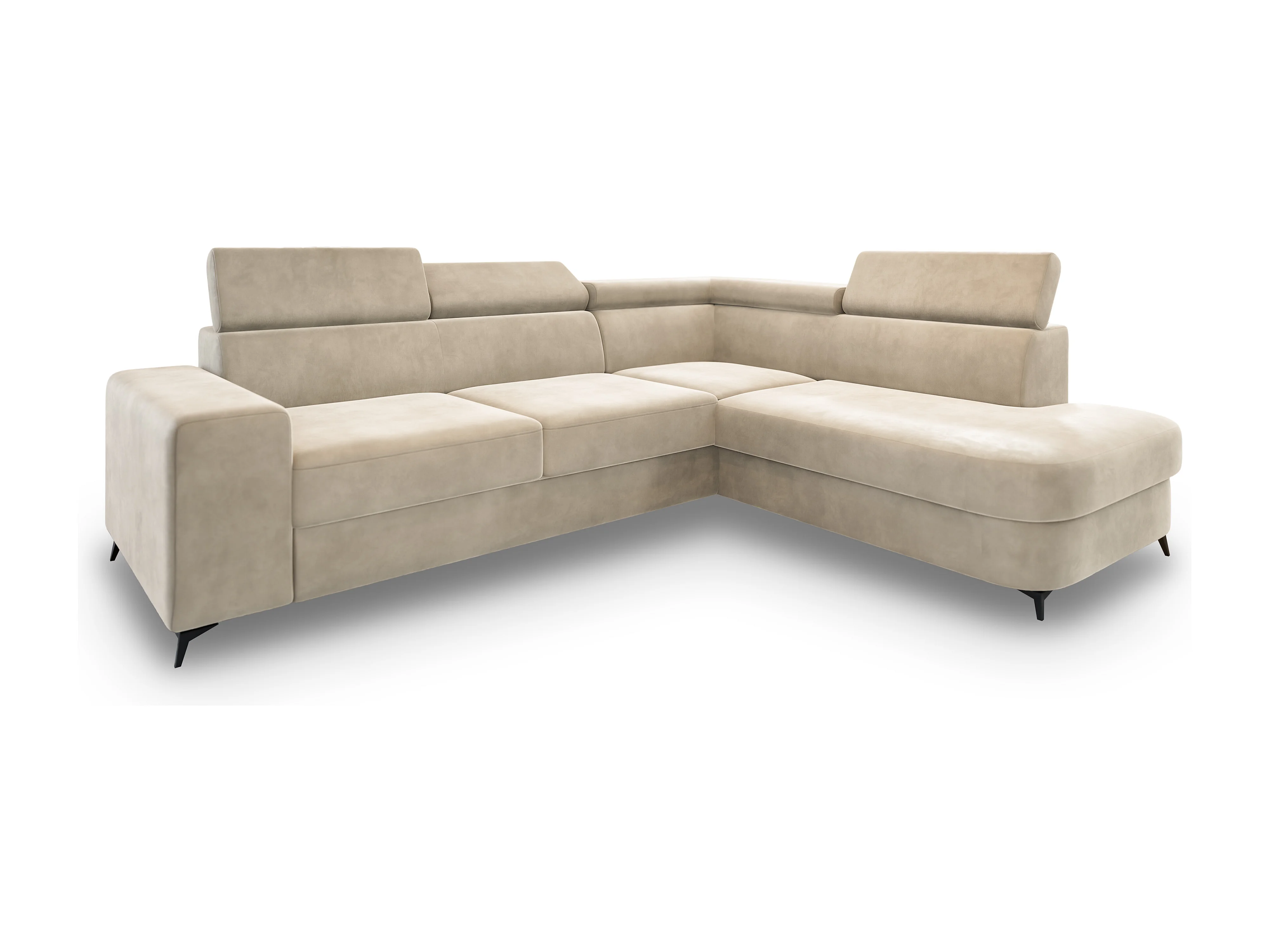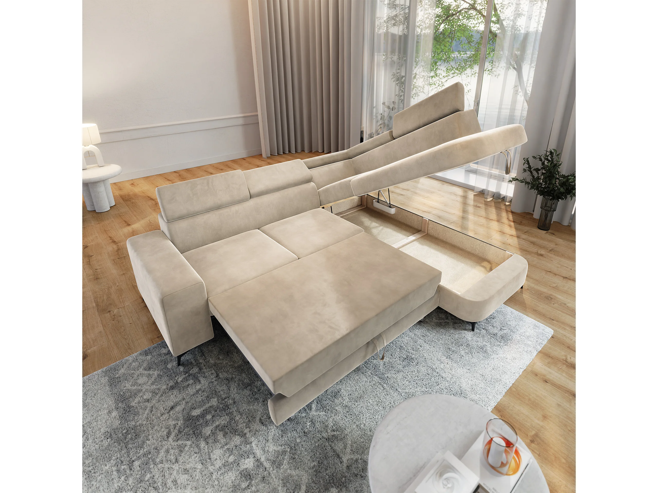 Hoekbank ALVORO van fluweel met slaapfunctie Creme