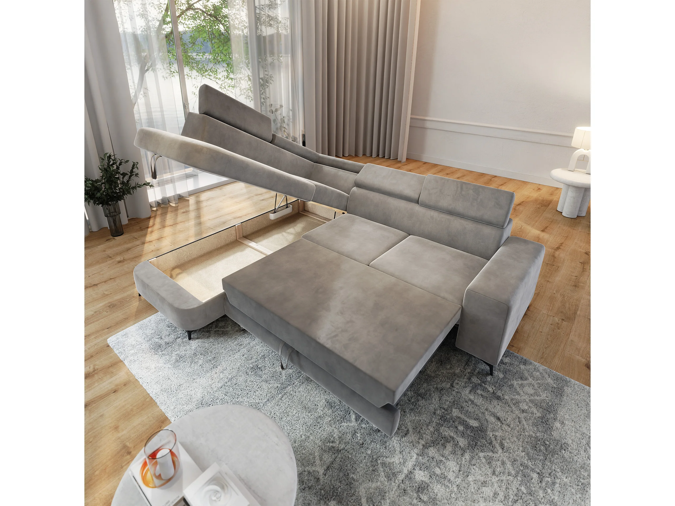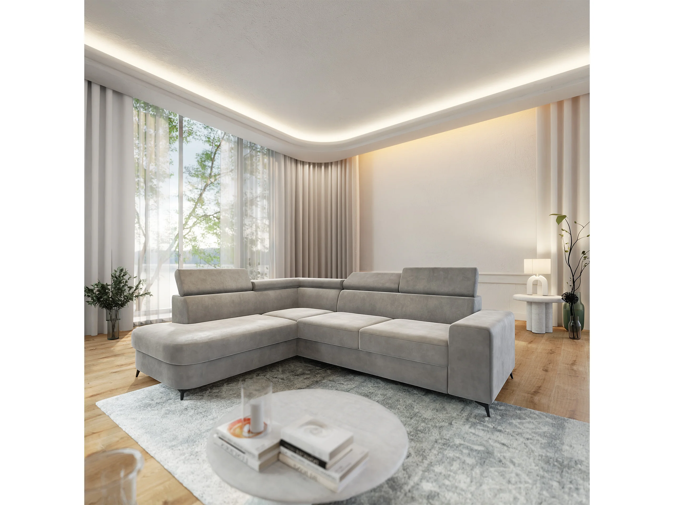 Hoekbank ALVORO van fluweel met slaapfunctie Hellgrau