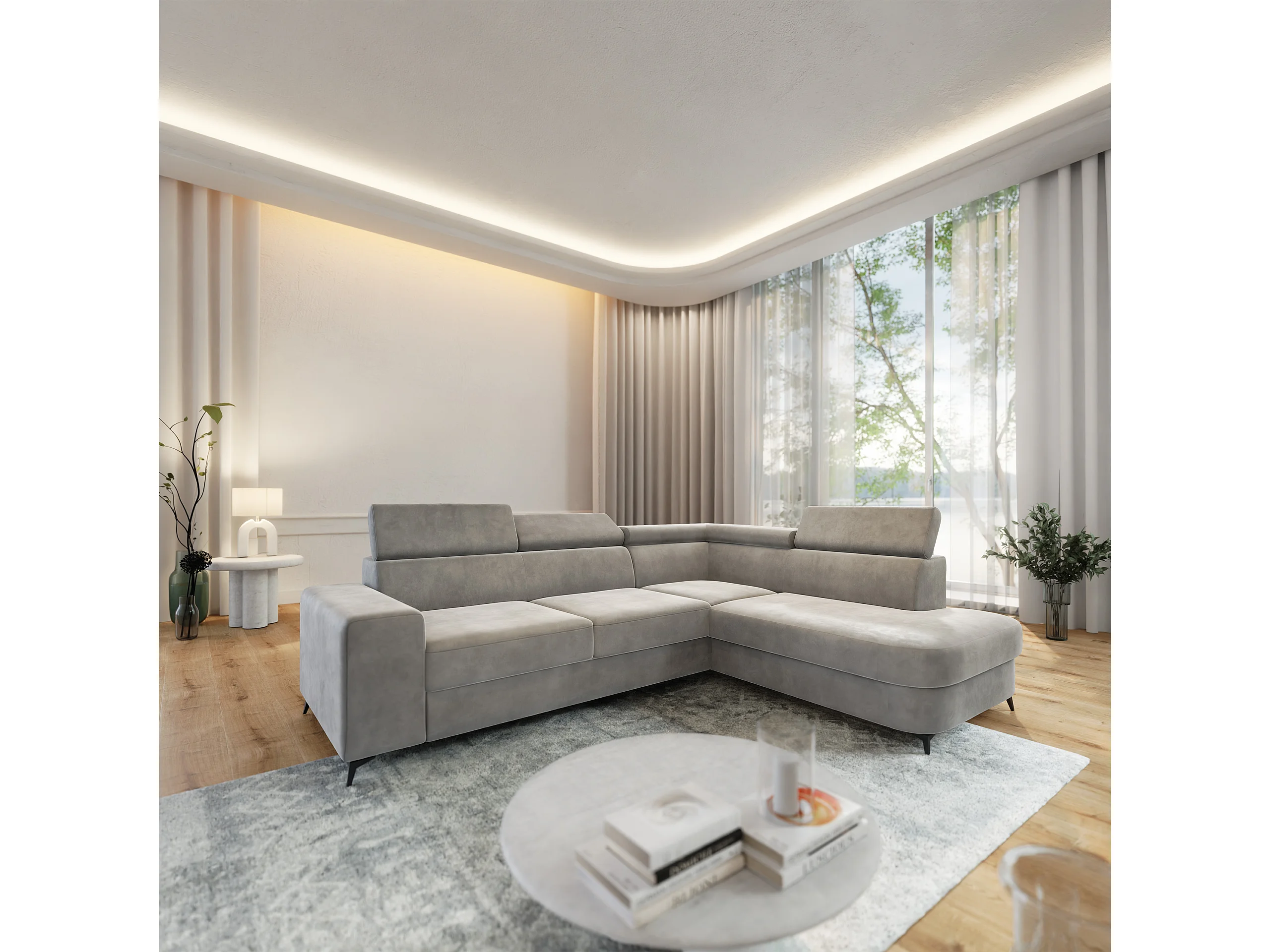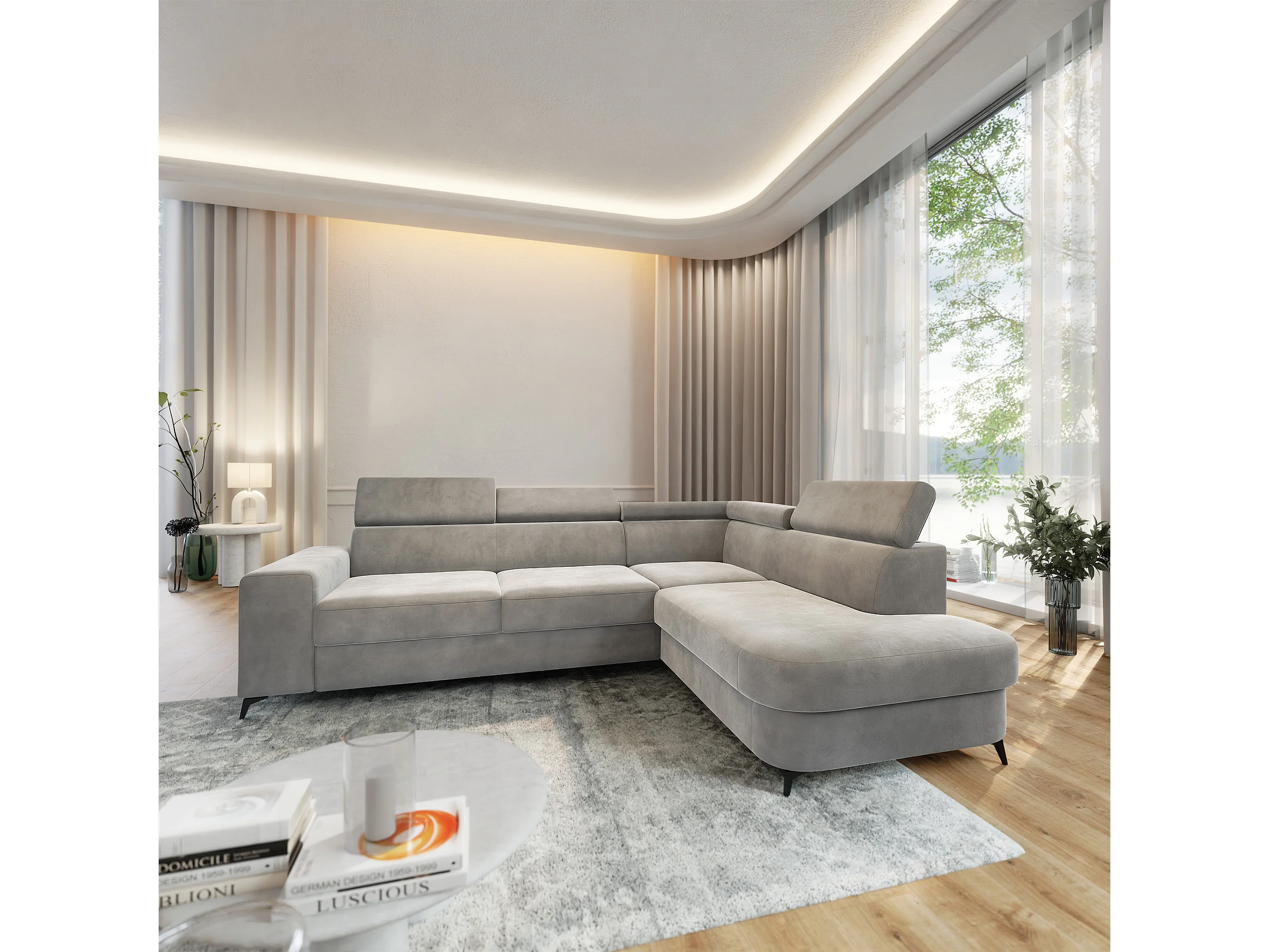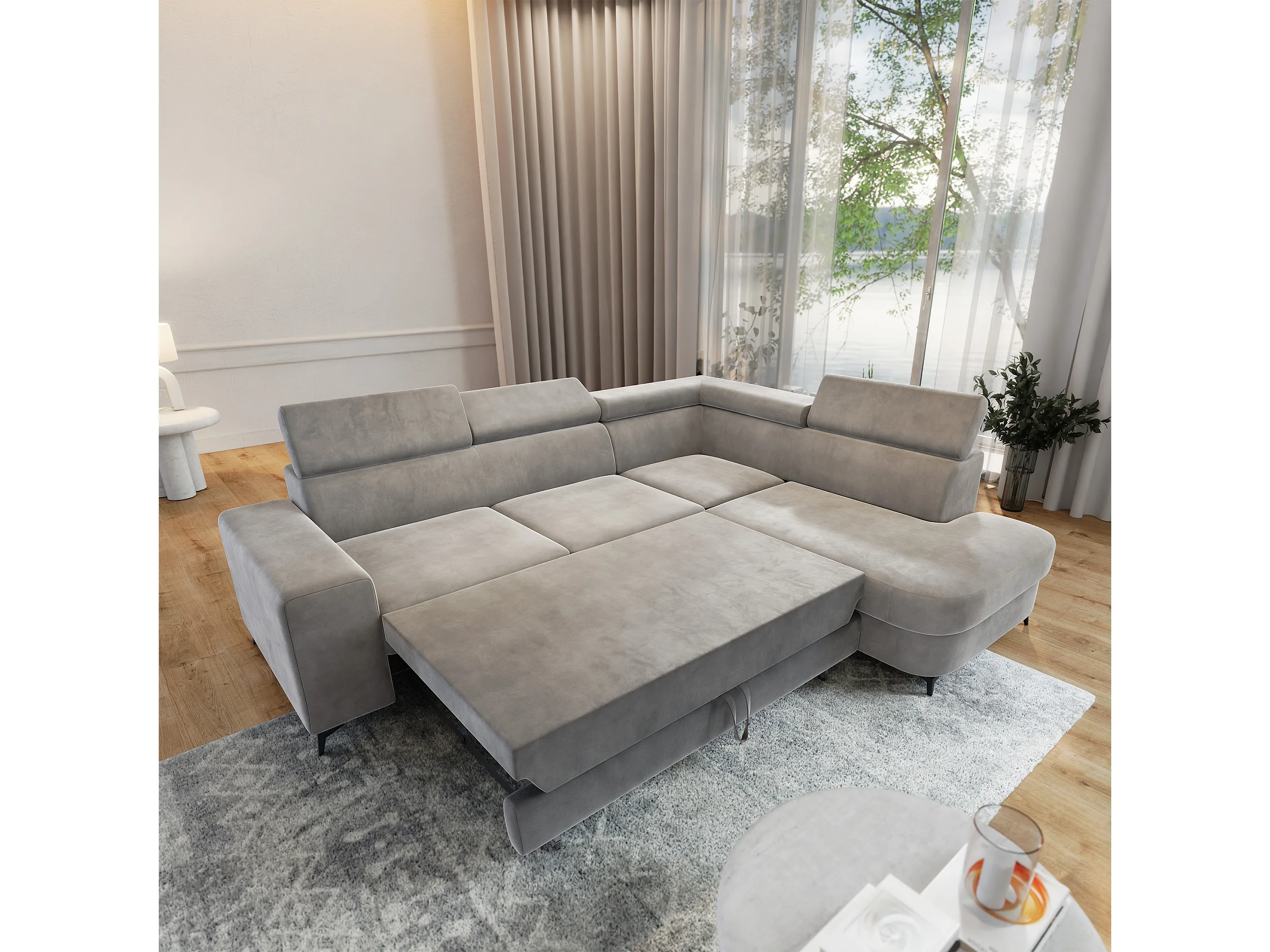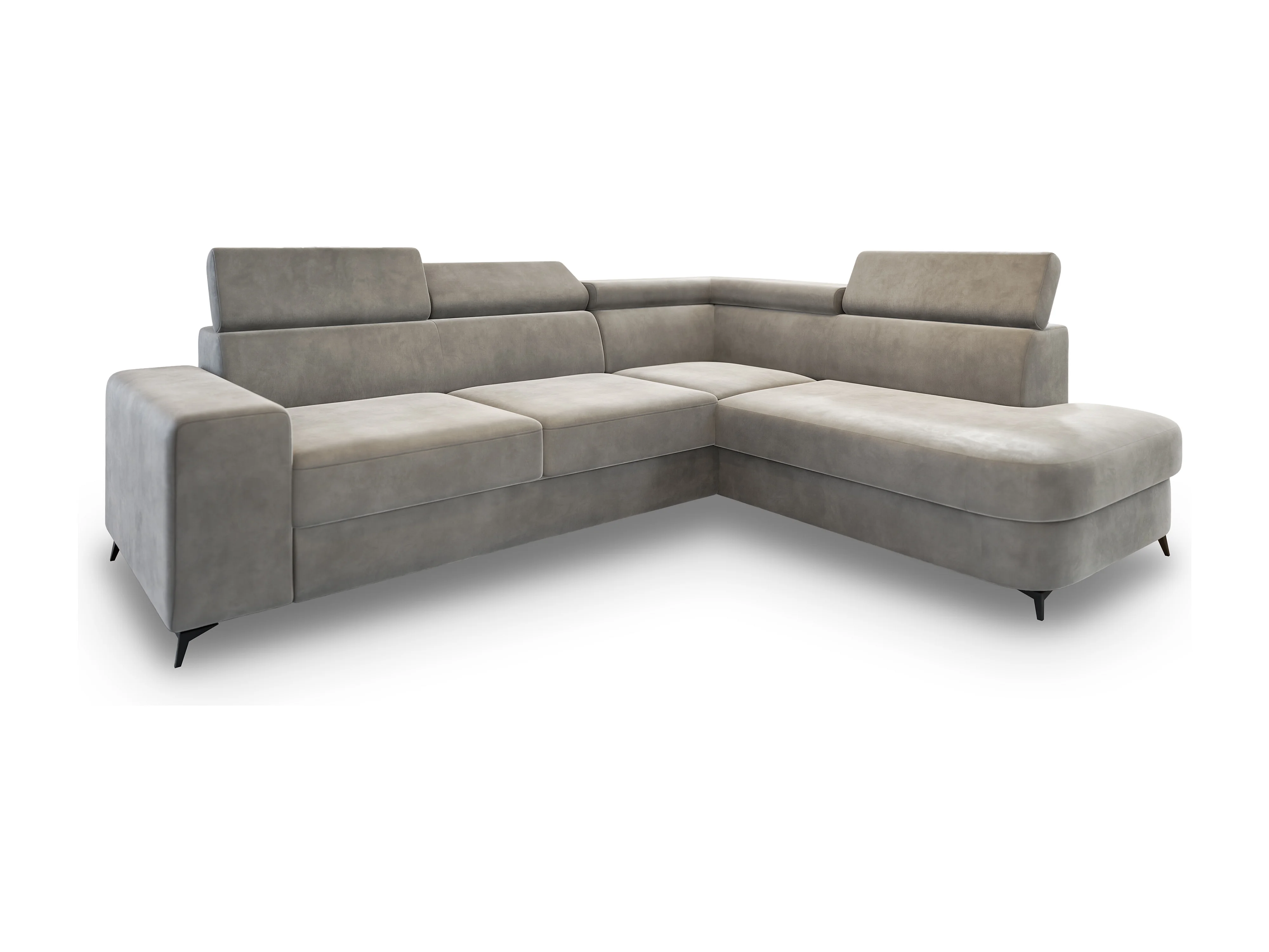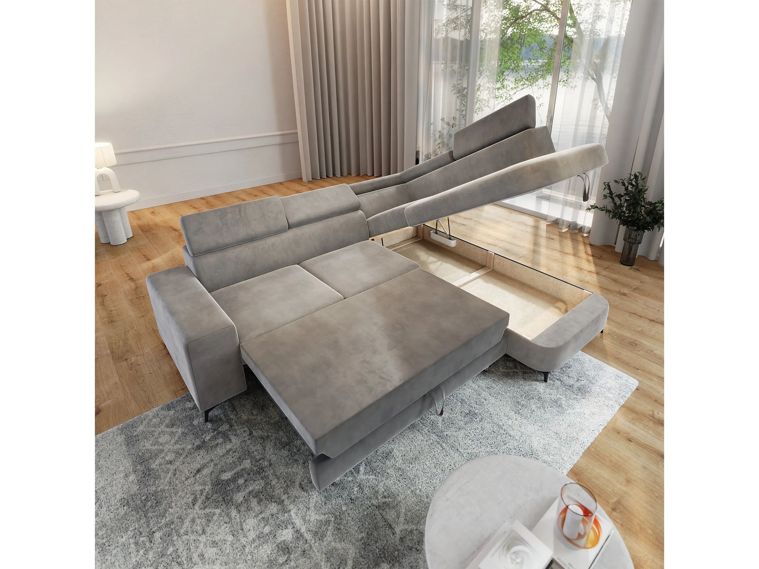 Hoekbank ALVORO van fluweel met slaapfunctie Hellgrau