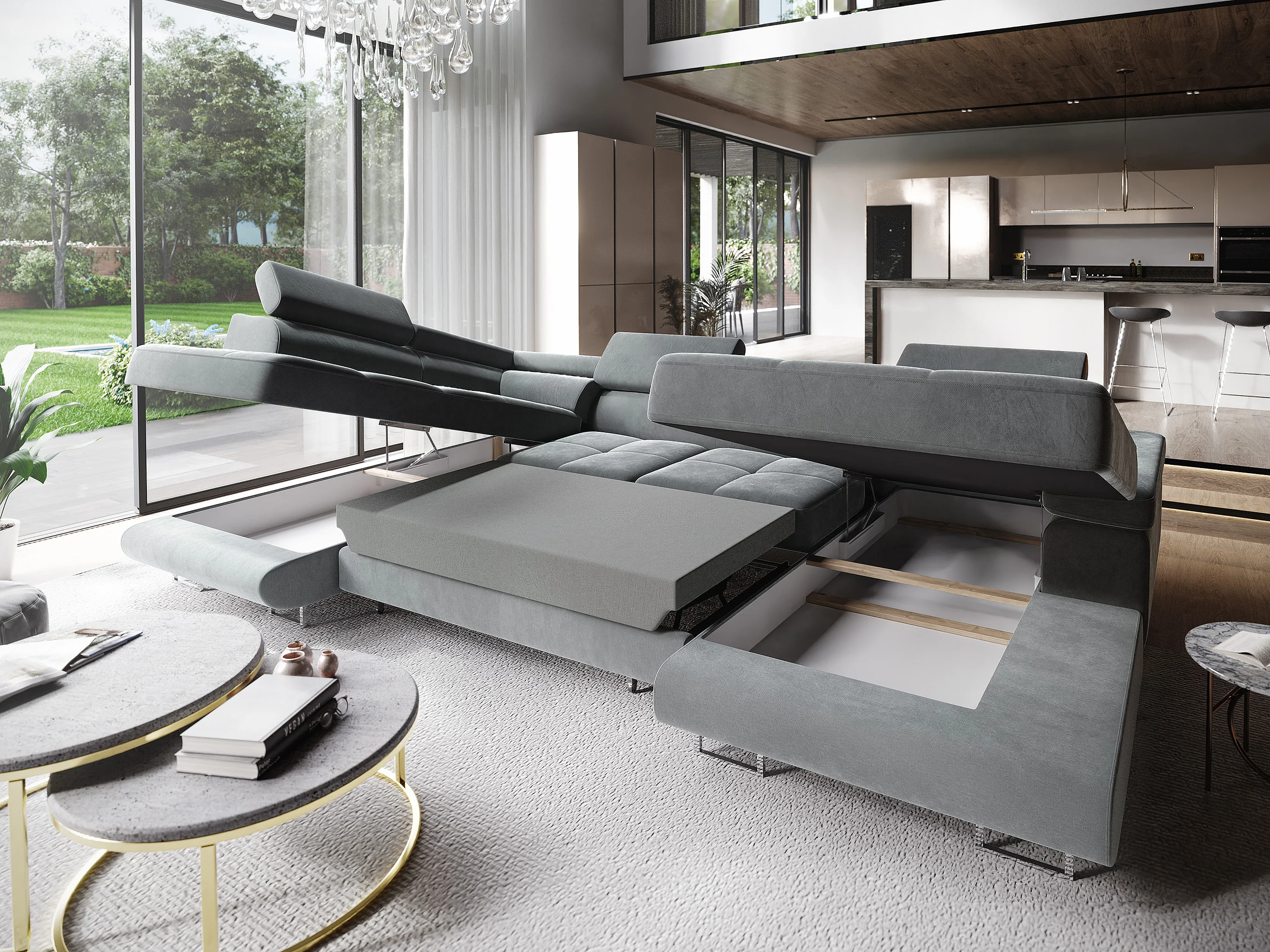Hoekbank CASONE van fluweel met slaapfunctie Grau