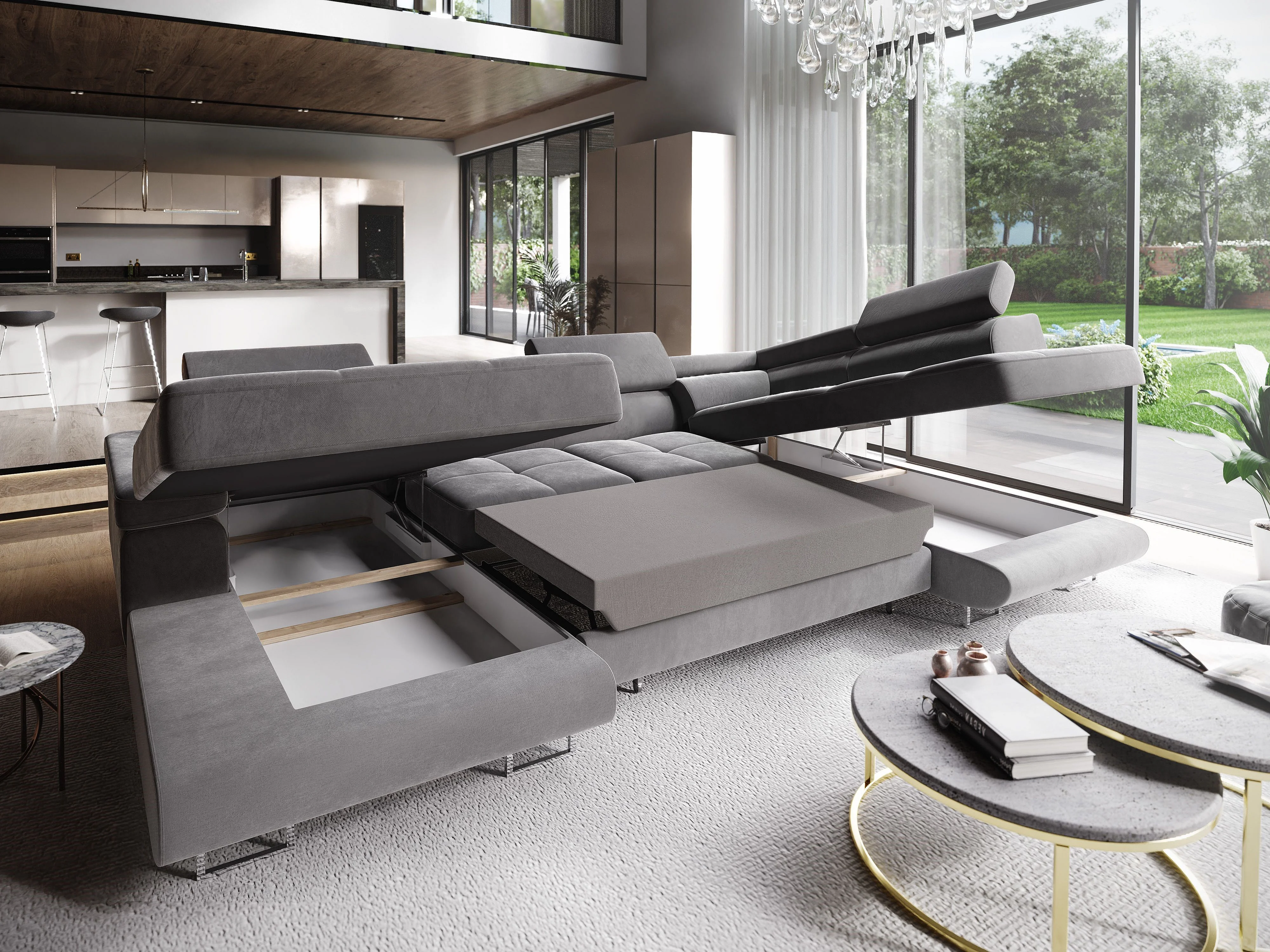 Hoekbank CASONE van fluweel met slaapfunctie Hellgrau