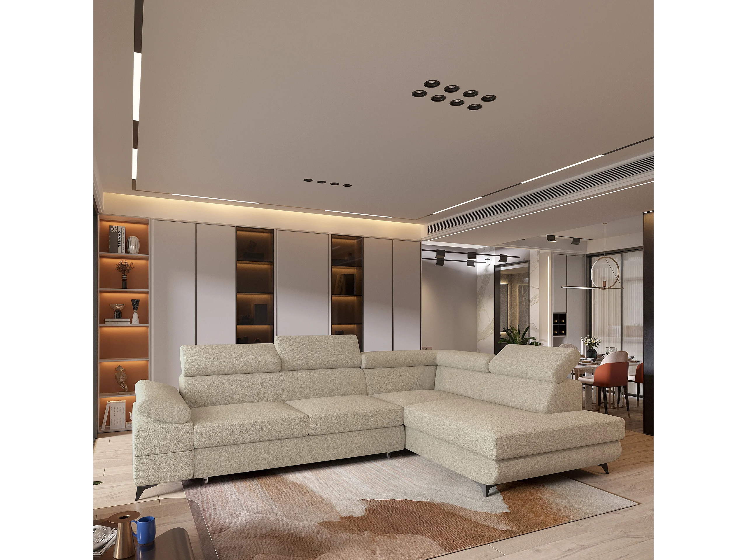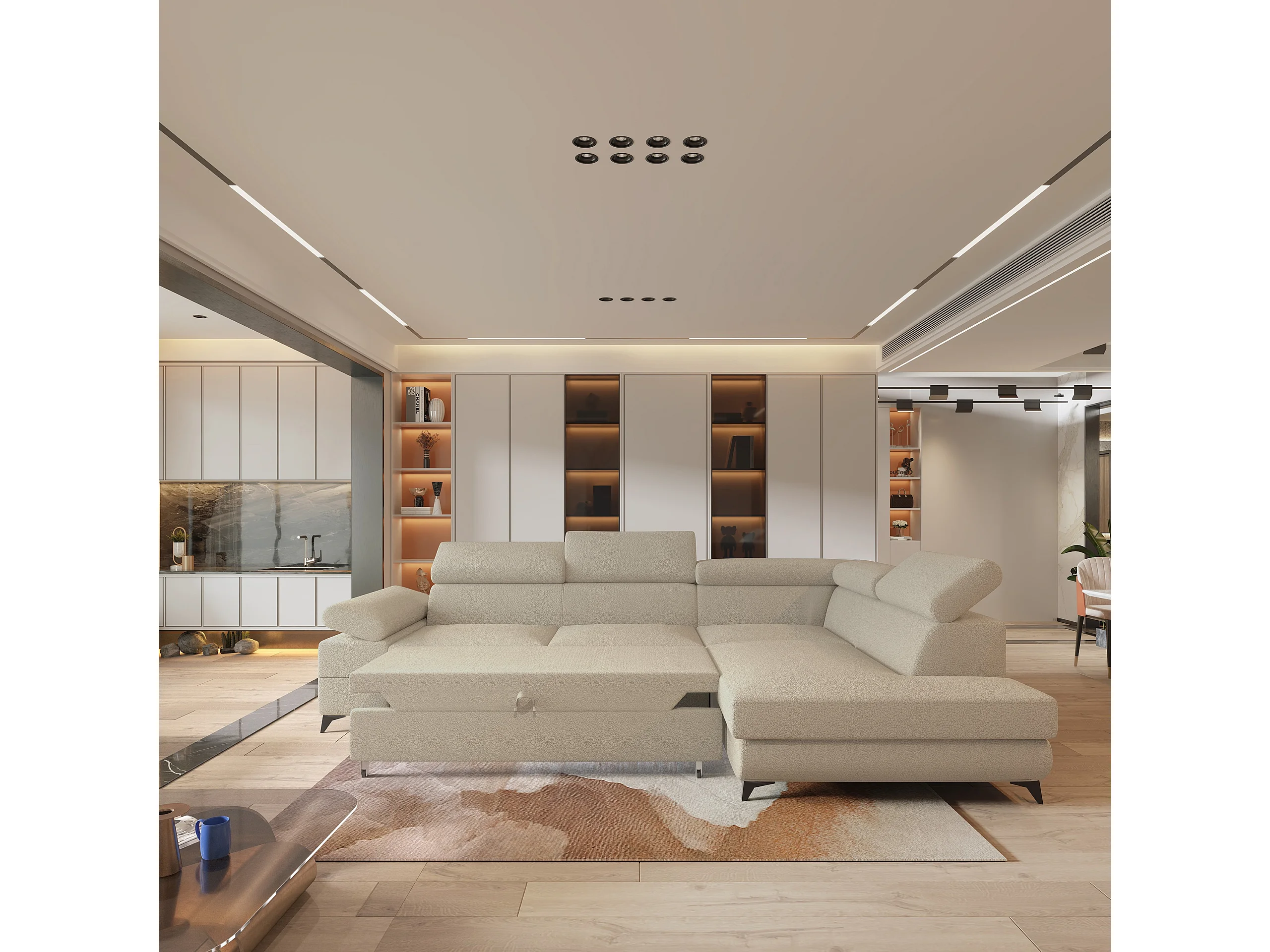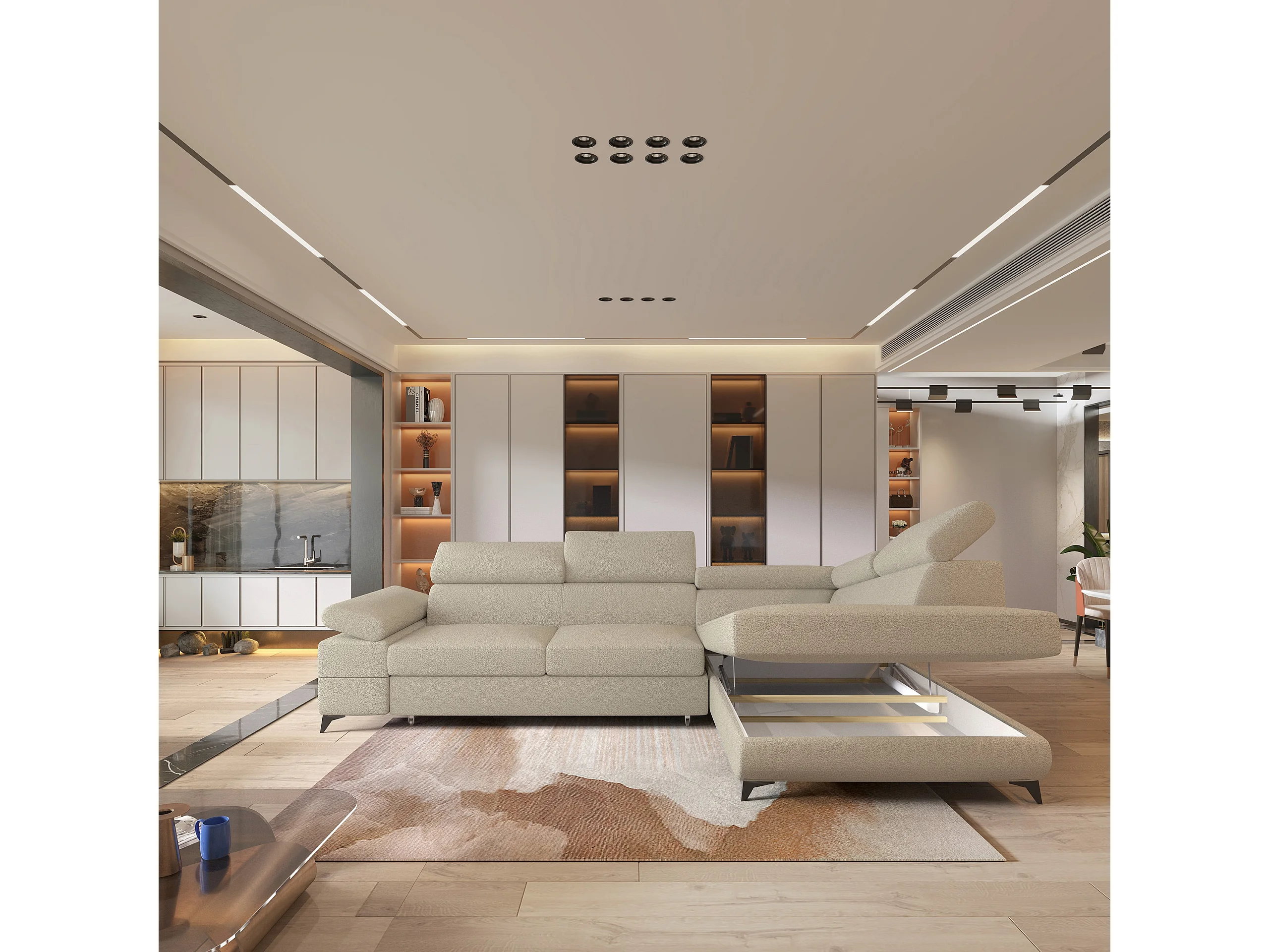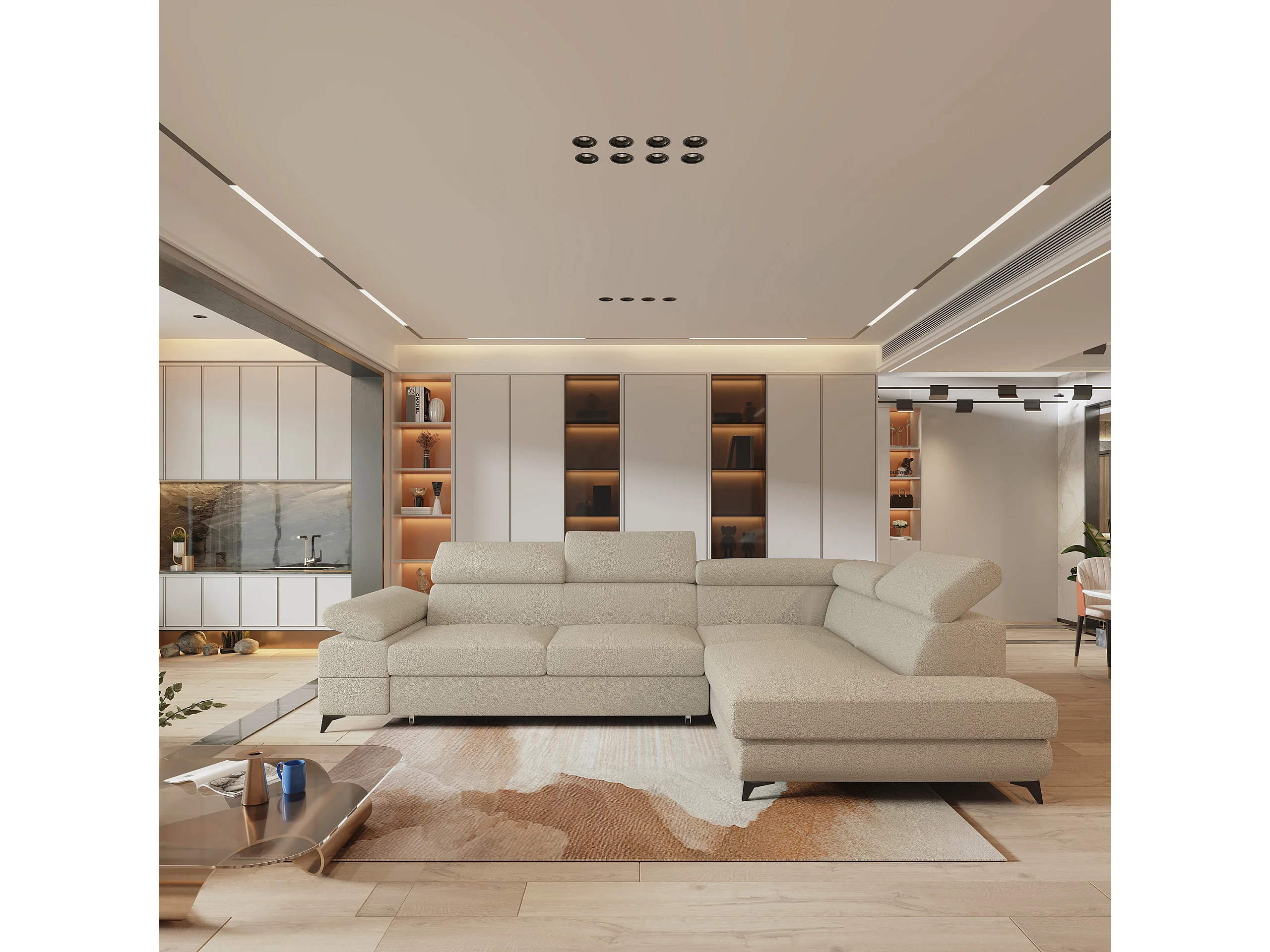 Hoekbank FAVIEN van fluweel met slaapfunctie Beige