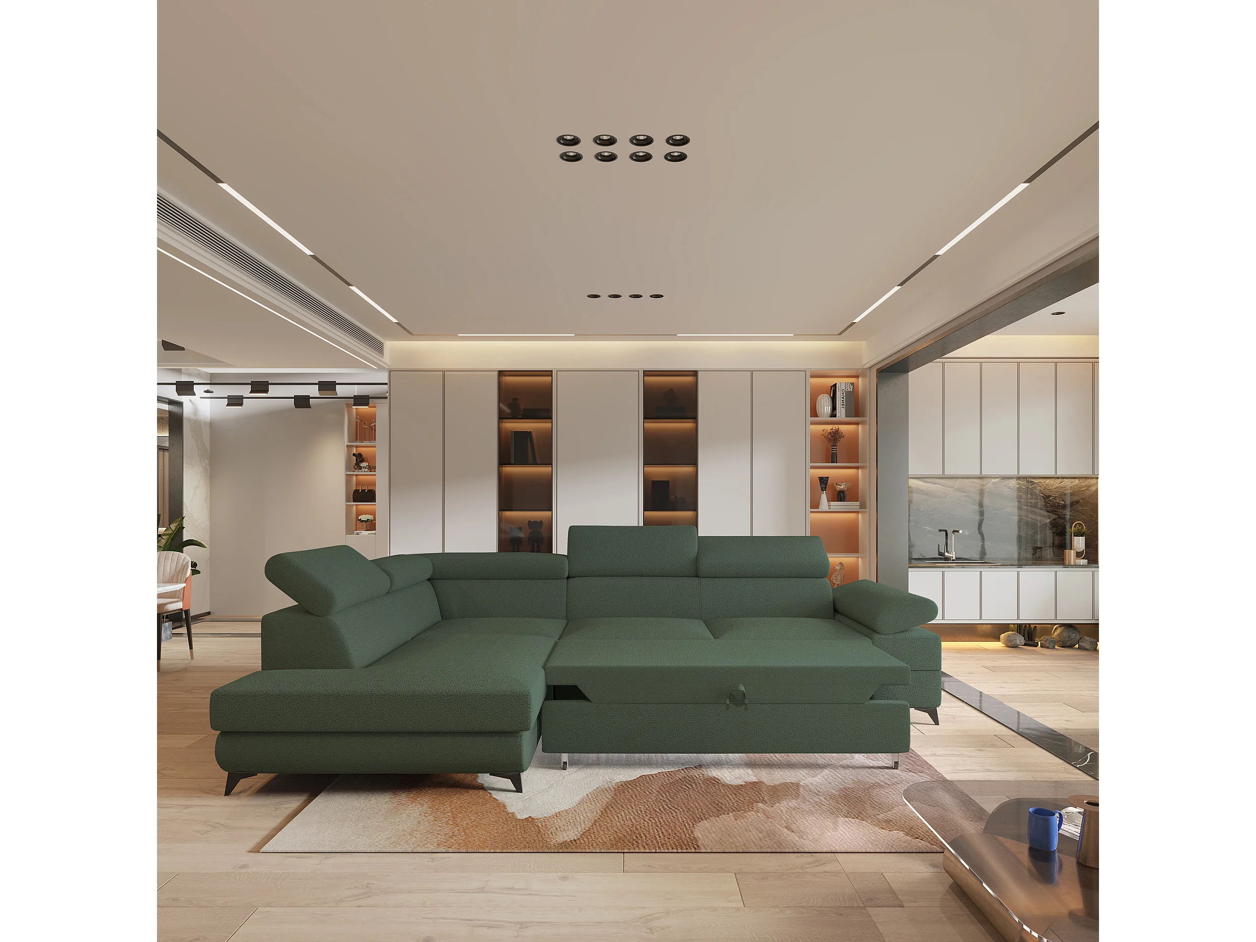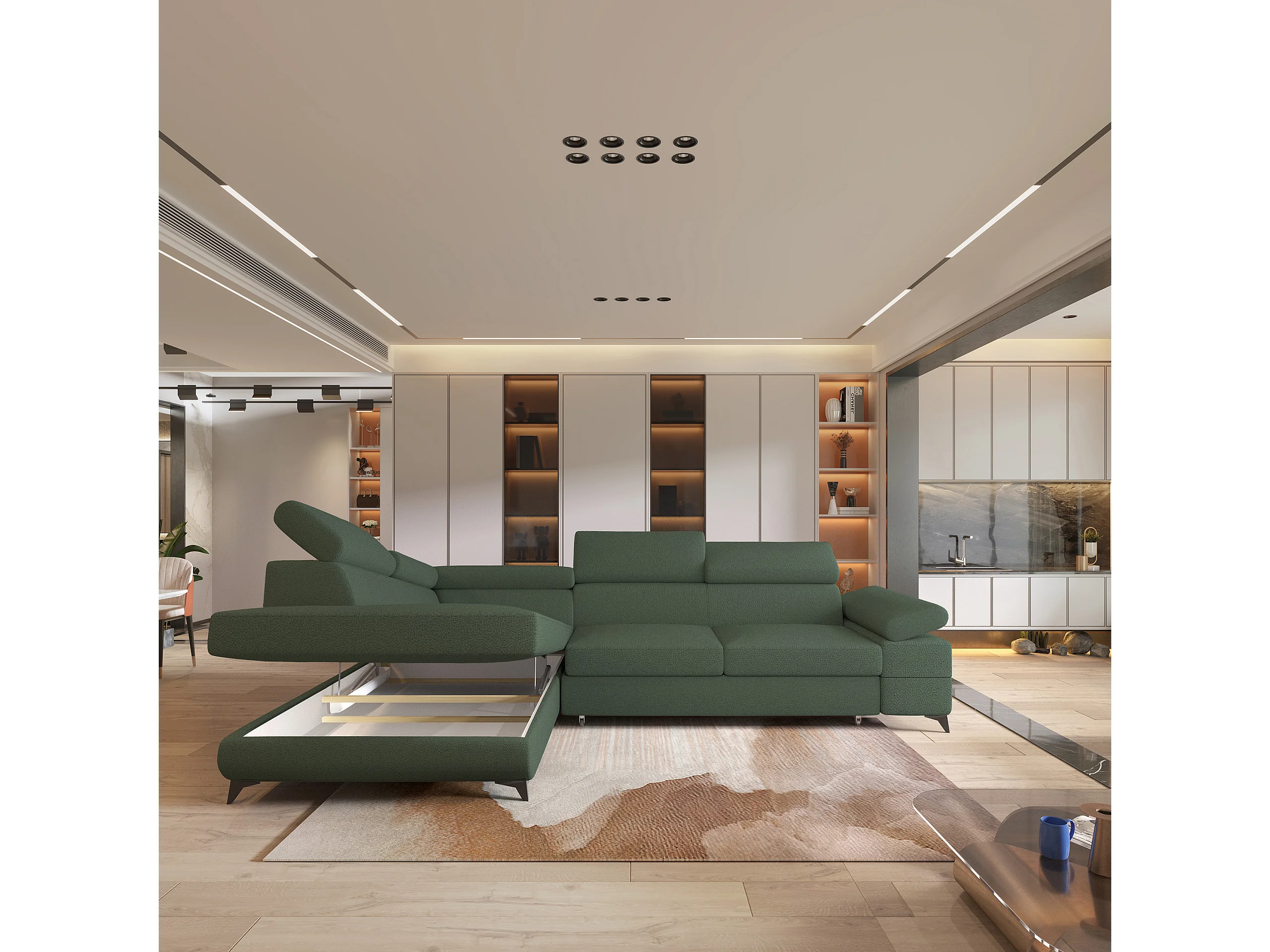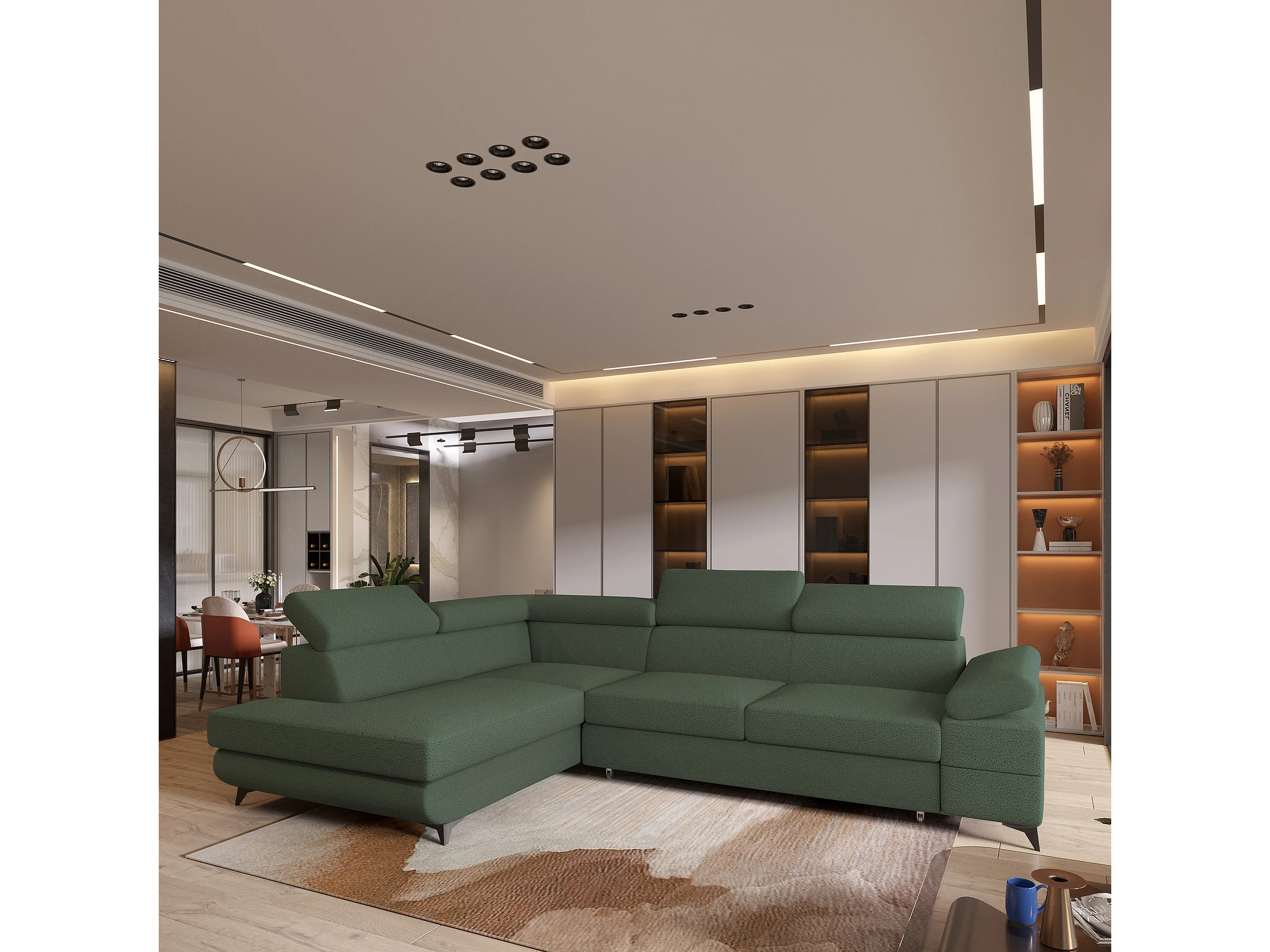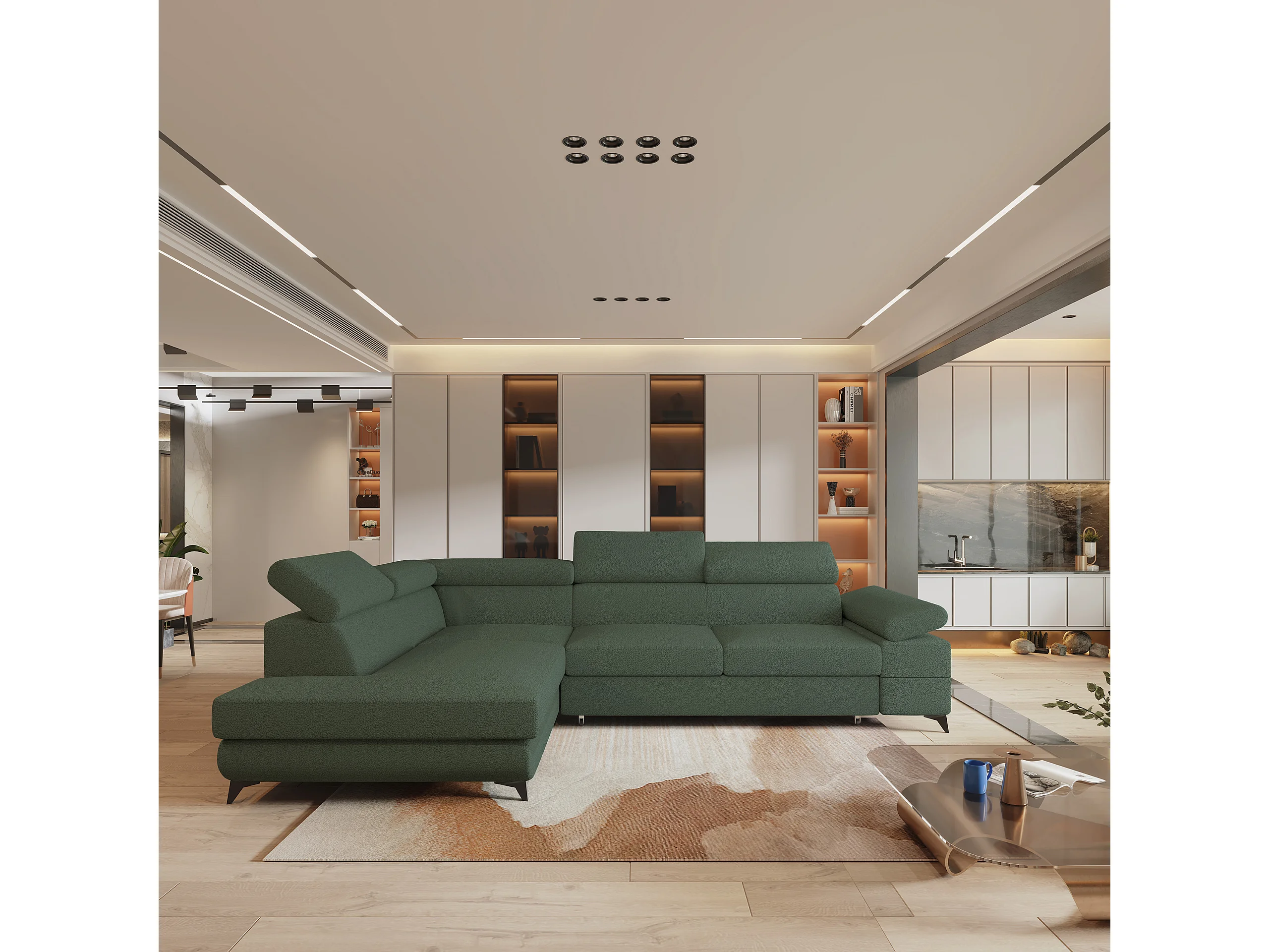 Hoekbank FAVIEN van fluweel met slaapfunctie Grün