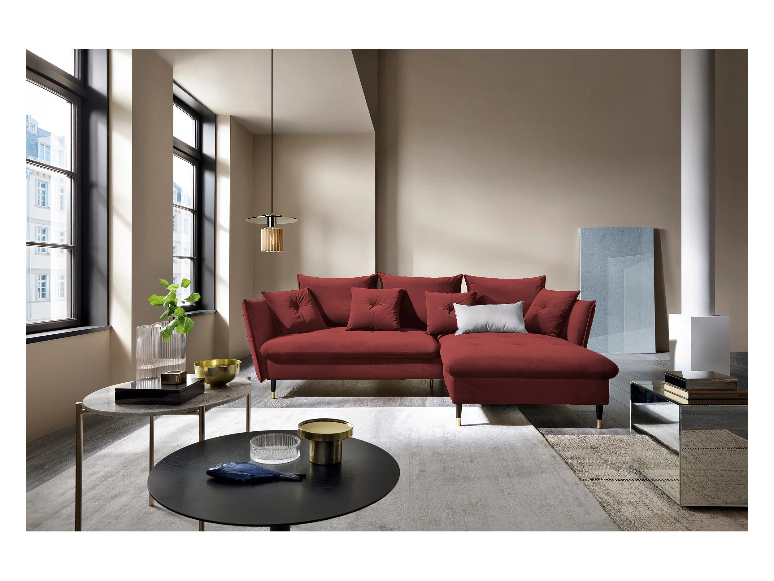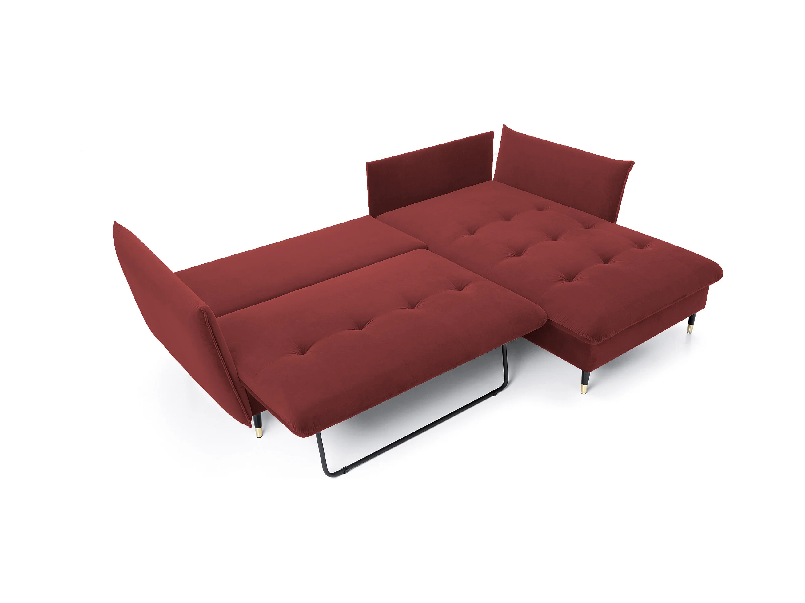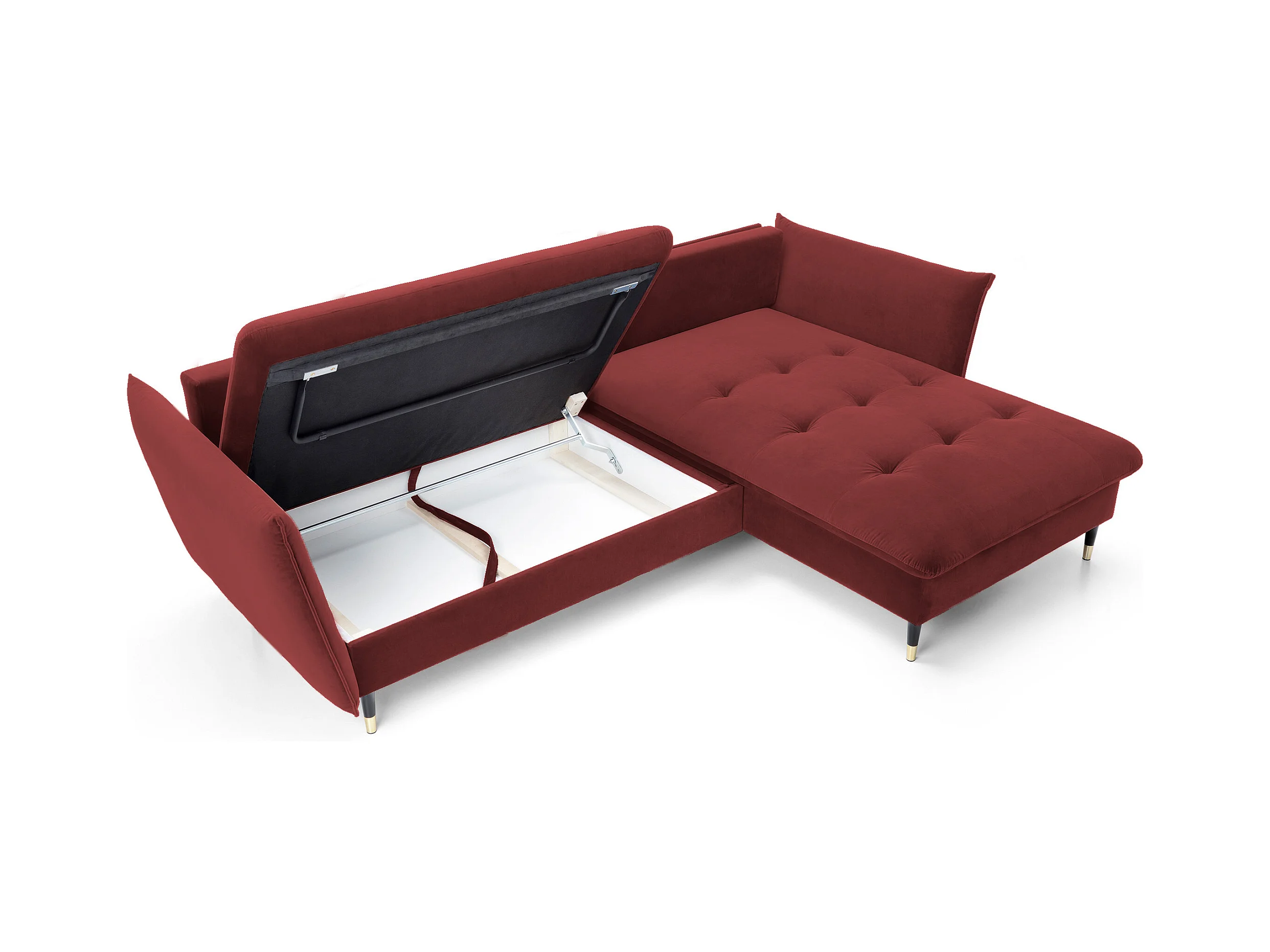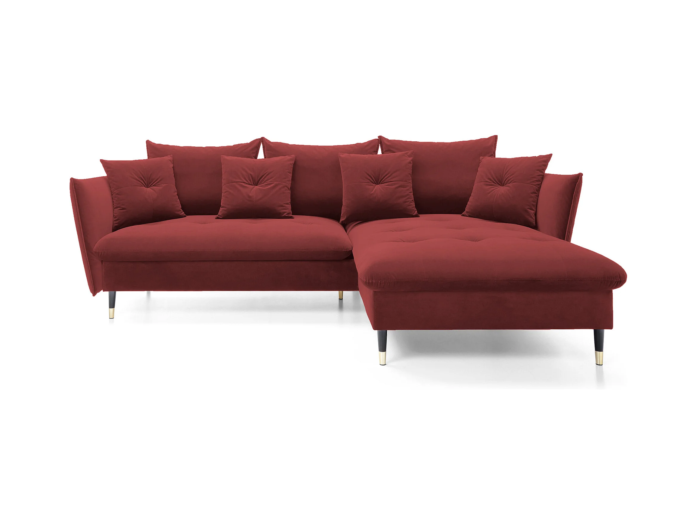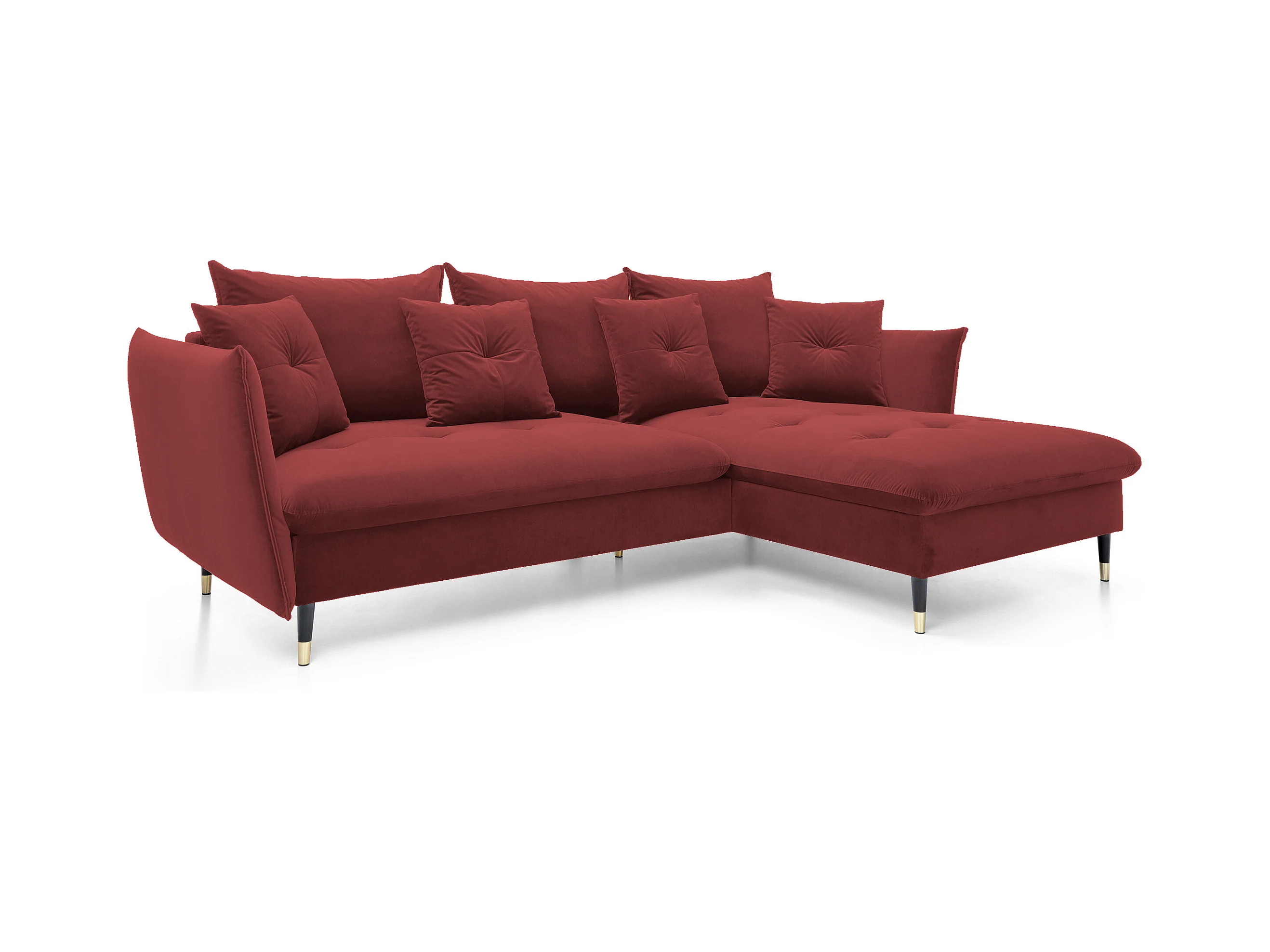Hoekbank GLAM met slaapfunctie, ottomane & gouden poten – fluwelen bank in glamstijl met sierkussens, 258x167x91cm, Rechterkant BURGUNDY
