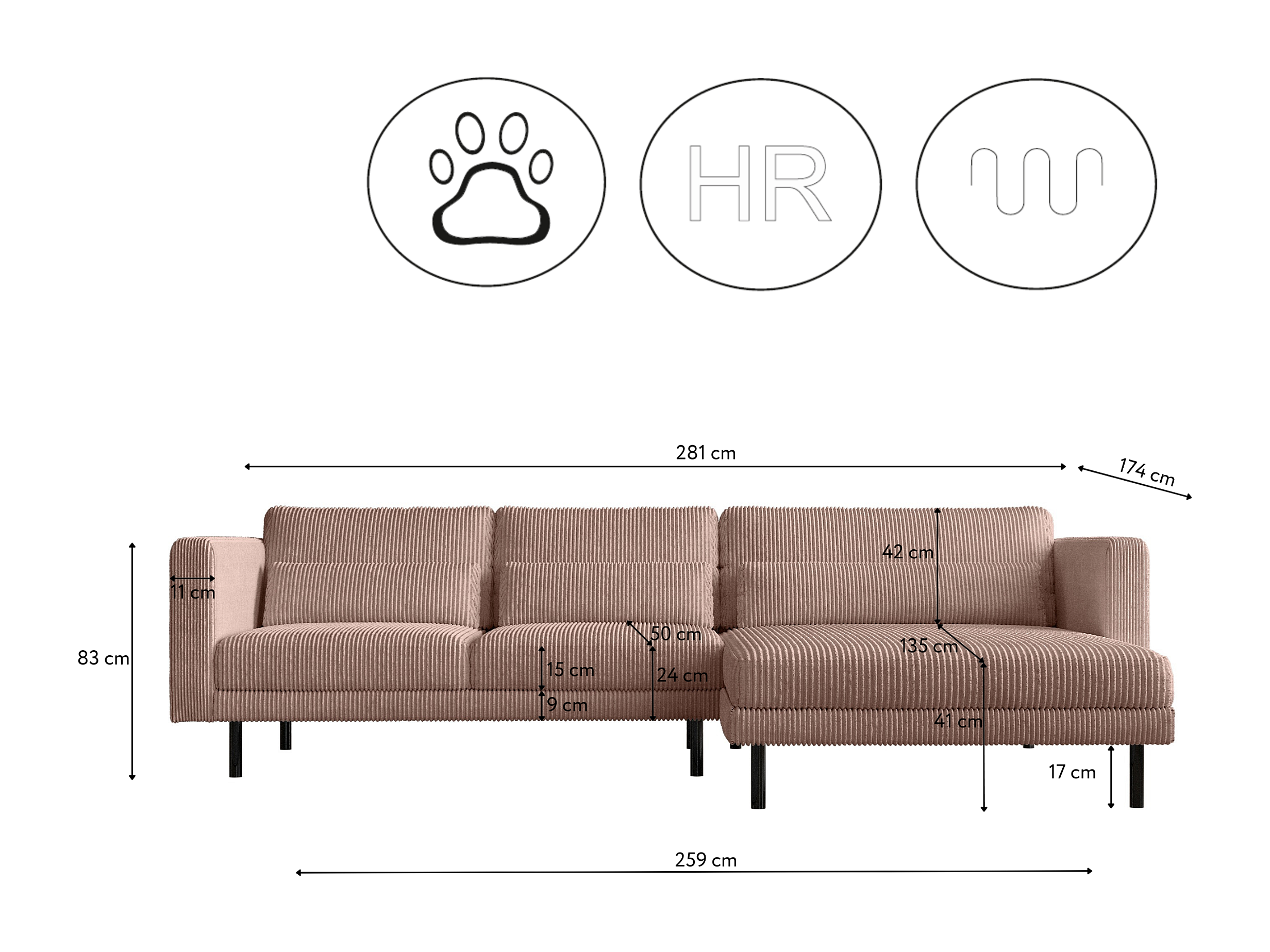 Hoekbank L-vorm Dani stof Poso Rosa Rechts