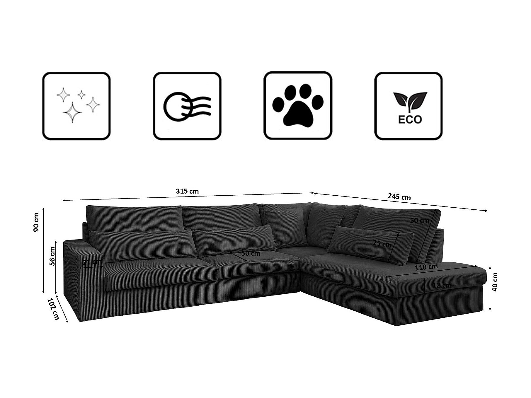 Hoekbank L-vorm SVEN stof Poso Graphite Rechts
