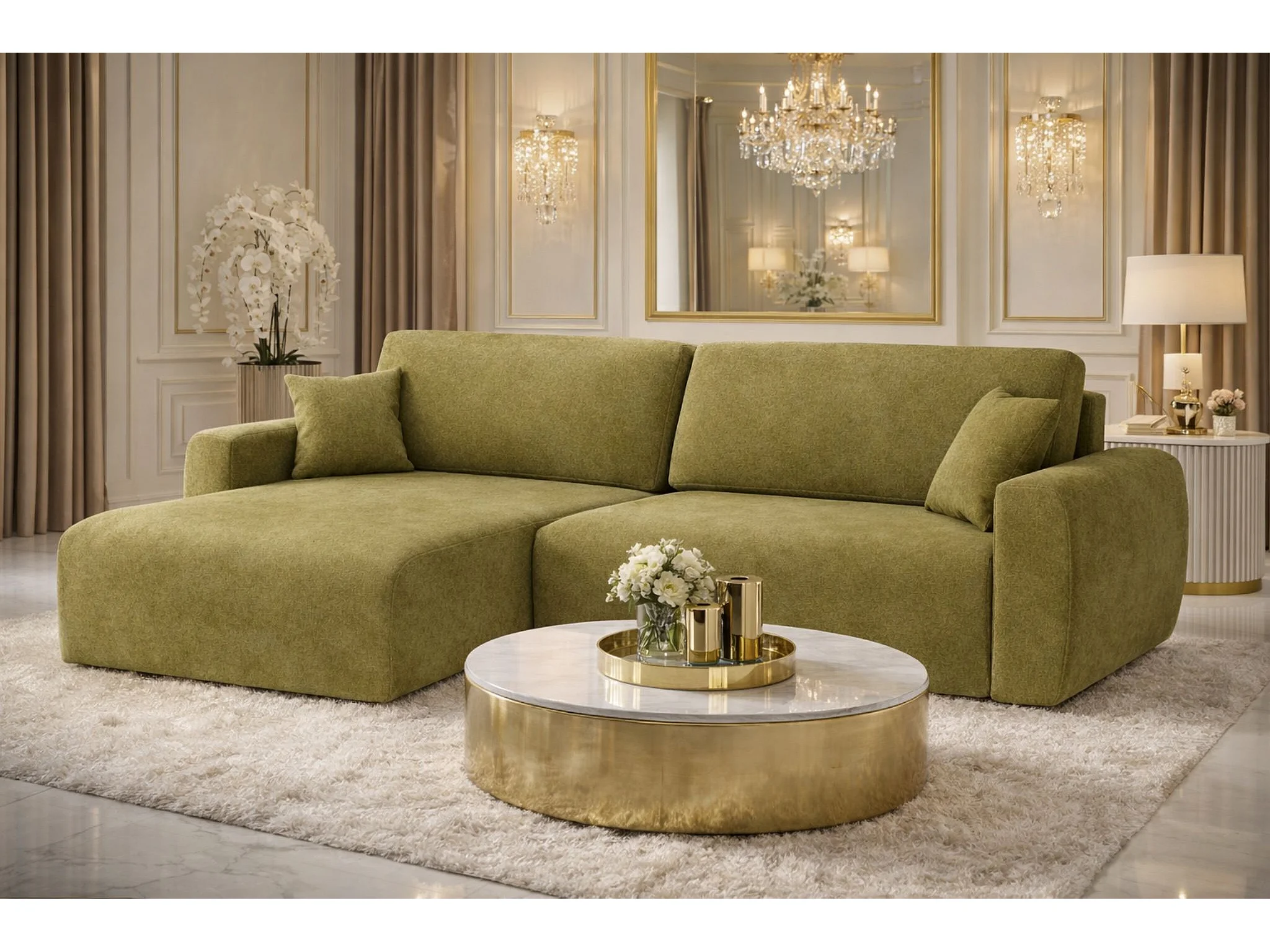 Hoekbank met slaapfunctie en opbergruimte Ariel L, velours, stof Salvador, olijfgroen, links