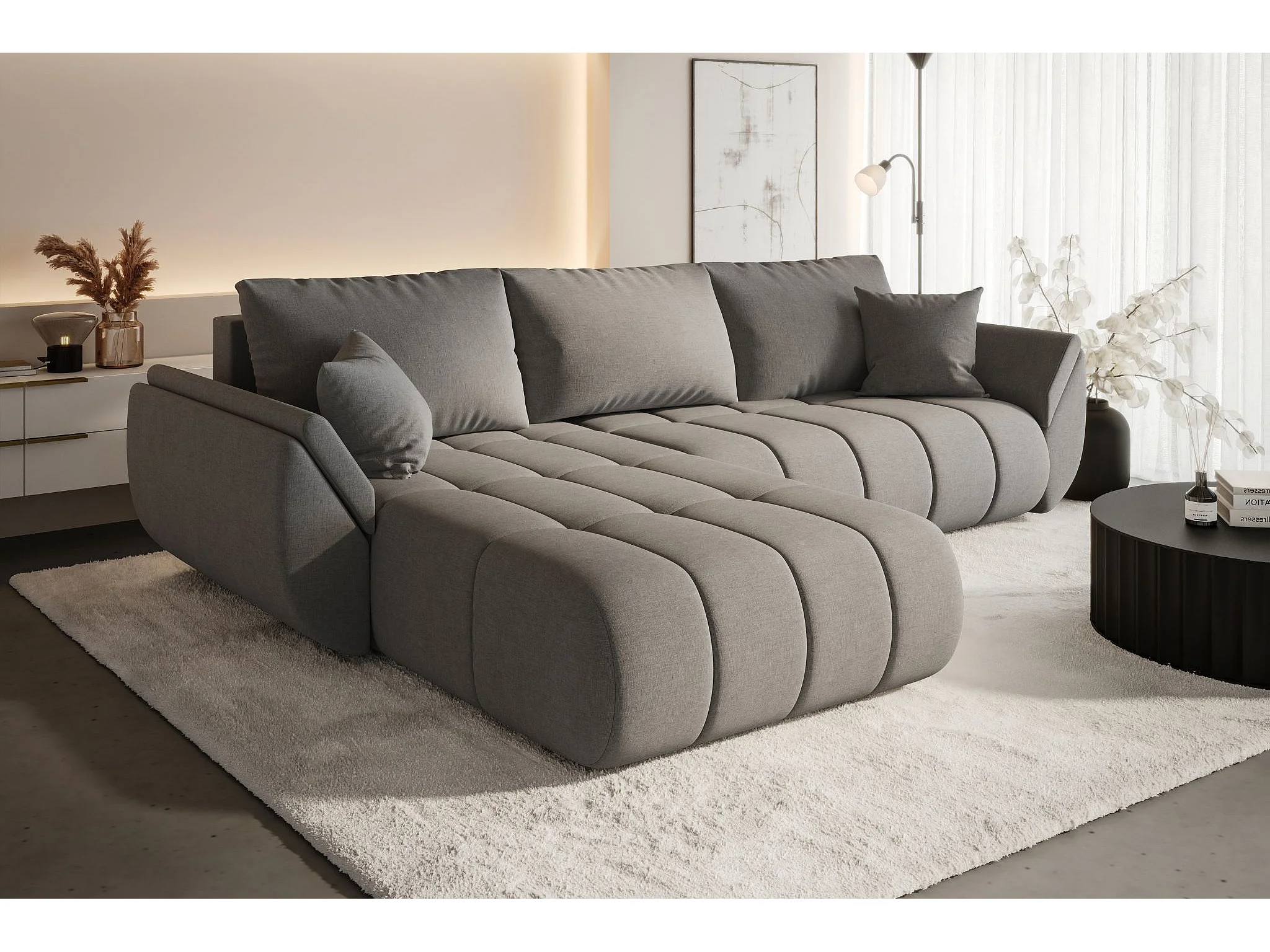 Hoekbank met slaapfunctie en opbergvak TOKYO PREMIUM, stof WIND, bruingrijs, links