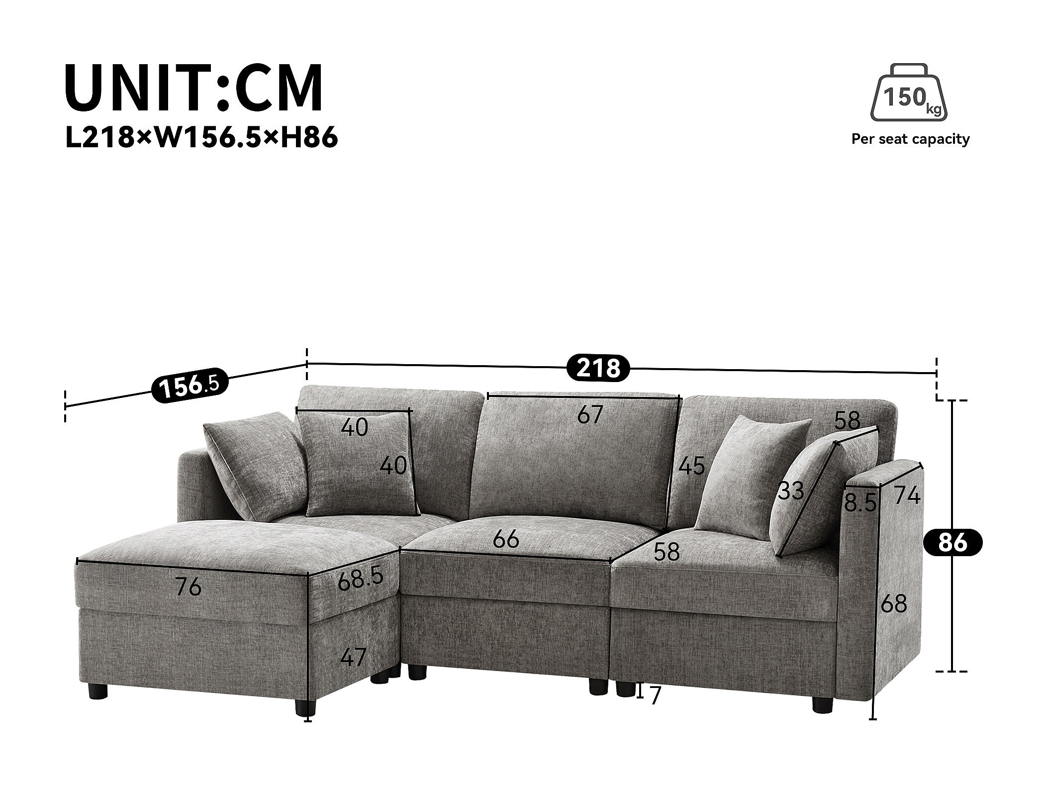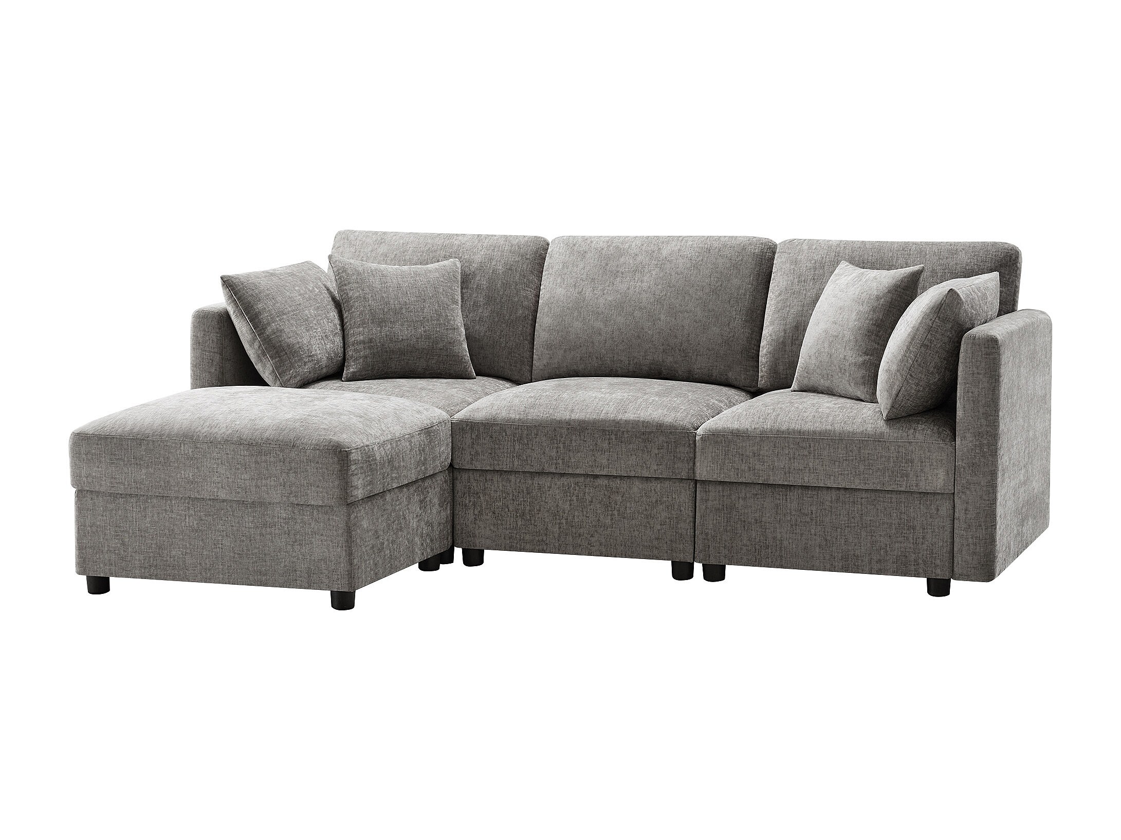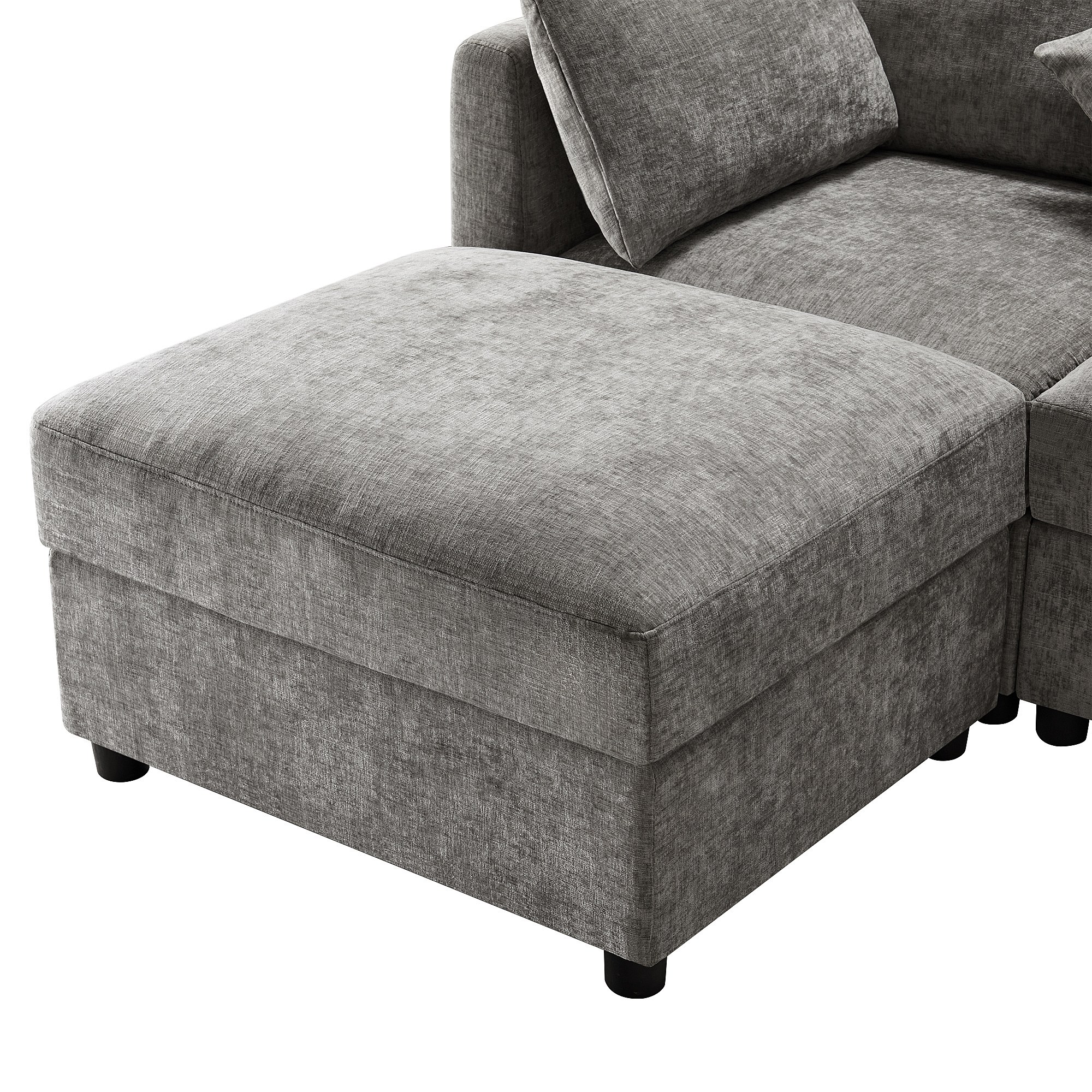 Hoekbank met voetenbank - 4-zitsbank met 4 kussens en verstelbare armleuningen - grijze chenille stof