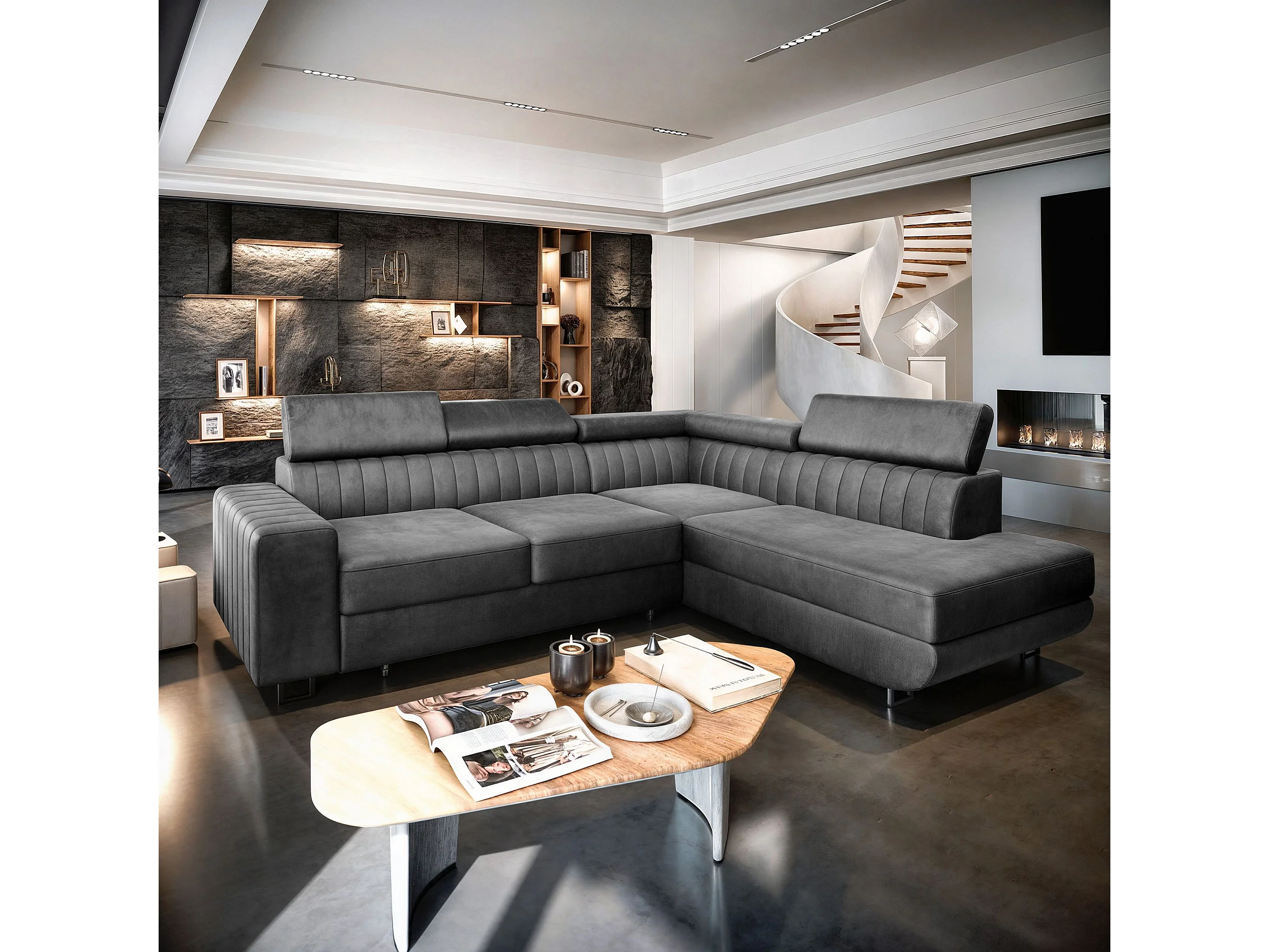 Hoekbank NOLA van fluweel met slaapfunctie Grau