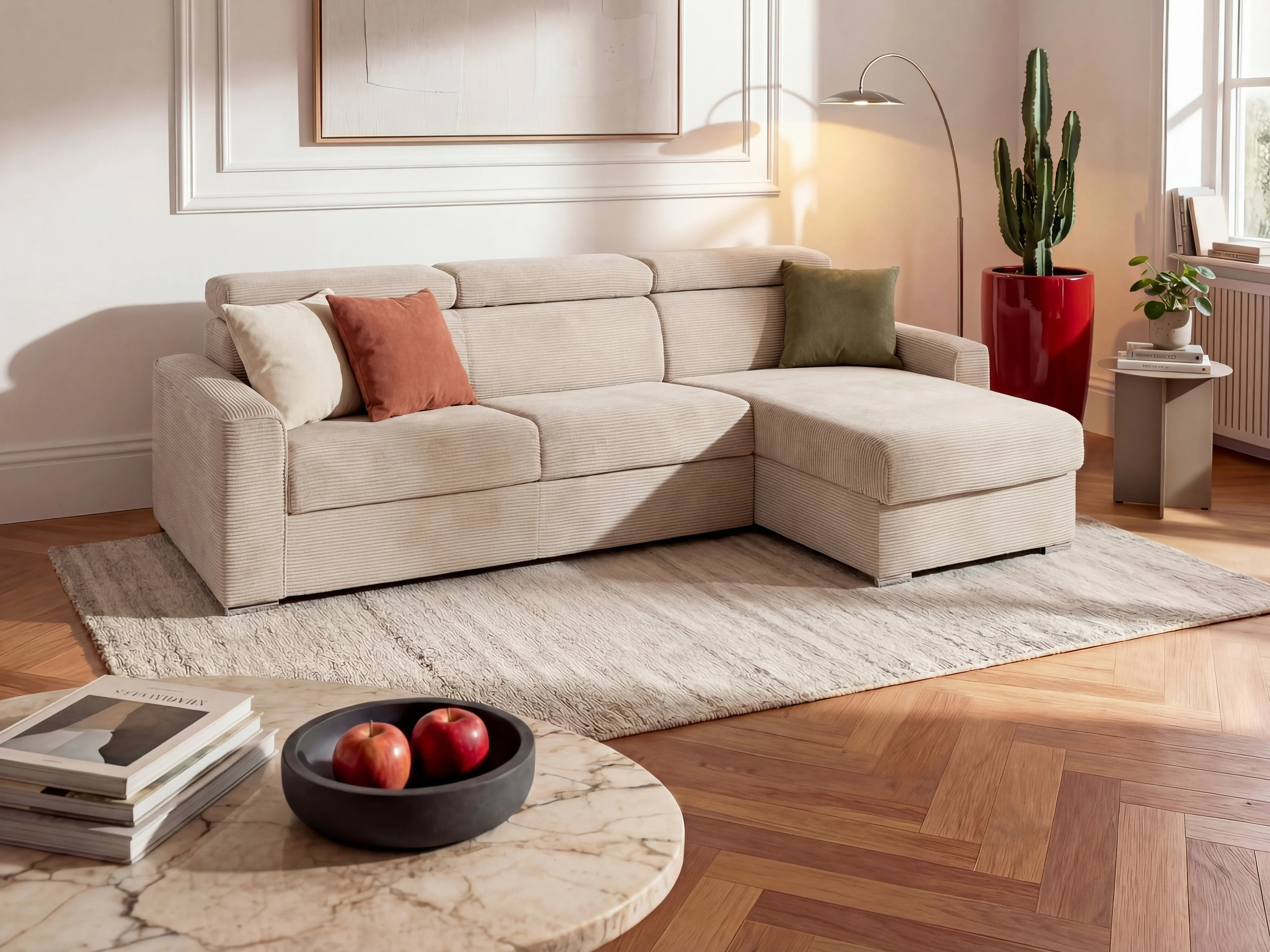 Omkeerbare express-hoekslaapbank van beige ribfluweel - Bed 160 cm - Matras 22 cm - VIZIR