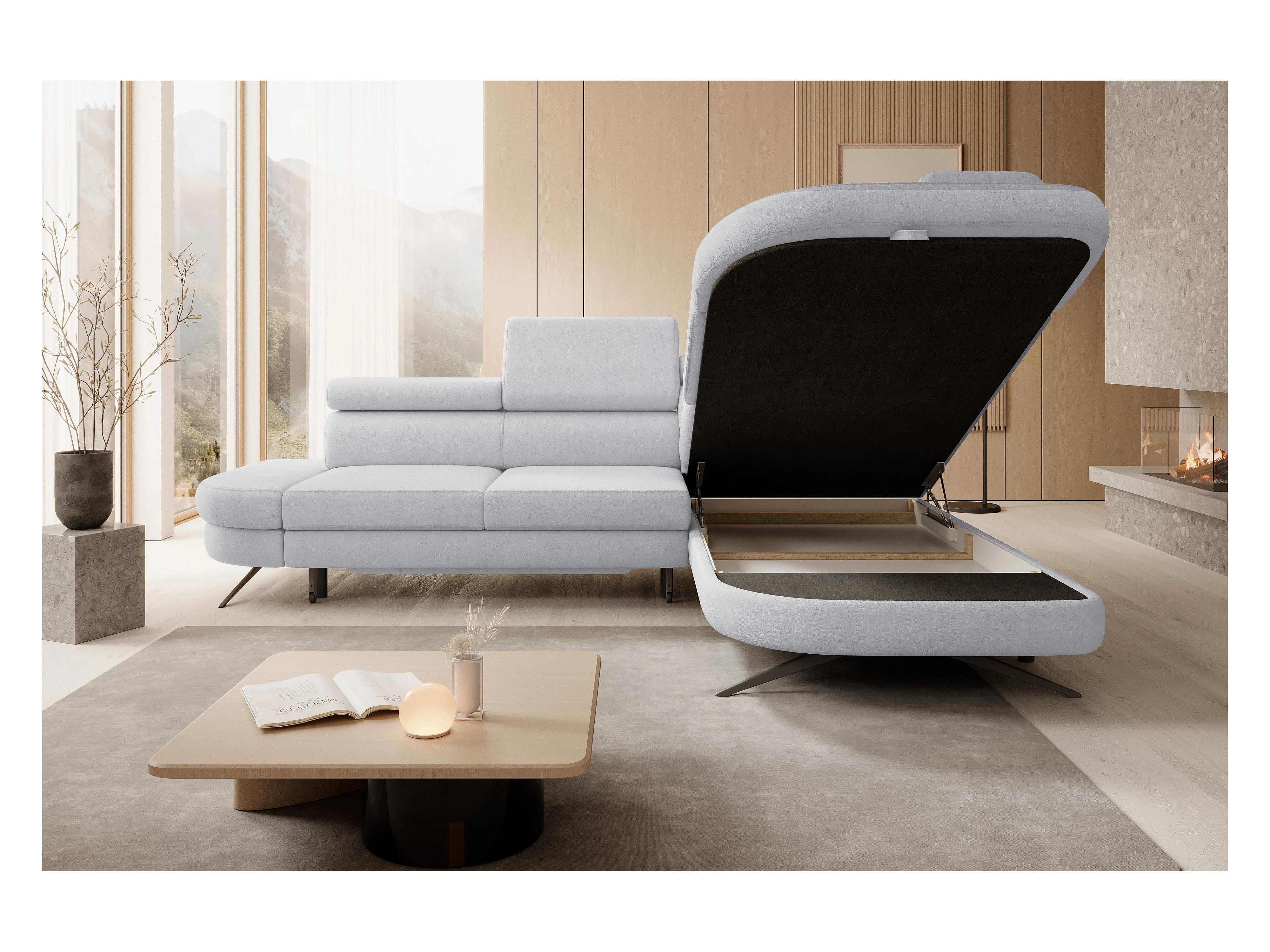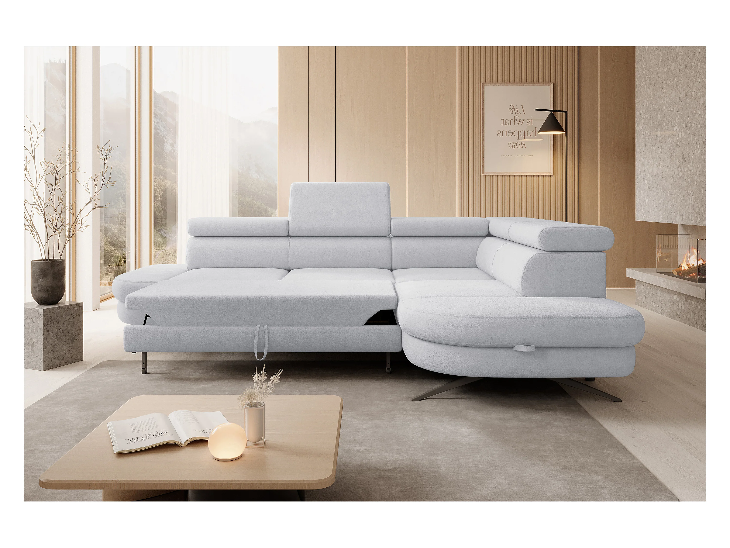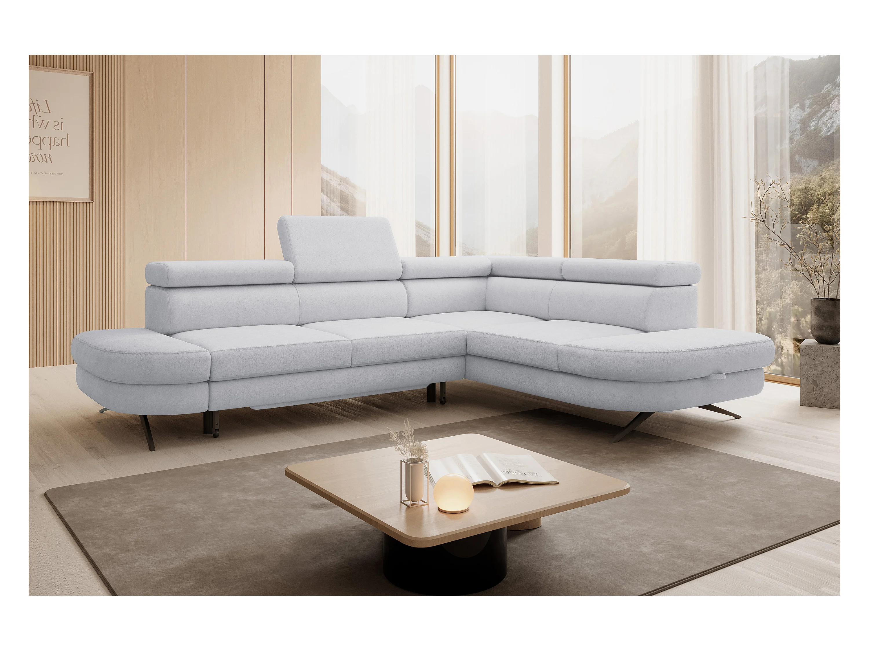 Hoekbank OTIS met slaapfunctie 131x207 cm, verstelbare hoofdsteunen, AURORA, rechteropstelling, 276x218x97 cm, lichtgrijs