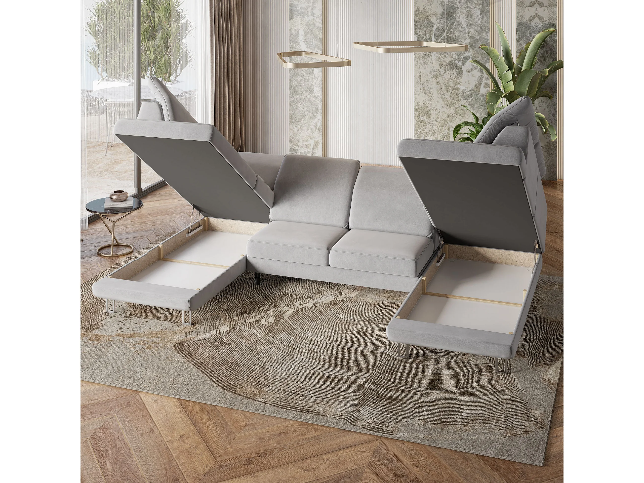 Hoekbank TERAMO van fluweel met slaapfunctie Grau