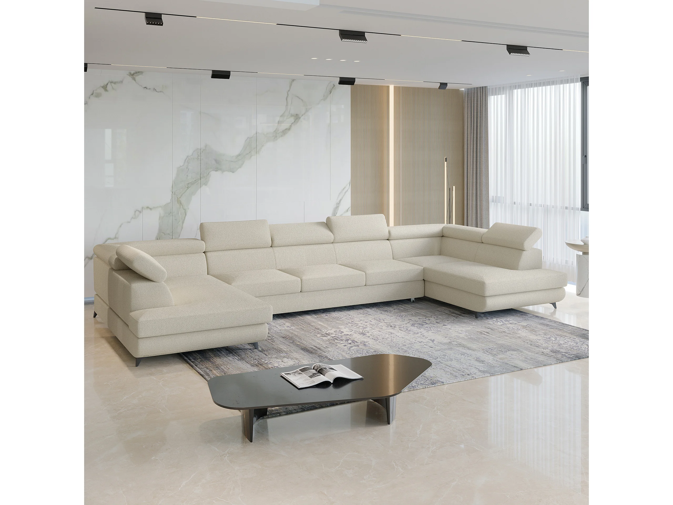 Hoekbank URMANO van fluweel met slaapfunctie Creme