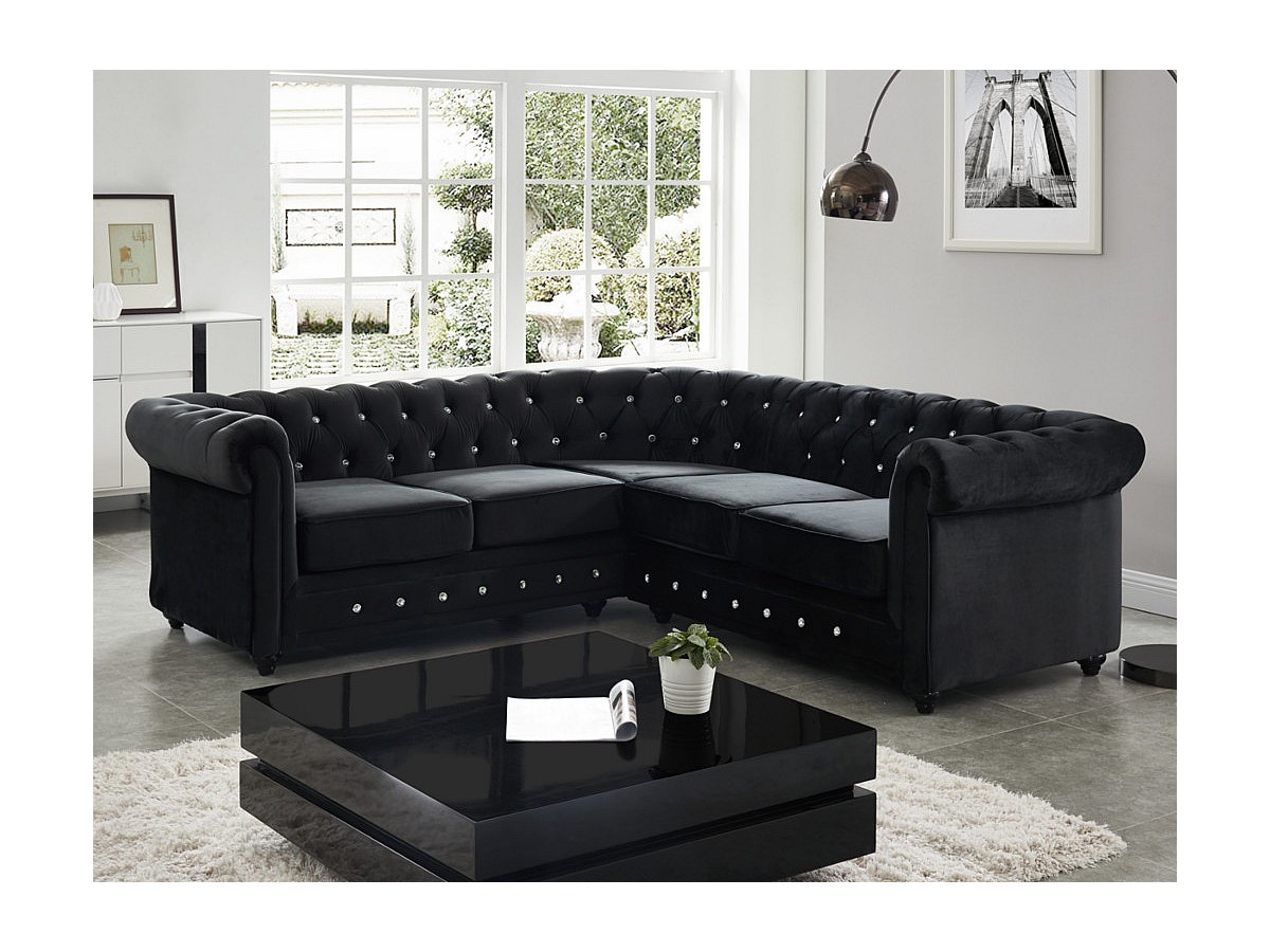 Hoekbank van fluweel CHESTERFIELD - Zwart met kristallen knopen