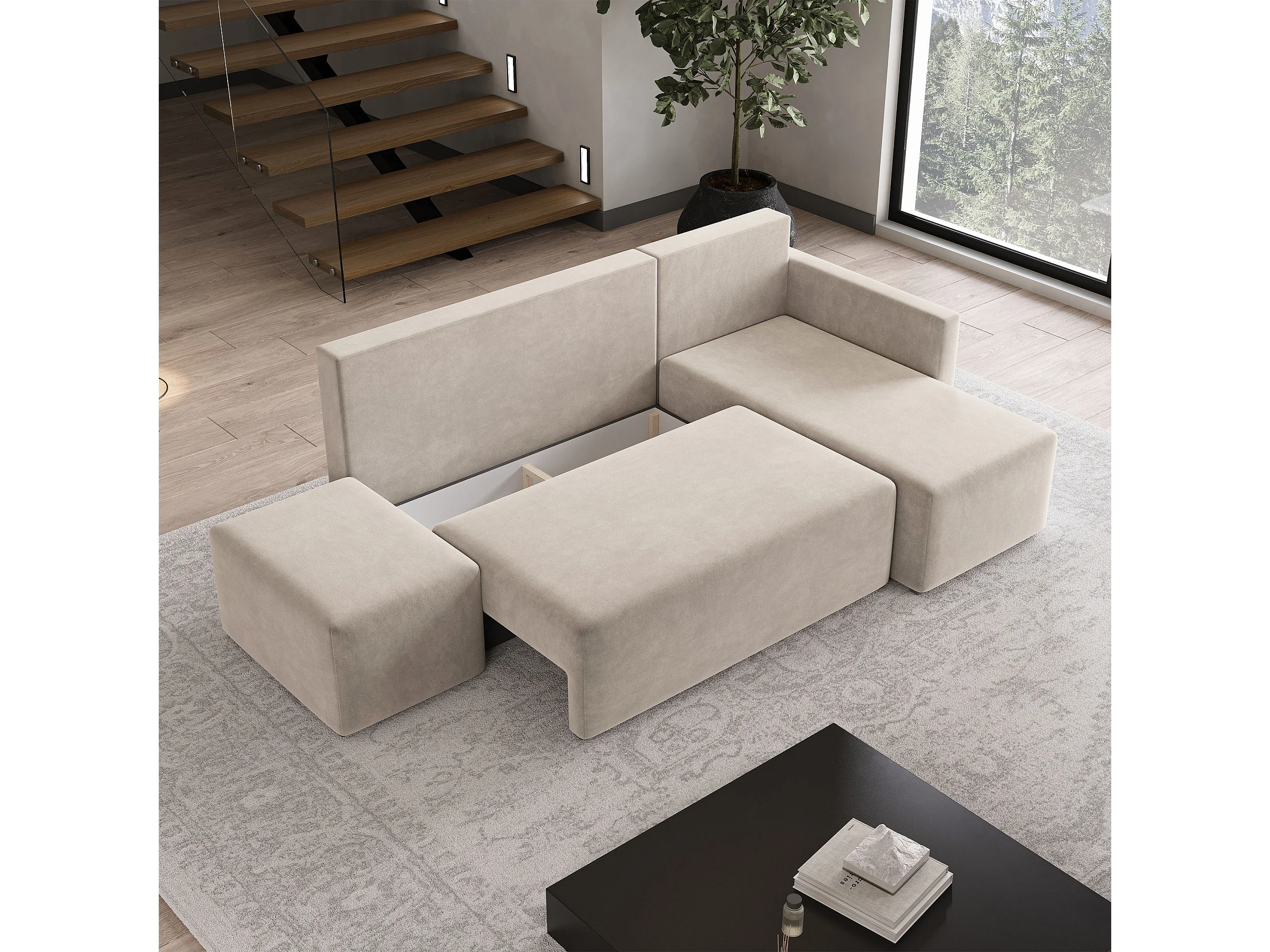 Hoekbank VELOTTI van fluweel met slaapfunctie Beige