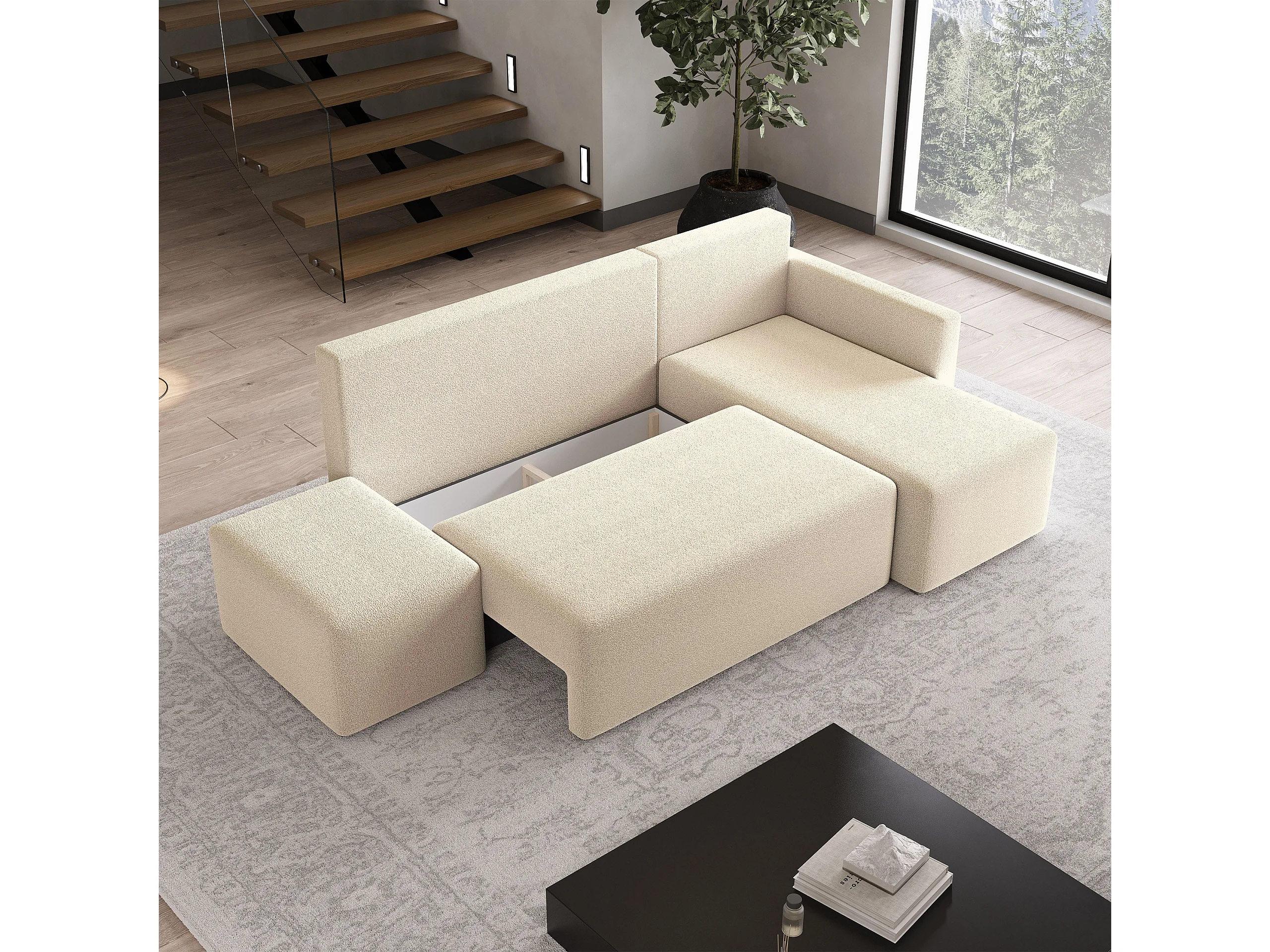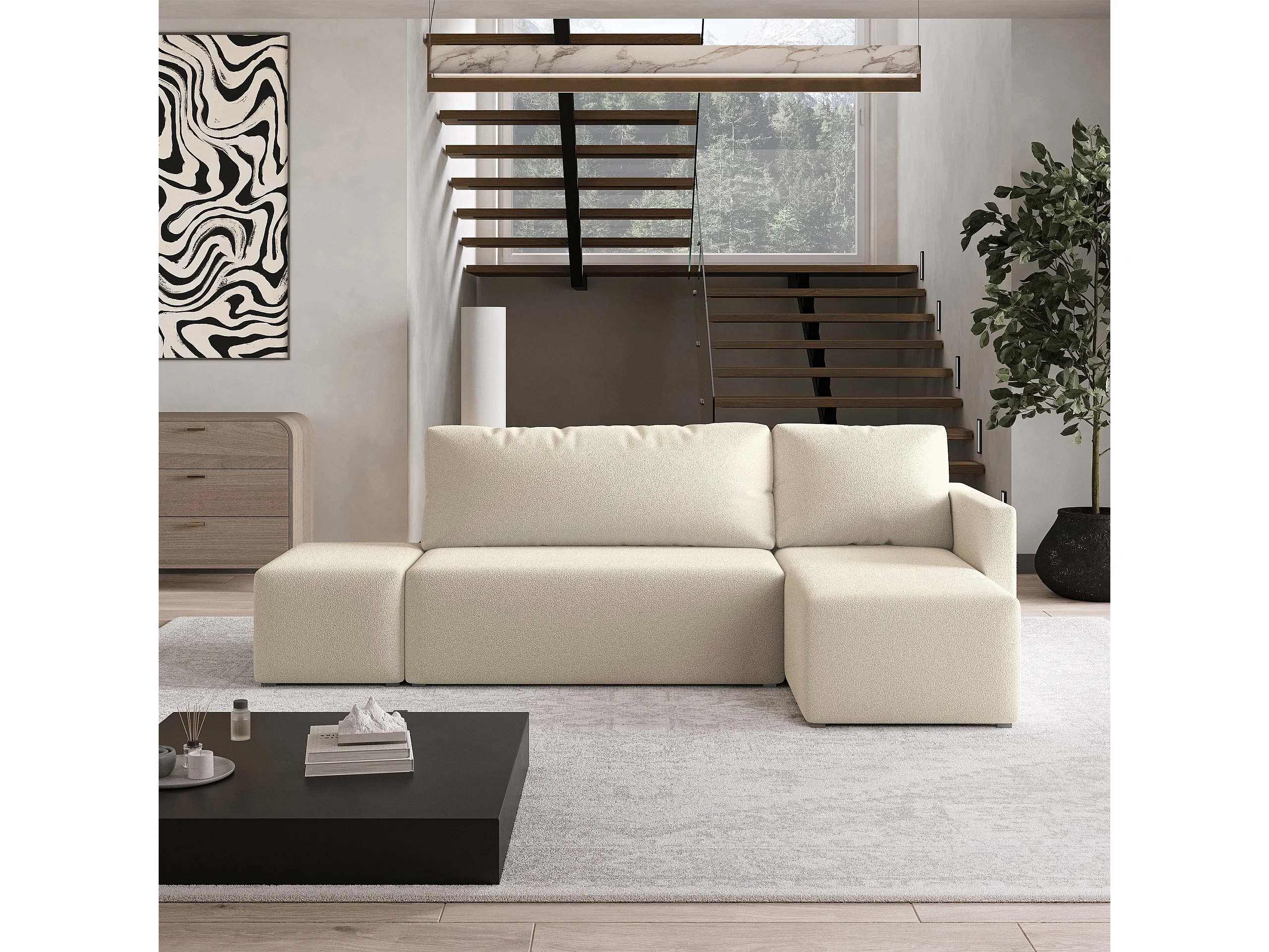 Hoekbank VELOTTI van fluweel met slaapfunctie Creme