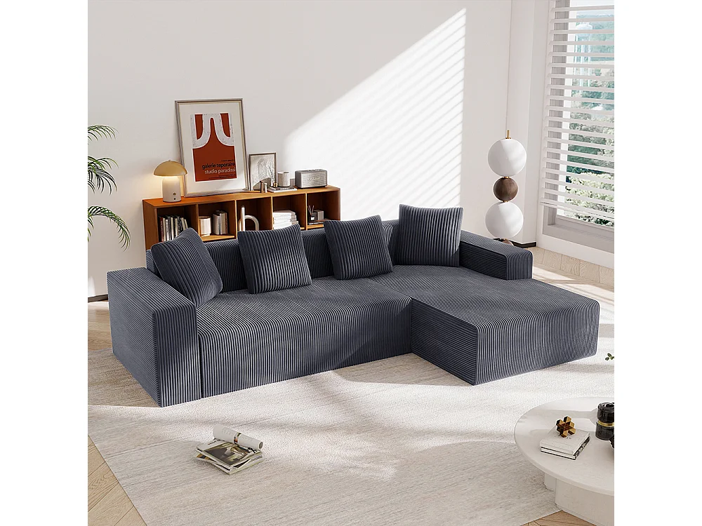 Hoekbankcombinatie Cloud met L-vormige ligstoelen, moderne modulaire bank met diepe zittingen, grijze gestoffeerde bank