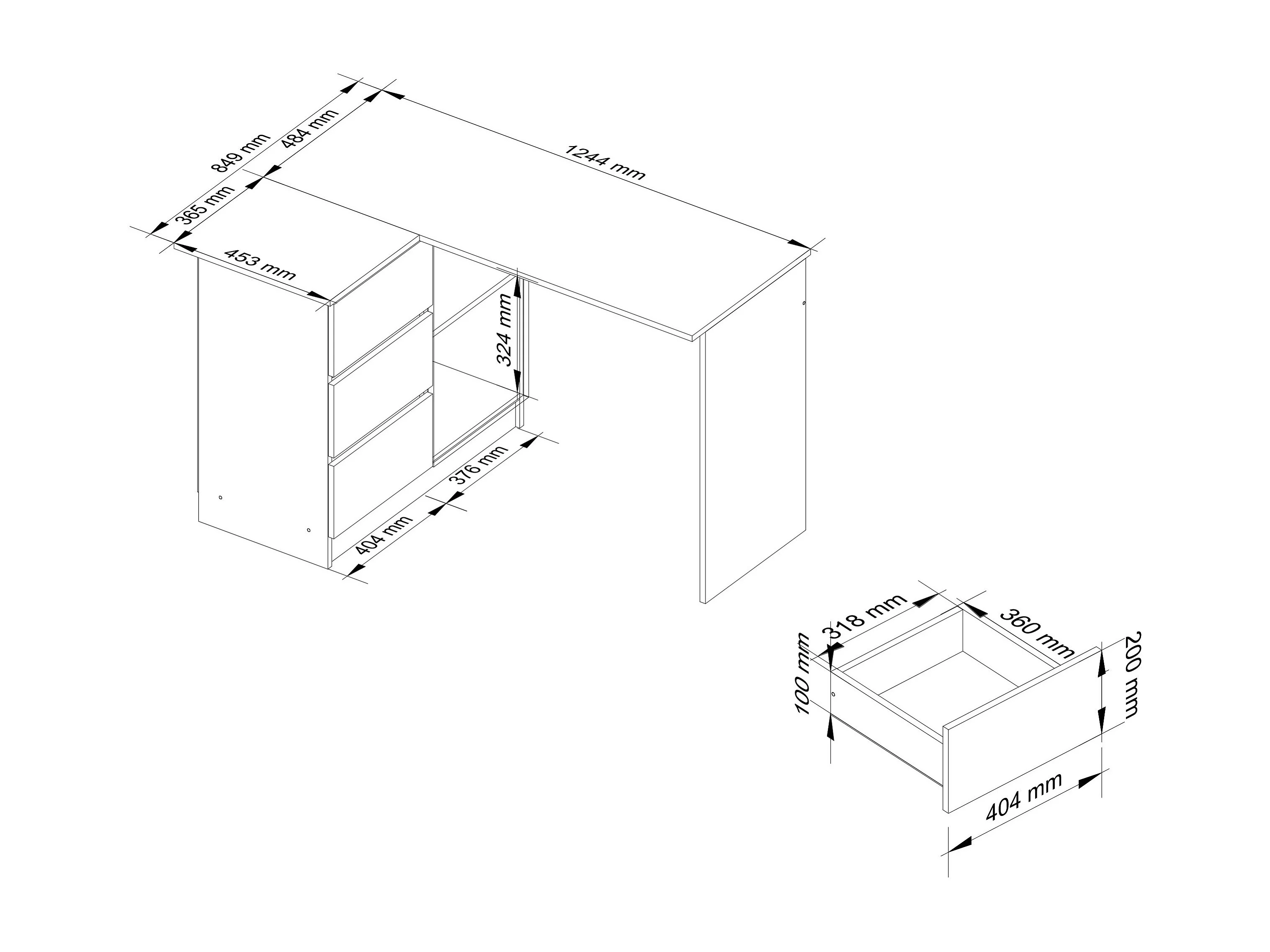 Hoekbureau B16 - 124 cm Links - 3 Laden - Wit/Sonoma Eiken - Mat - Zelfmontage - Functioneel Design