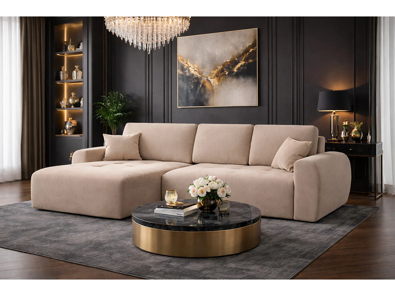 Hoekslaapbank met slaapfunctie en opbergruimte, L-vorm, Ivo L, veloursstof Salvador, Beige, Links