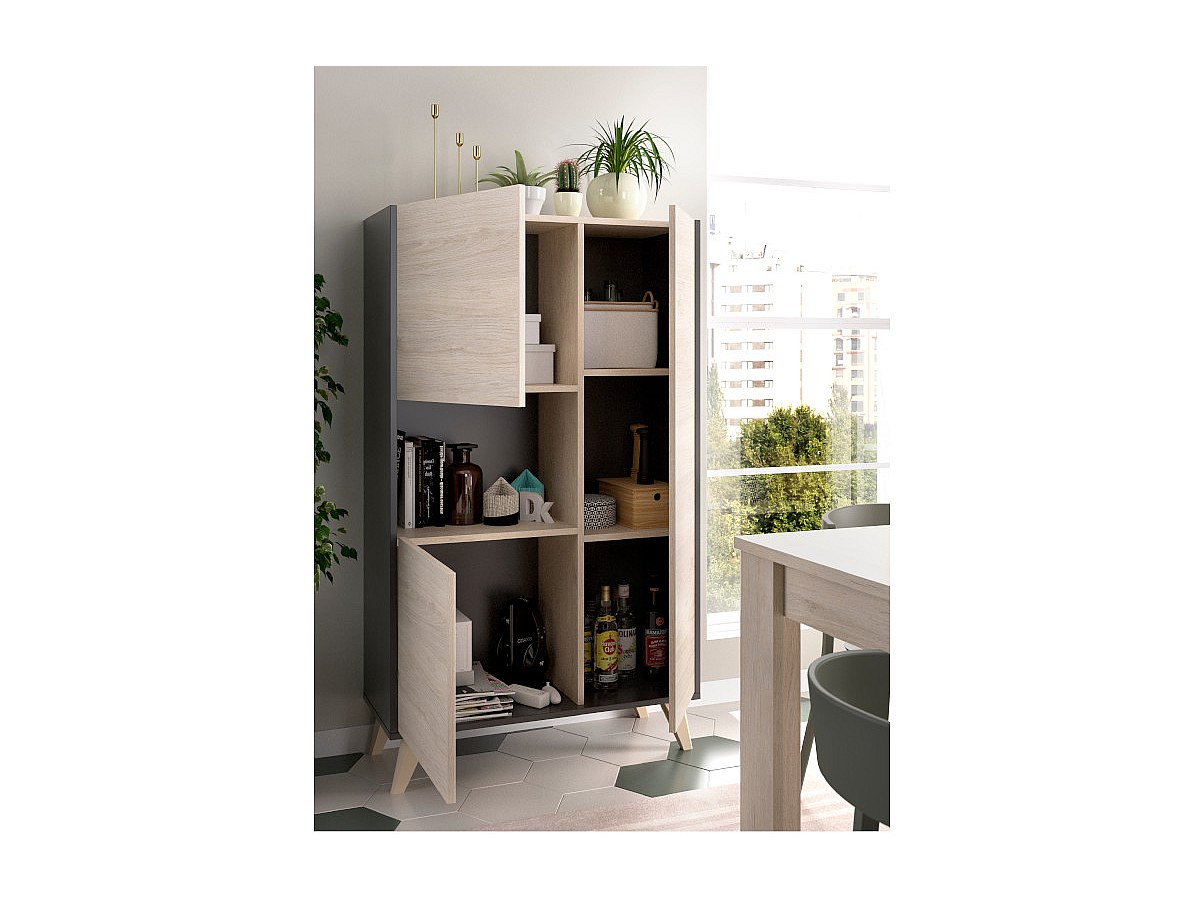 Hoge buffetkast KOLYMA - 3 deuren en 1 nis - Kleur: eiken en antraciet
