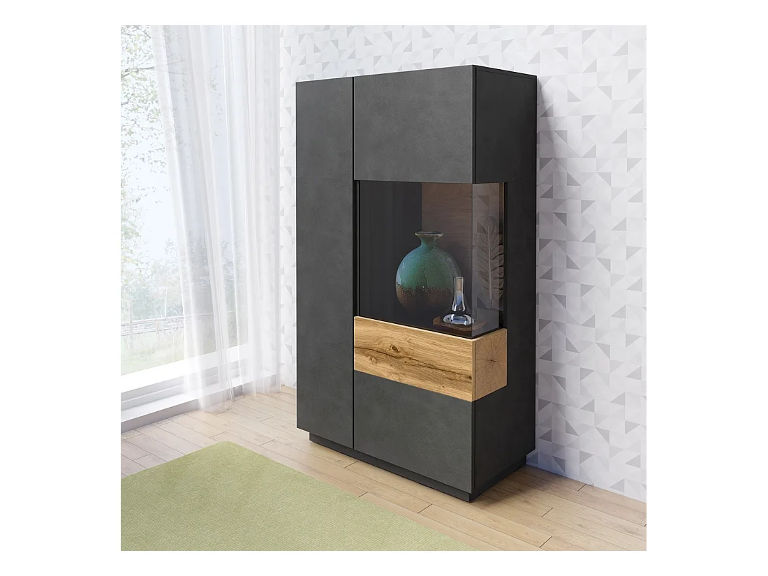 Hoge buffetkast met LED uit de KILES collectie met twee deuren. Kleur antracietgrijs en eiken. Glazen deur aan de rechterkant.