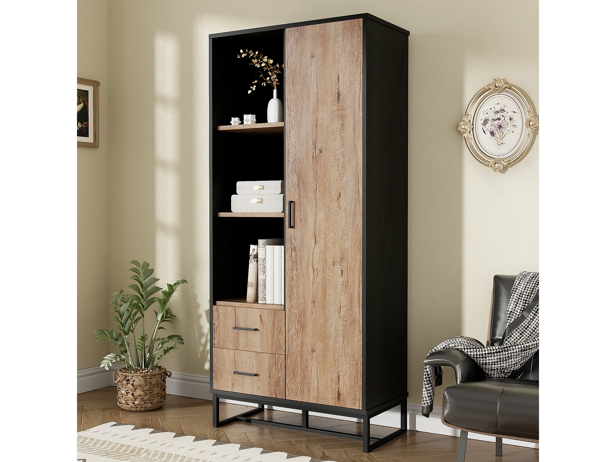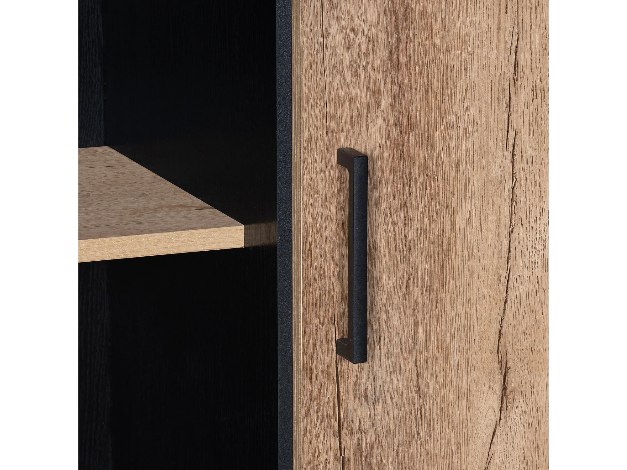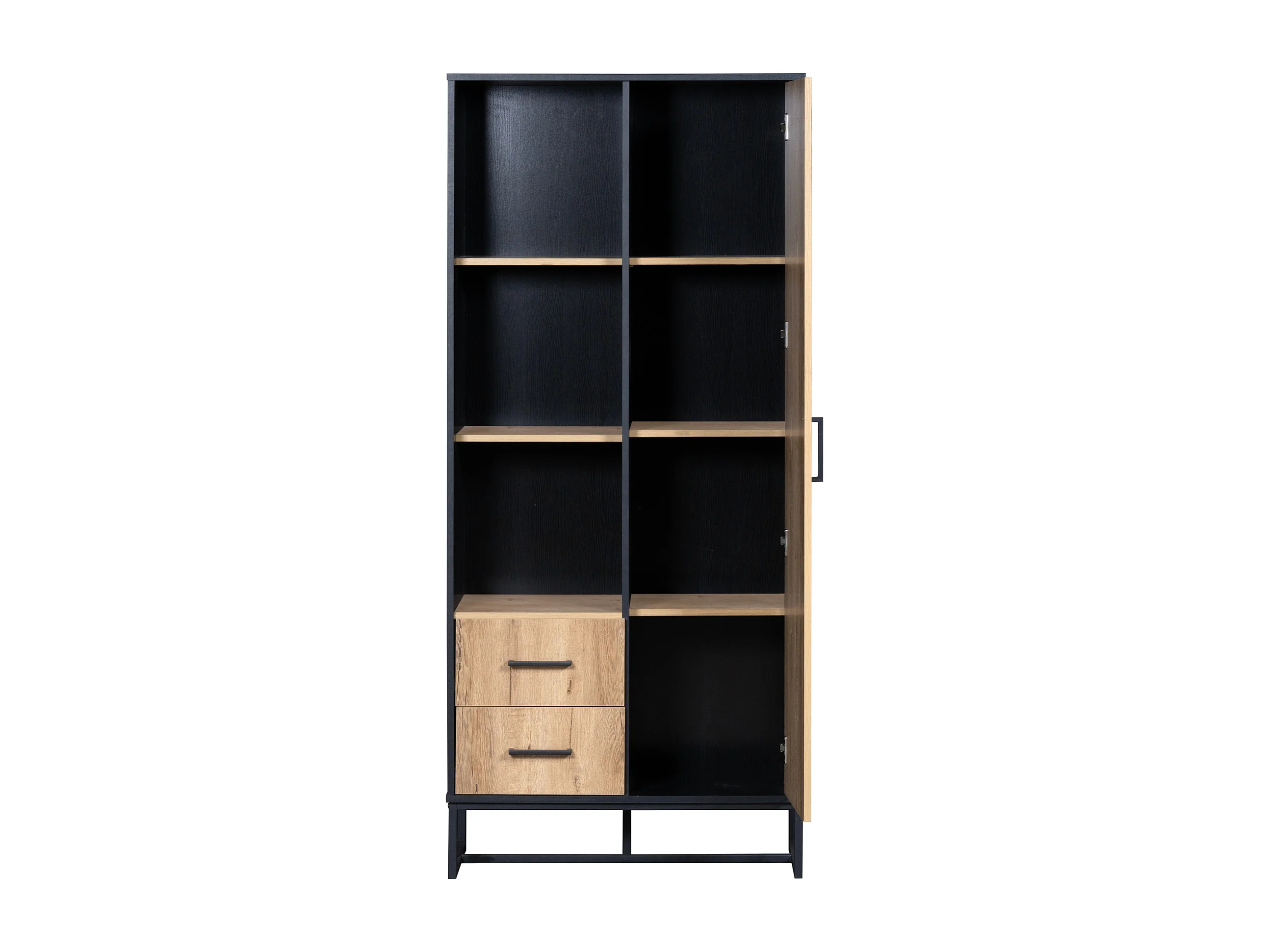 Hoge dressoir met 1 deur, 2 lades en 3 open planken, zwart en eiken