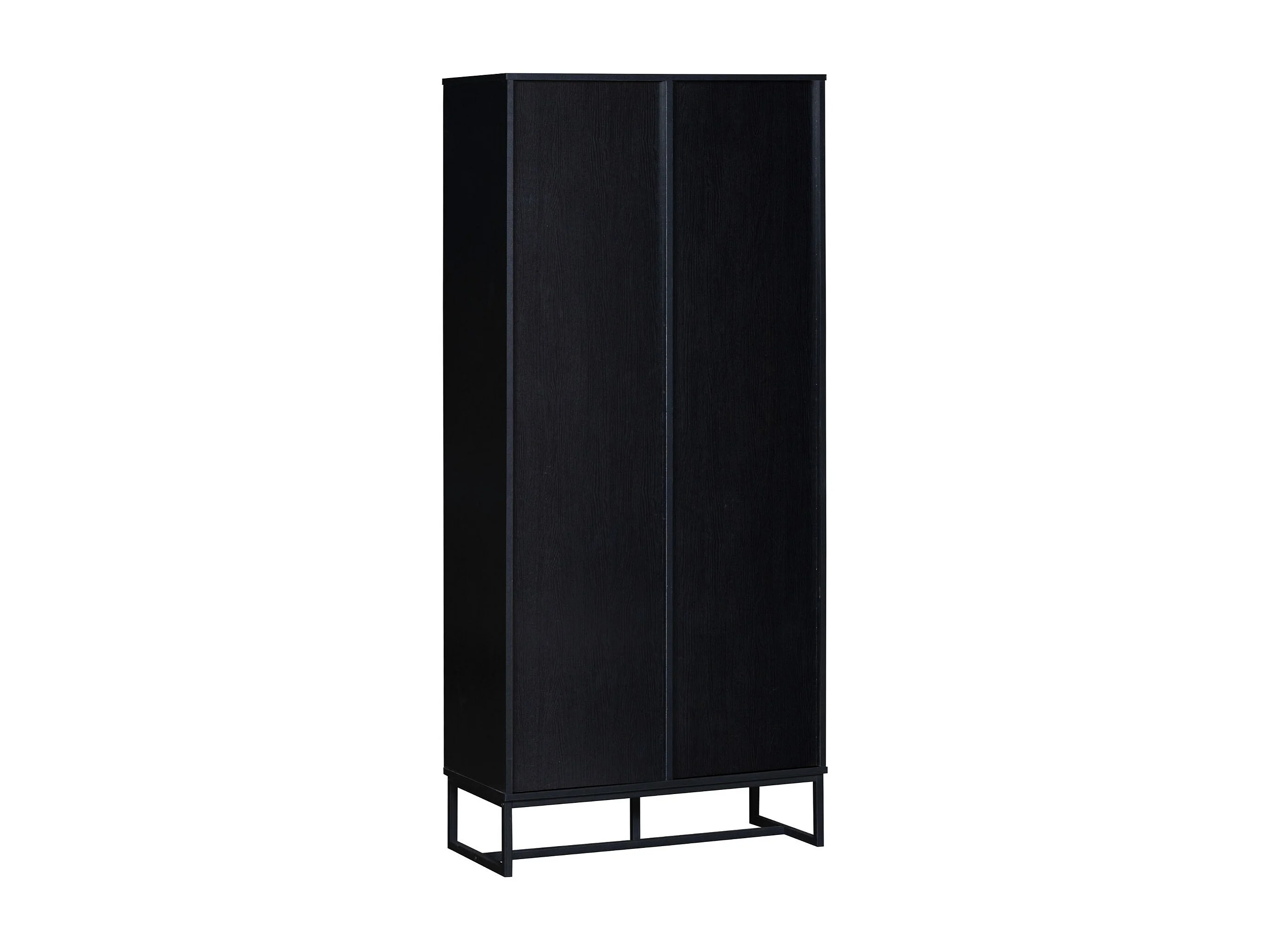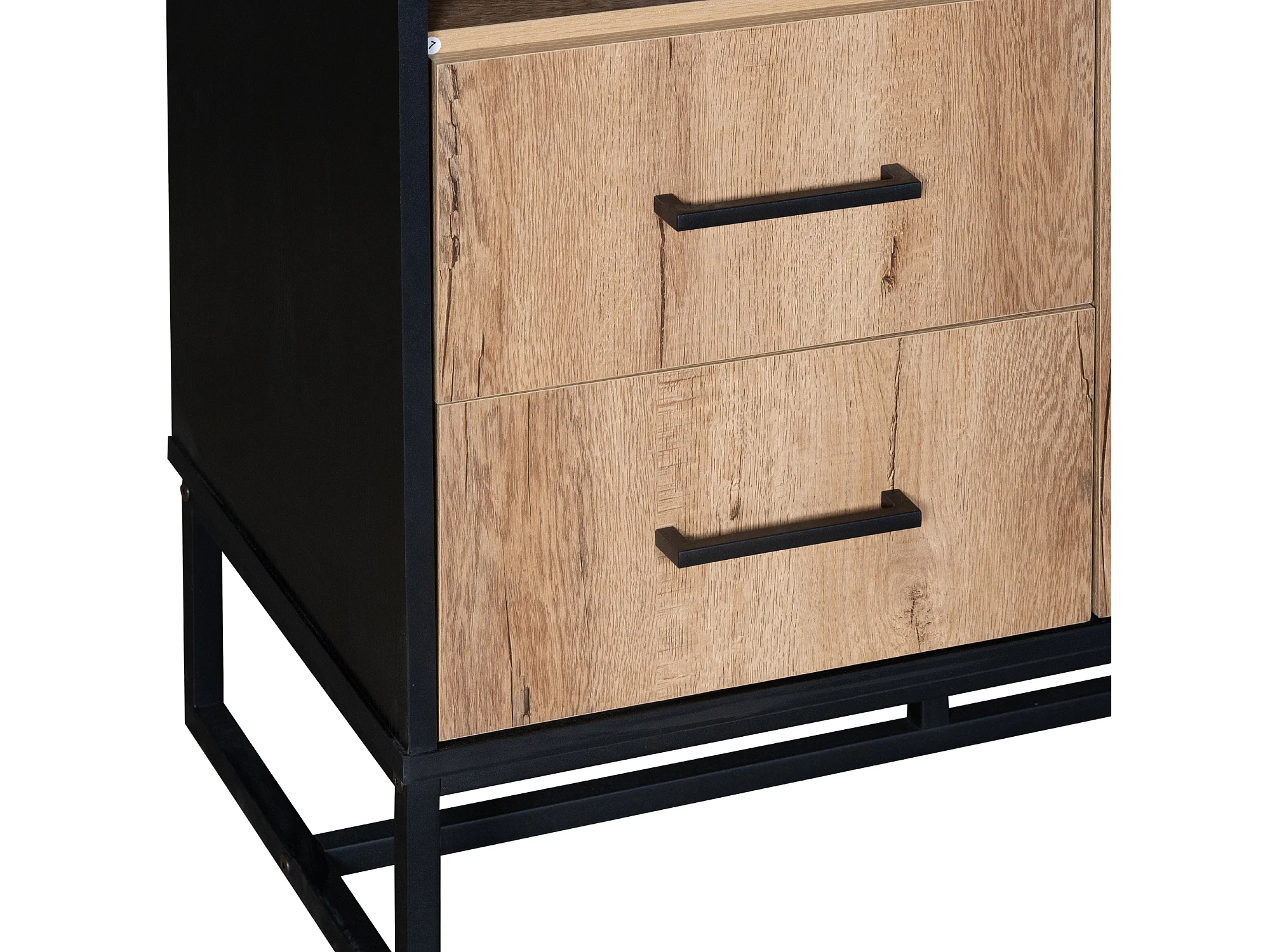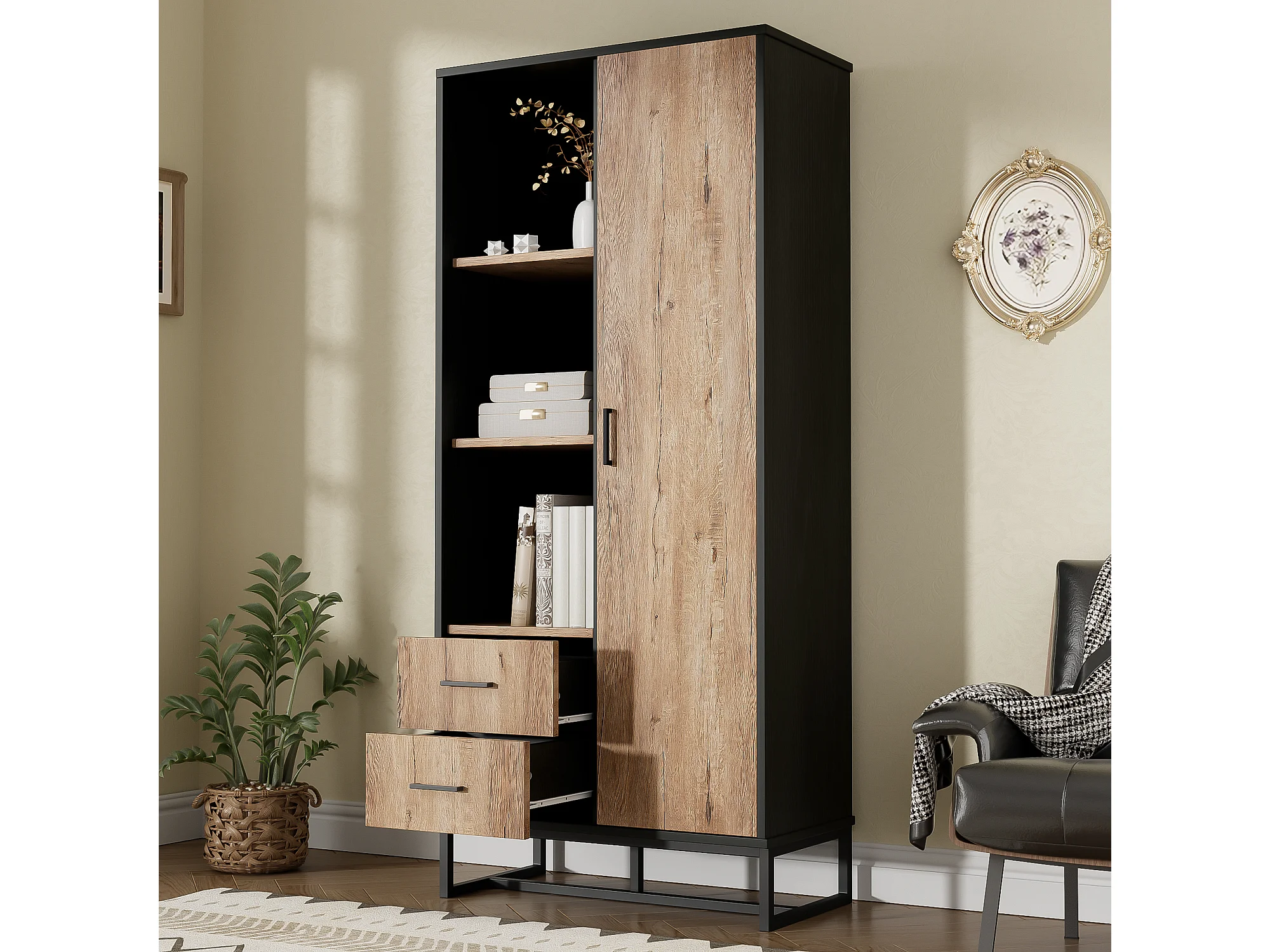 Hoge dressoir met 1 deur, 2 lades en 3 open planken, zwart en eiken