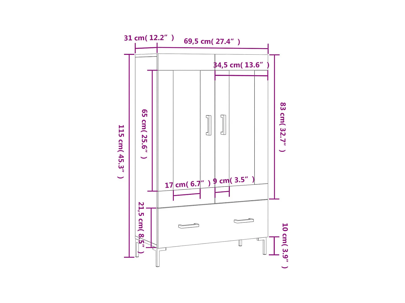 Hoge kast 69,5x31x115 cm bewerkt hout bruin eikenkleur