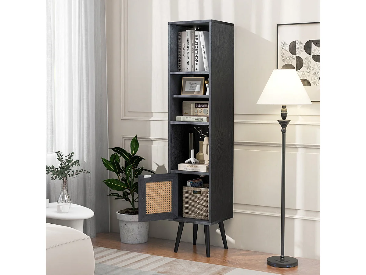 Hoge, smalle, vrijstaande rotan opbergkast met deur en verstelbare plank voor woonkamer, 29,5 x 29,5 x 137 cm, zwart