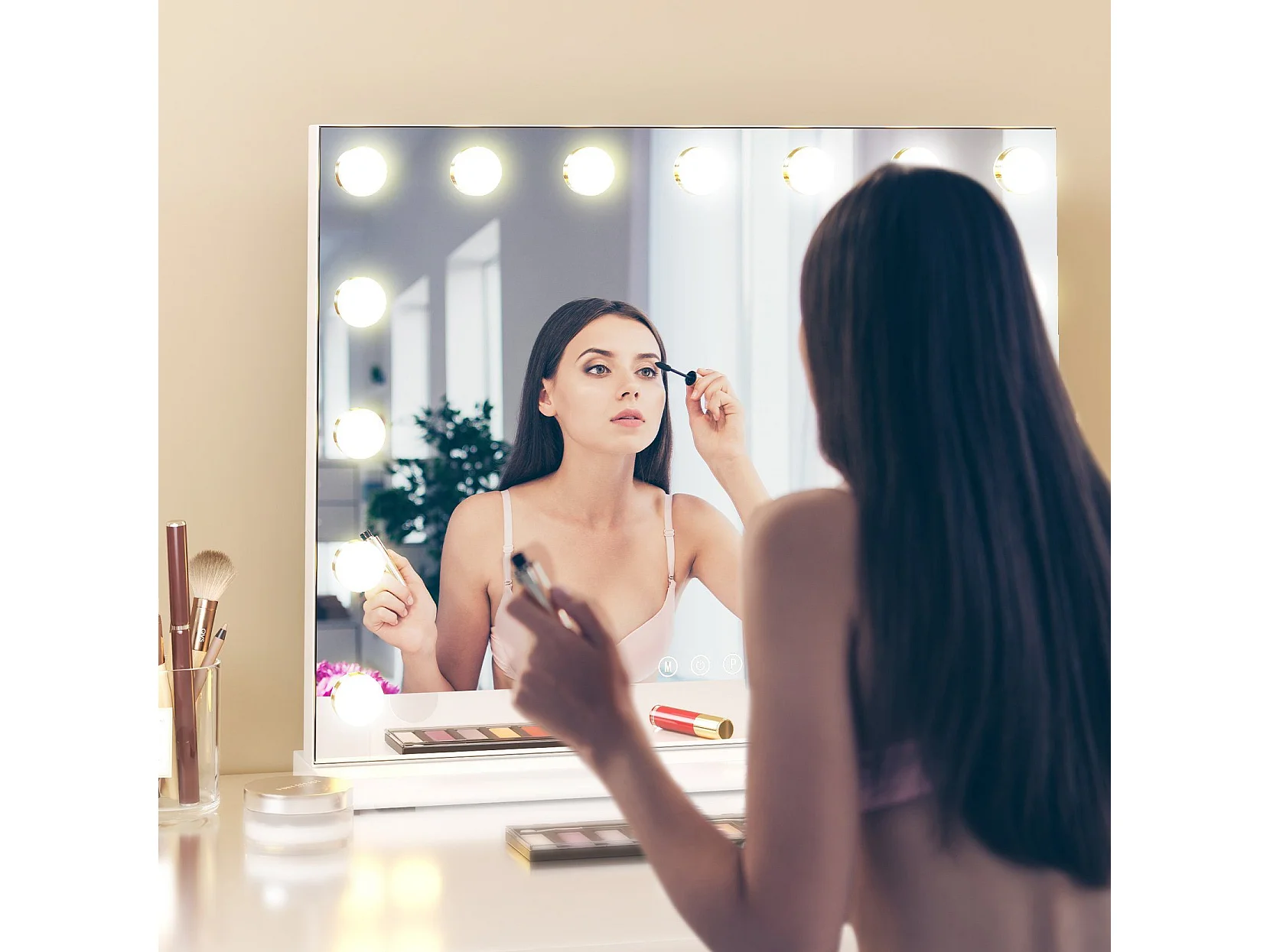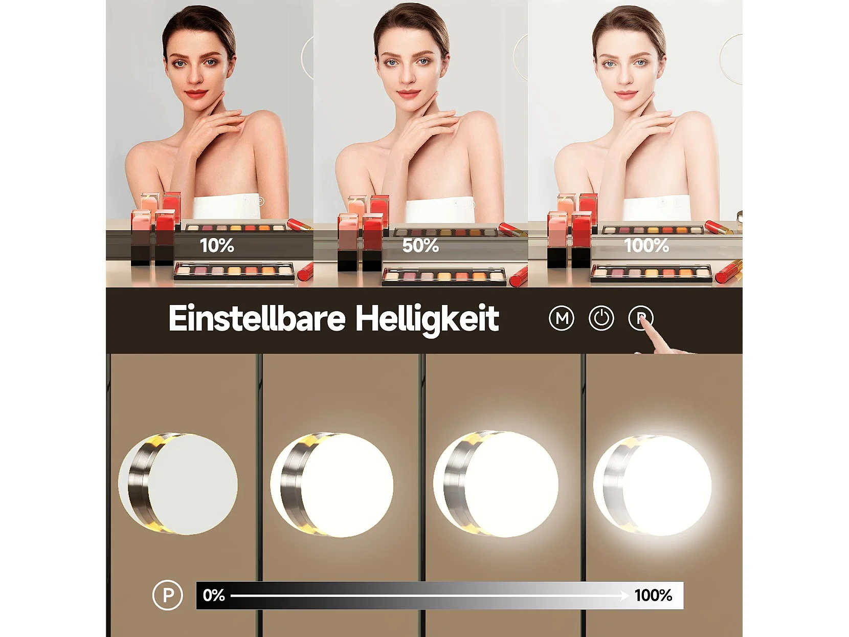 Hollywood 3-Kleuren Schminkspiegel, Cosmetische Spiegel met 14 LEDs, 3000-6000K, met een verwijderbare 10x Vergrotingsspiegel
