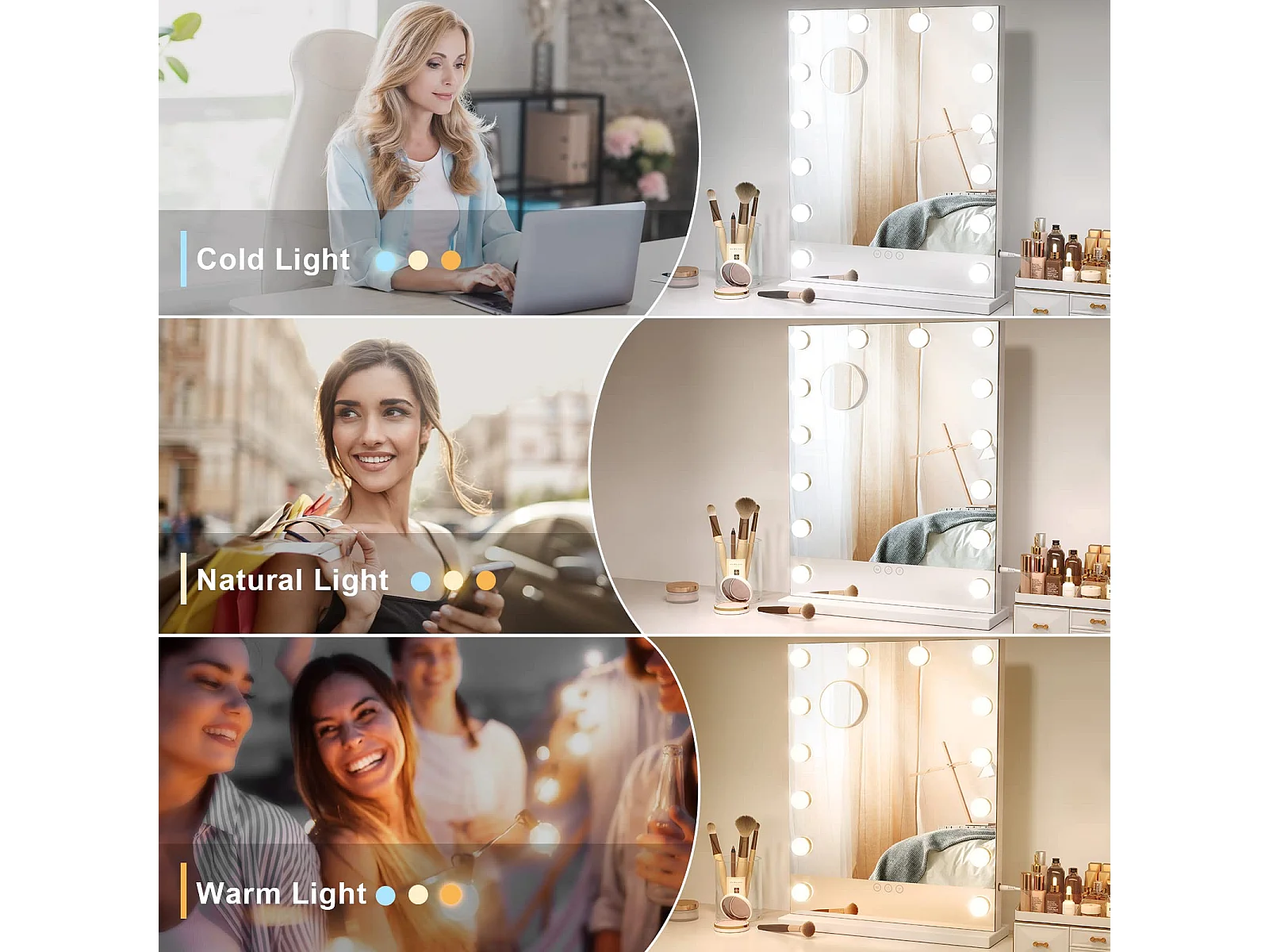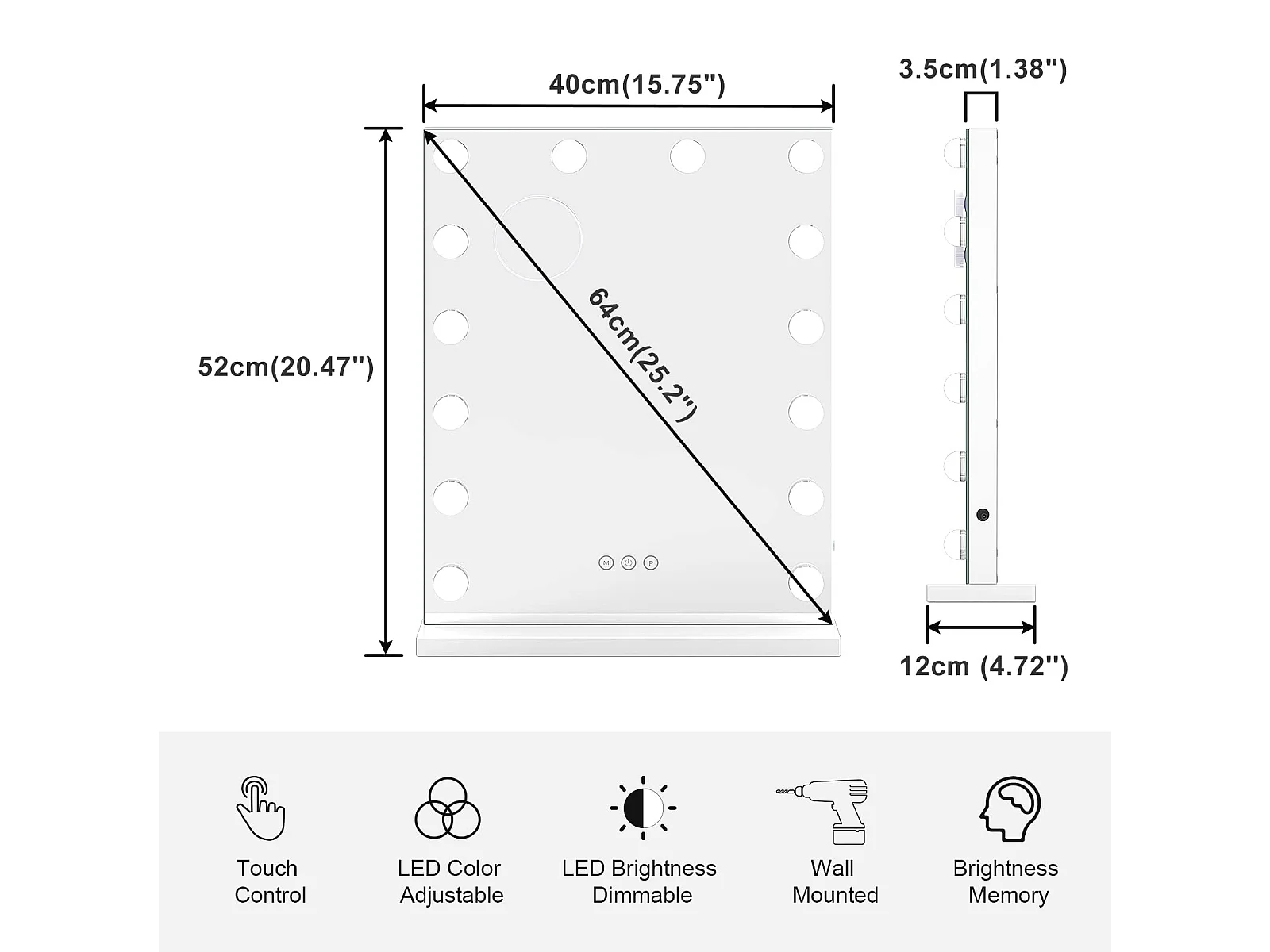 Hollywood make-upspiegel 58x45cm, 15 LED's, 3 Standen, Verstelbare helderheid, Touchbediening, USB-poort, Tafel- of wandmontage, Wit