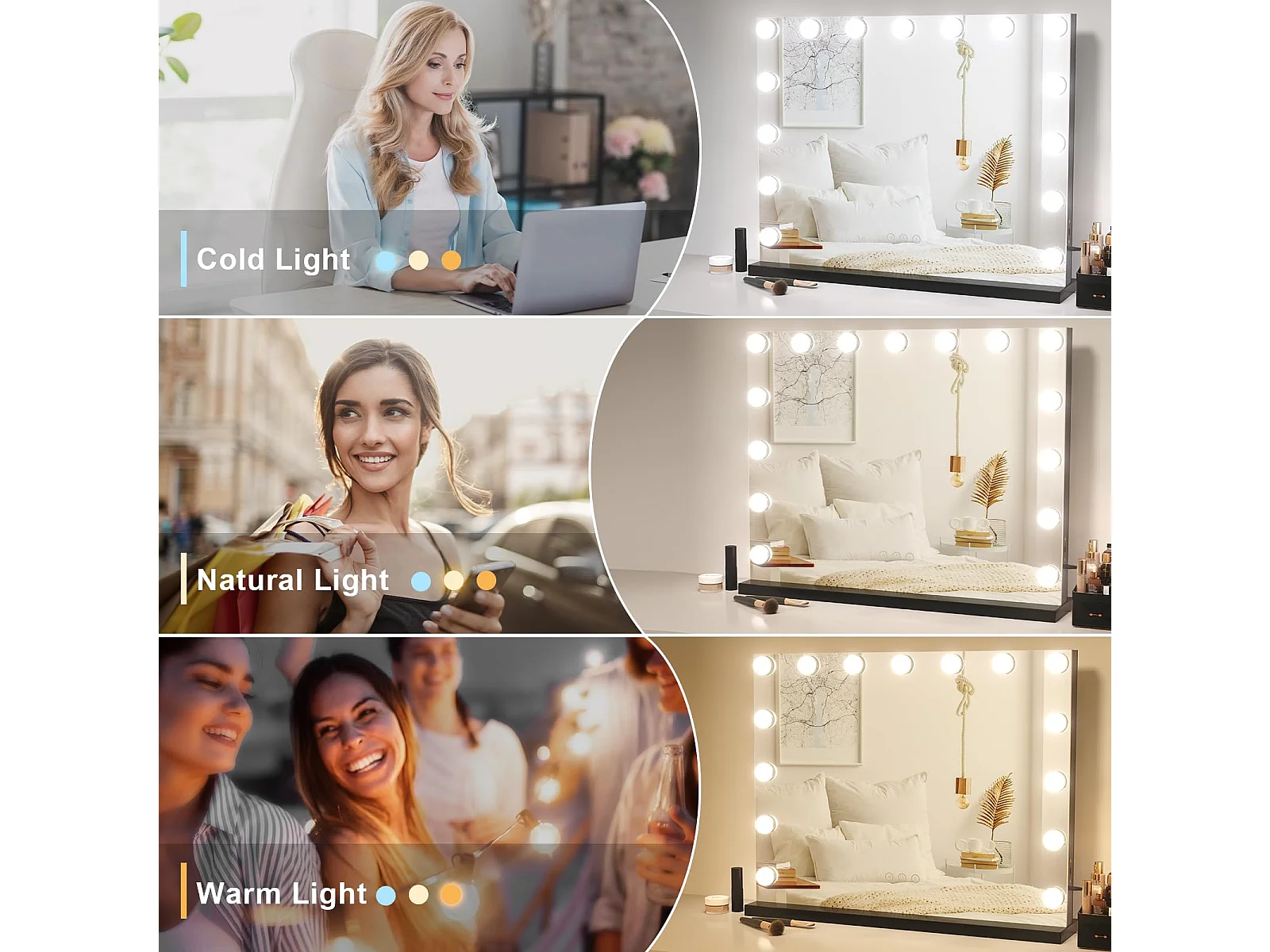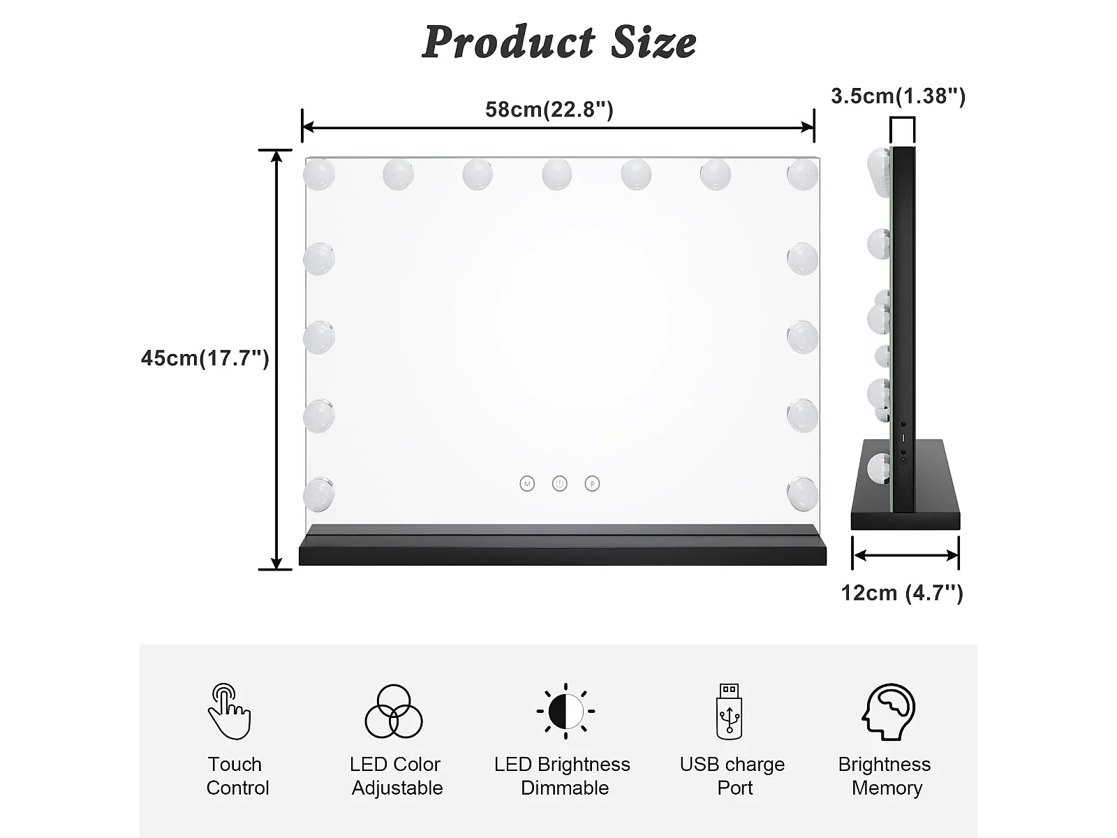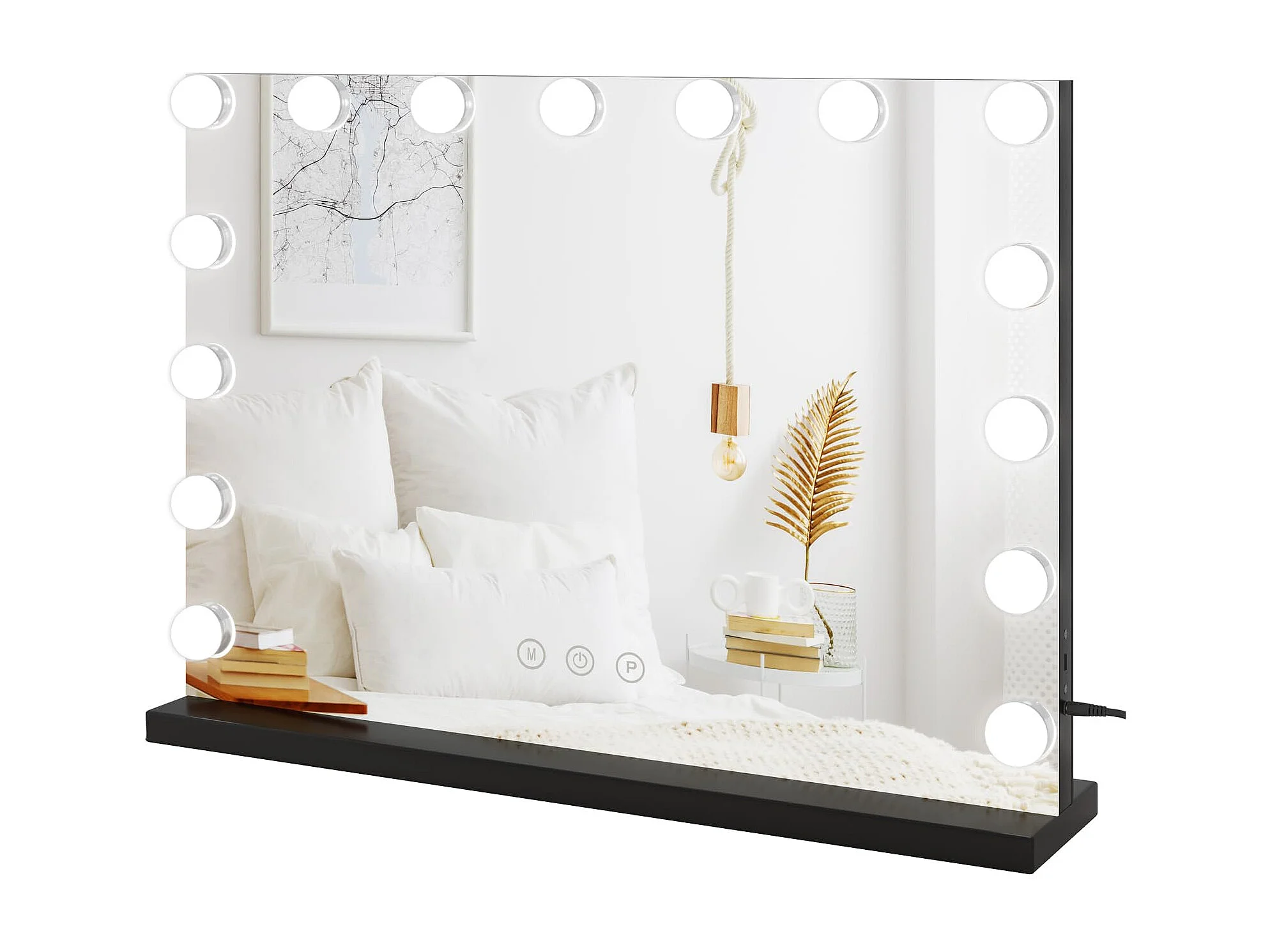 Hollywood make-upspiegel 15 LED's, 58x45cm, 3 standen, Verstelbare helderheid, Touchbediening, USB-poort, Tafel- of wandmontage, Zwart