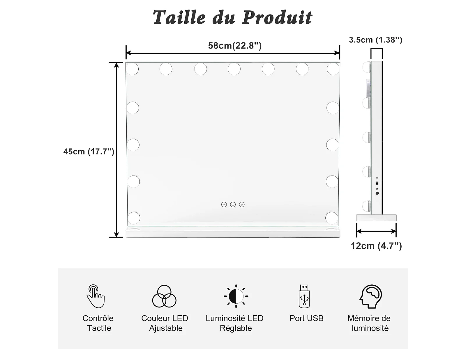Hollywood make-upspiegel 58x45cm, 15 LED's, 3 Standen, Verstelbare helderheid, Touchbediening, USB-poort, Tafel- of wandmontage, Wit